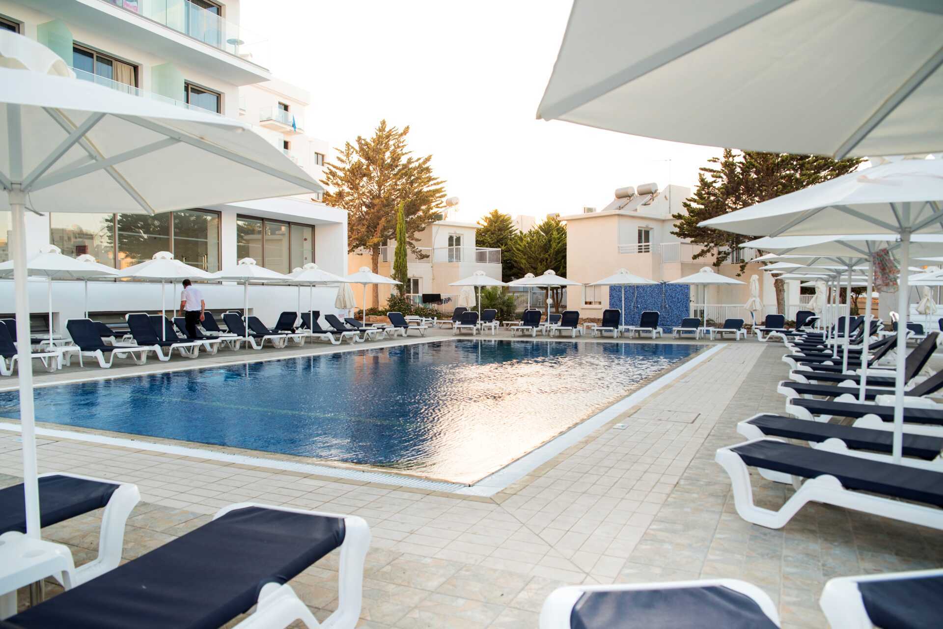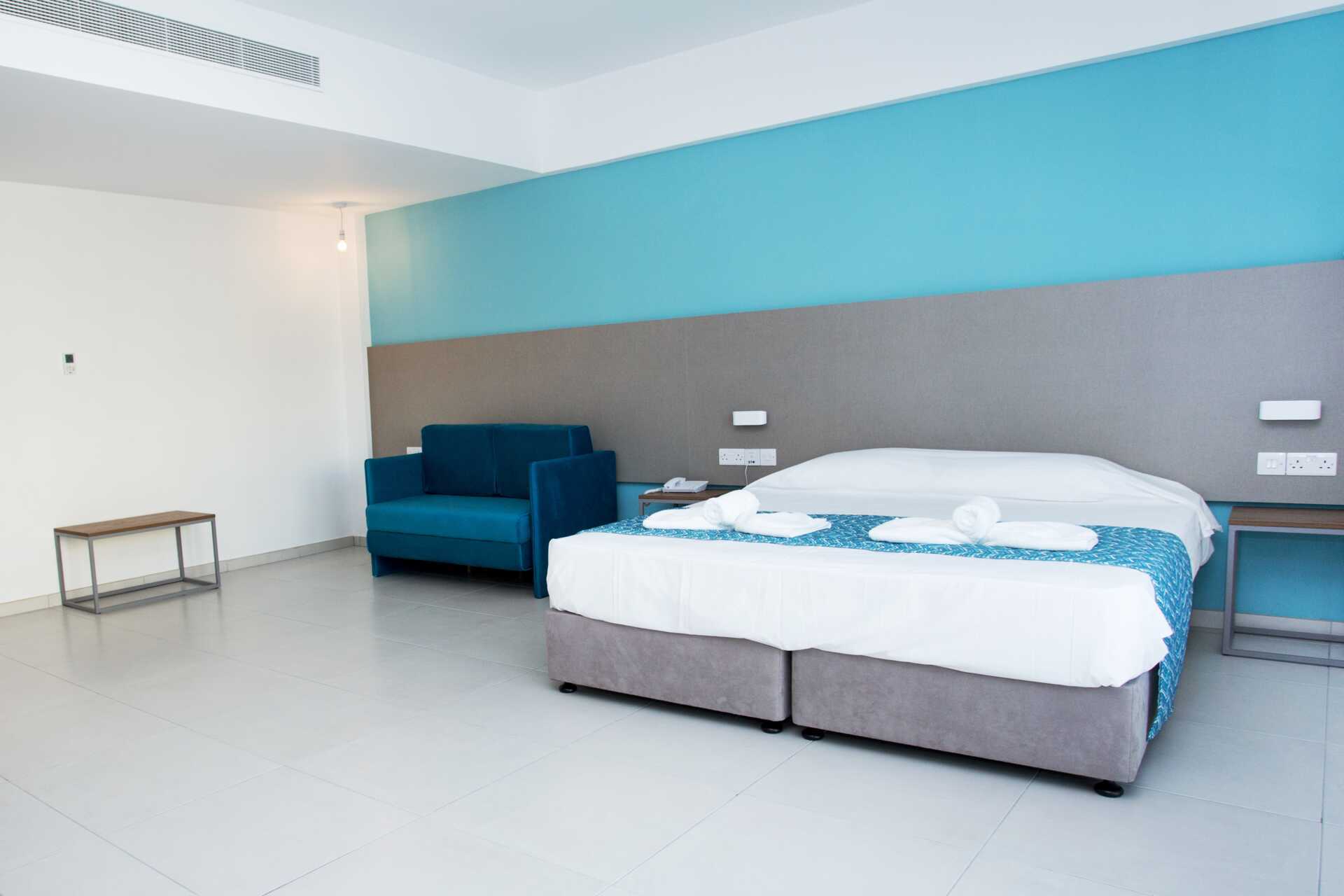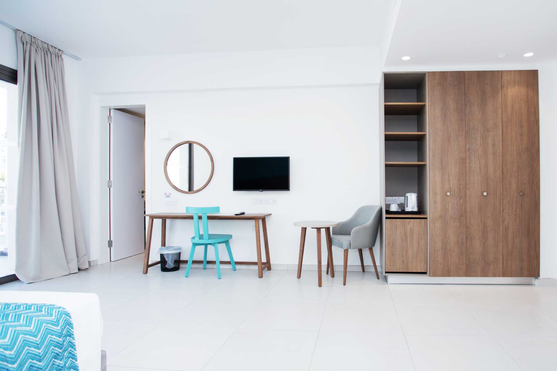 Dubbelrum med balkong, vissa med begränsad havsutsikt eller med havsutsikt. En dubbelsäng eller två enkelsängar. Möjlighet till extrabädd i bäddsoffa. Wifi och luftkonditionering och ingår. Deponering mot avgift. Litet kylskåp. Vattenkokare samt kaffe och te. Tv med internationella kanaler. Badrum med dusch och wc. Städning 7 ggr/vecka.