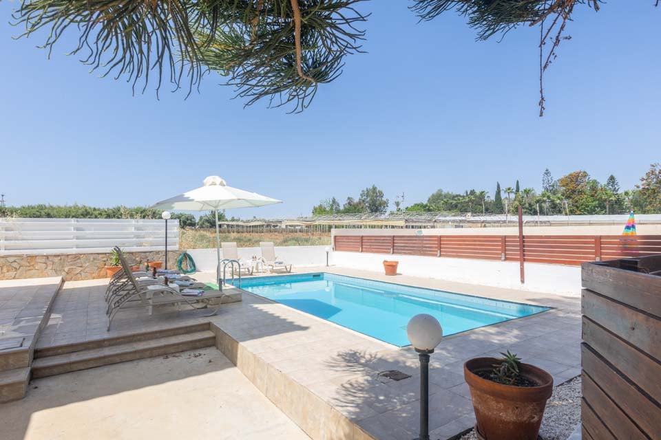Tillbaka i villan hittar du din egen rymliga terrass med en glittrande pool, omgiven av moderna solstolar och med utsikt över lokala fält och vintergröna träd. Det finns en uteservering under en skuggig pergola för mezze-luncher och kvällsgrillfester. Terrassen är perfekt för total avkoppling.