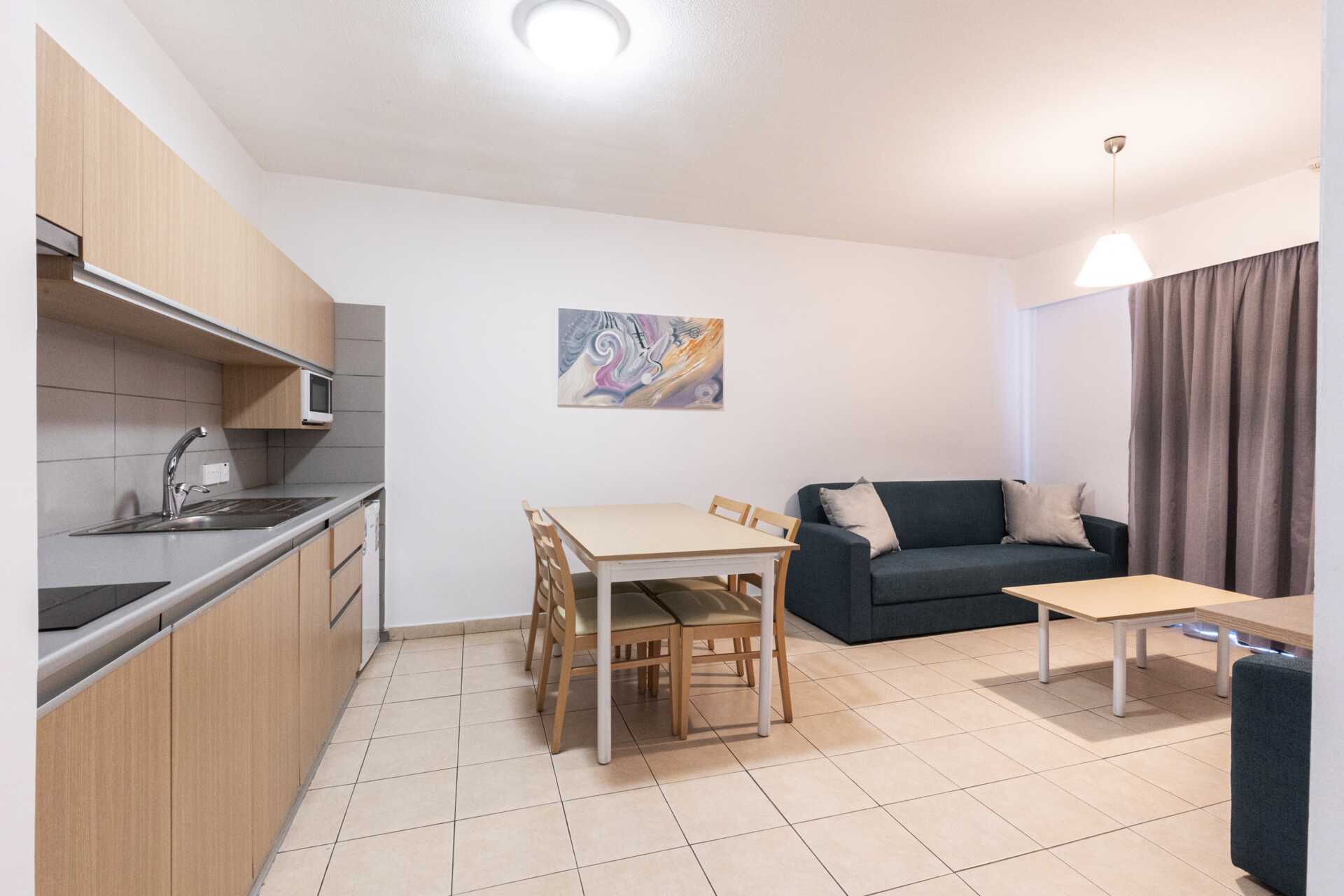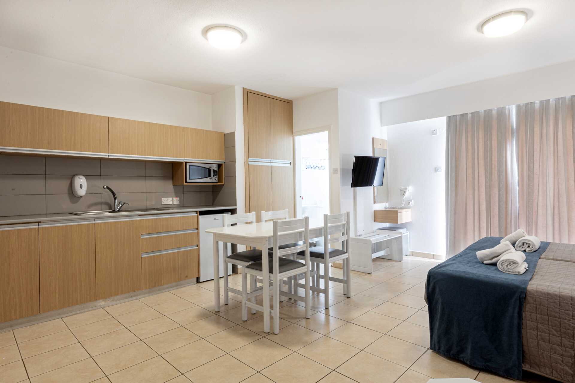 Enrumslägenhet med balkong. Sovrum kombinerat med minikök. En dubbelsäng eller två enkelsängar. Möjlighet till extrabädd i bäddsoffa. Minikök med kokplattor, kylskåp, mikrovågsugn, brödrost, vattenkokare och enkel köksutrustning. Wifi, luftkonditionering och deponering ingår. Tv med internationella kanaler. Hårtork. Badrum med dusch och wc. Städning 7 ggr/vecka. Barn under två år räknas in i maxantalet personer i lägenheten.