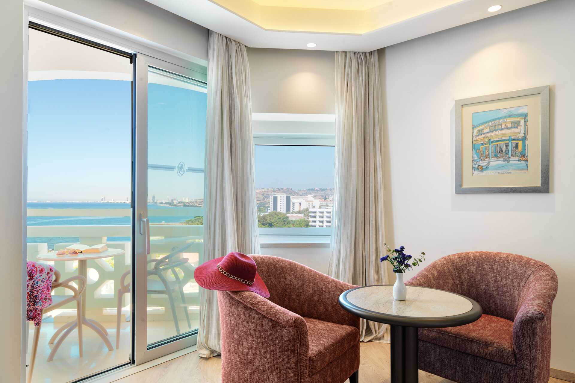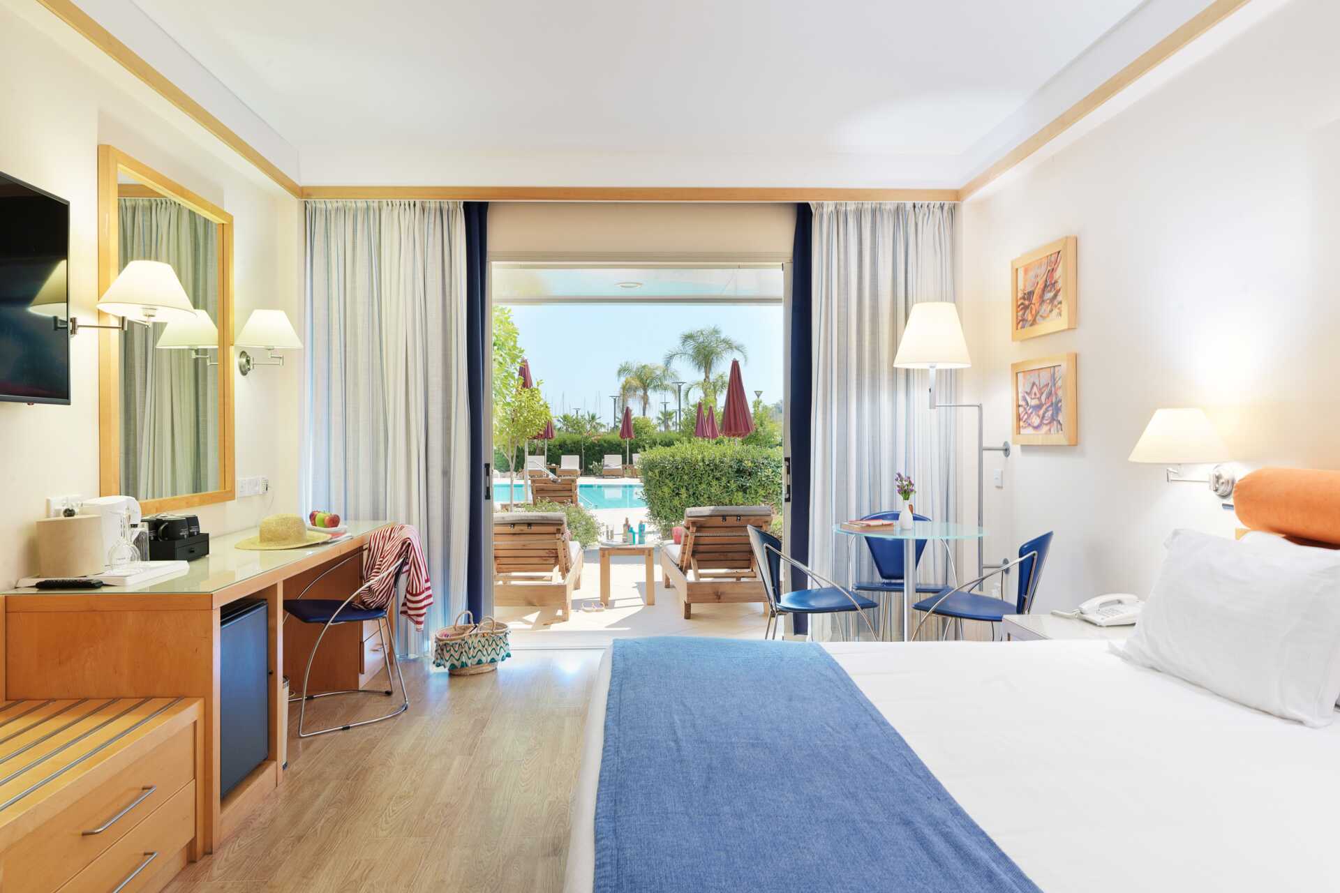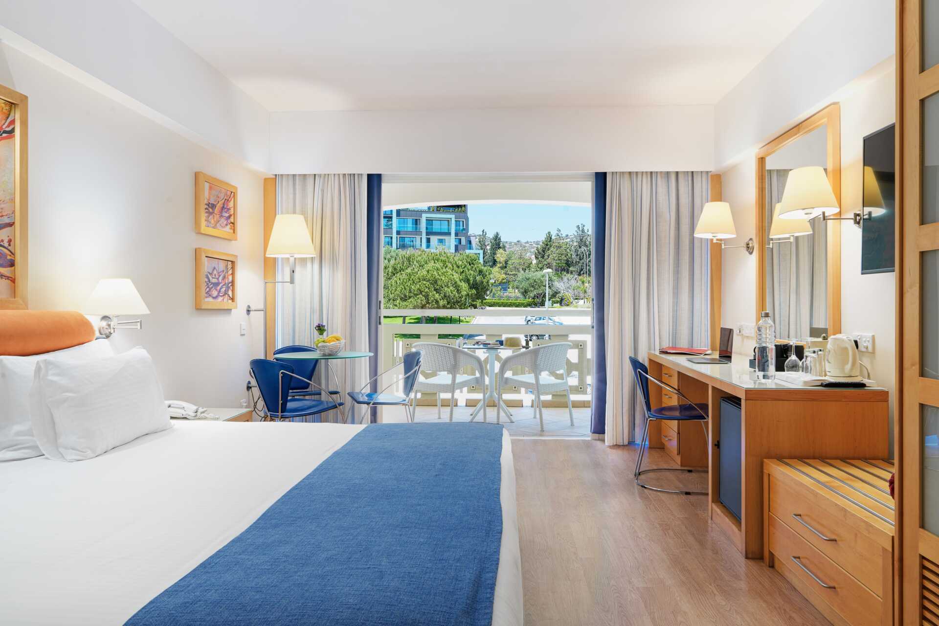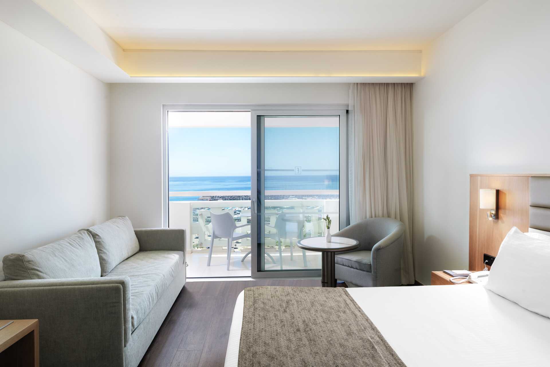 Dubbelrum med balkong, vissa med havsutsikt och några med utsikt mot lagunen. En dubbelsäng eller två enkelsängar. Möjlighet till extrabäddar i bäddsoffa och i våningssäng. Wifi, luftkonditionering och deponering ingår. Minibar mot avgift. Vattenkokare samt kaffe och te. Tv med internationella kanaler. Badrockar och tofflor för två vuxna. Hårtork. Badrum med badkar och wc. Städning 7 ggr/vecka. Barn under två år räknas in i maxantalet personer i rummet.