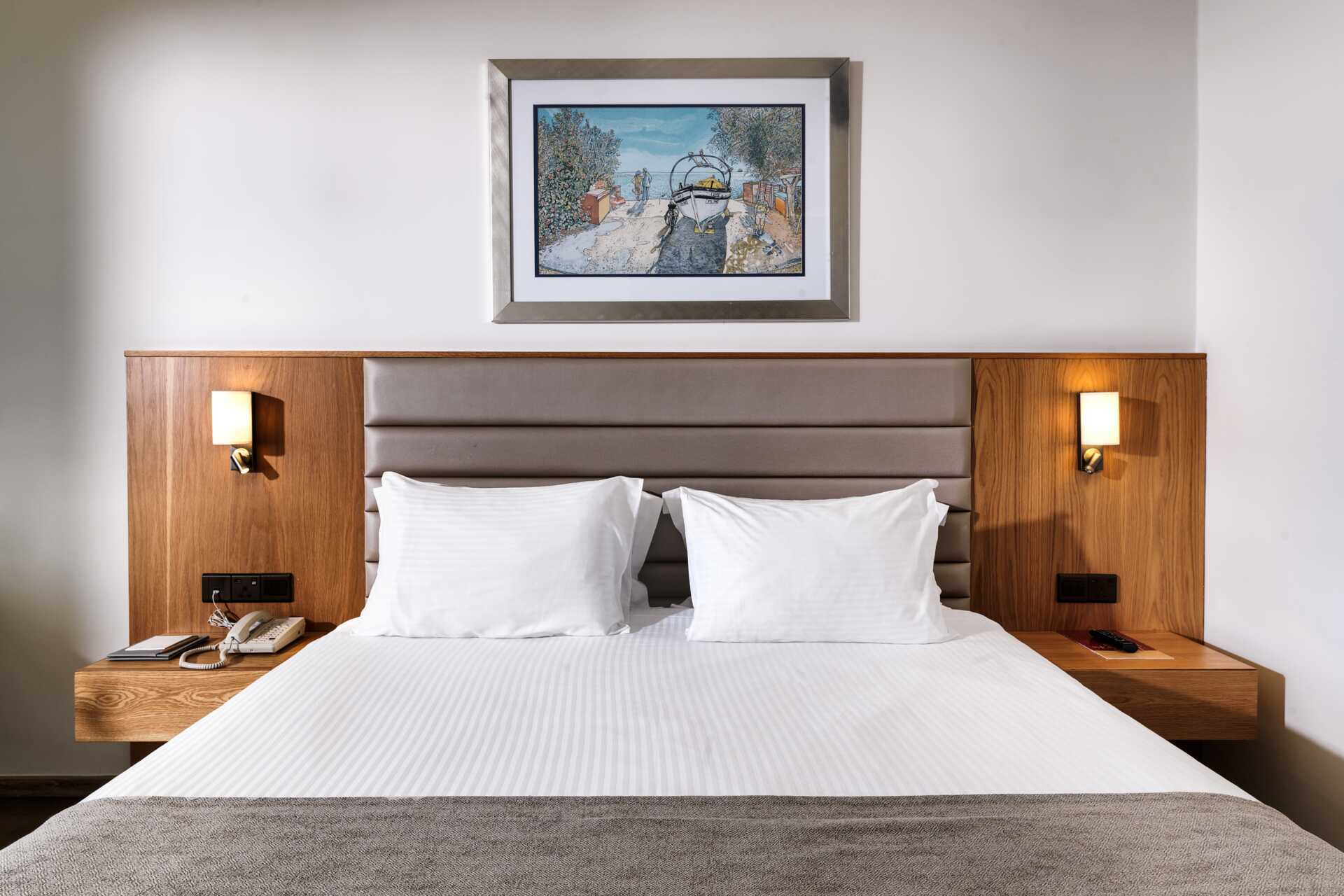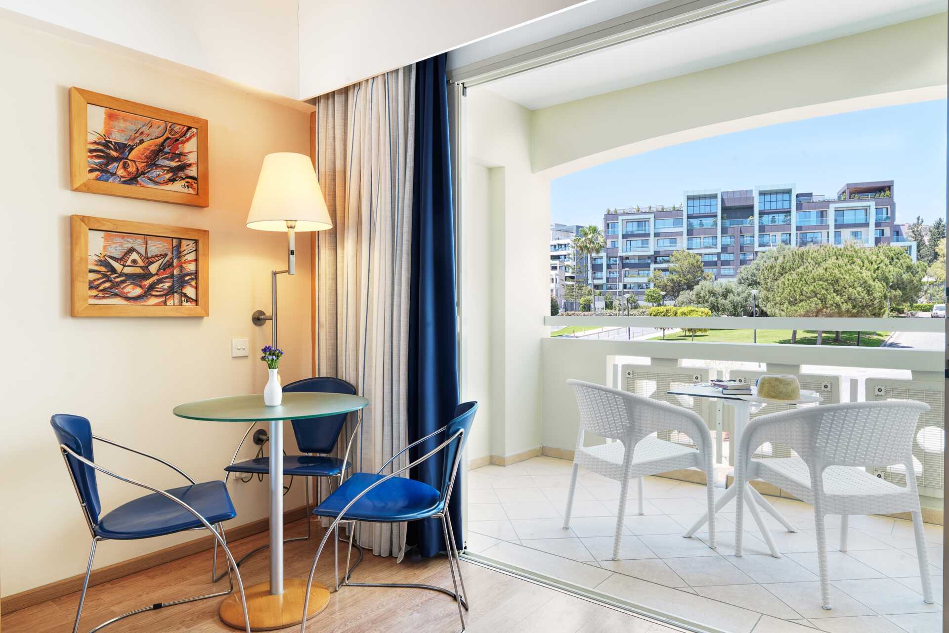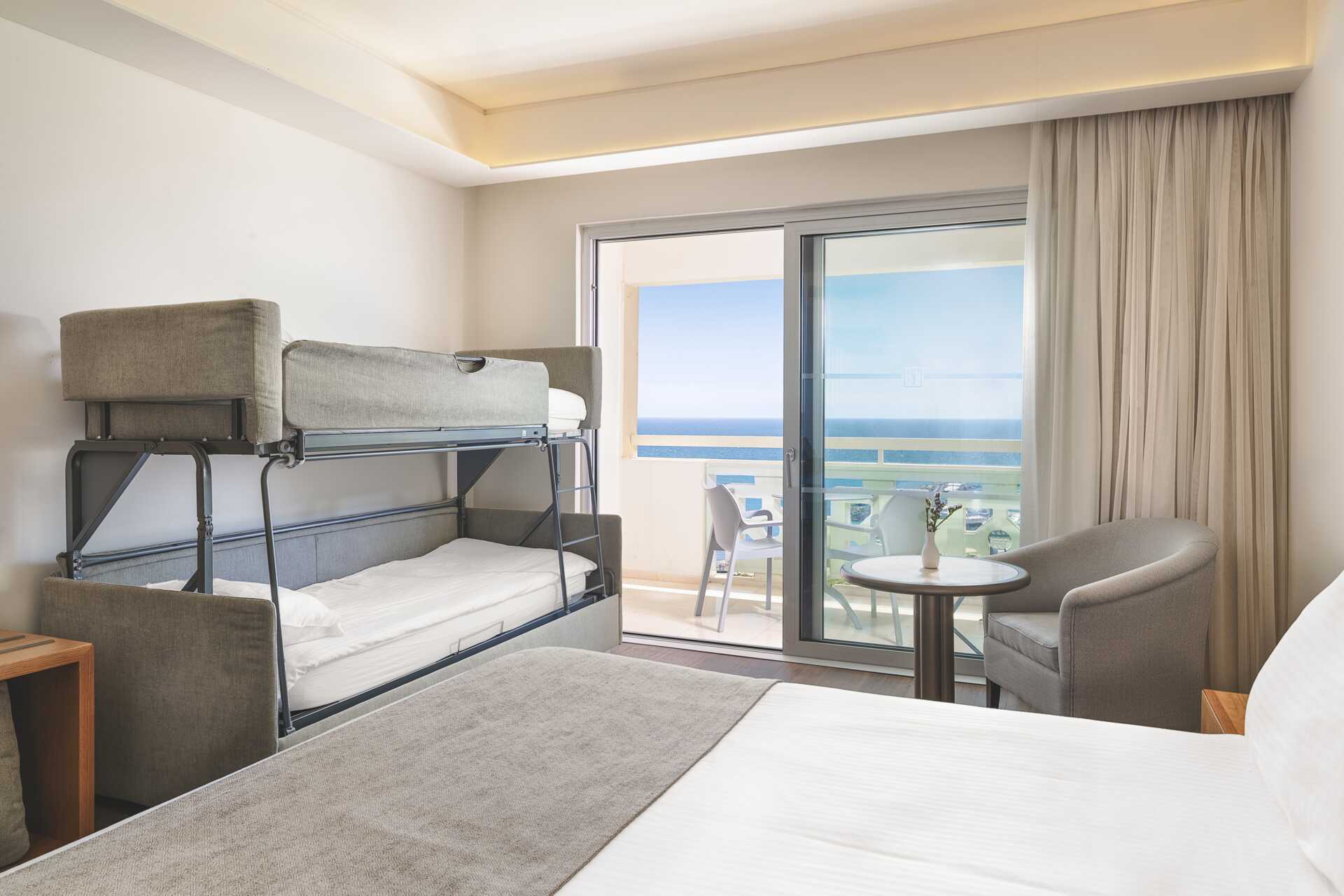 Dubbelrum med balkong, vissa med havsutsikt och några med utsikt mot lagunen. En dubbelsäng eller två enkelsängar. Möjlighet till extrabäddar i bäddsoffa och i våningssäng. Wifi, luftkonditionering och deponering ingår. Minibar mot avgift. Vattenkokare samt kaffe och te. Tv med internationella kanaler. Badrockar och tofflor för två vuxna. Hårtork. Badrum med badkar och wc. Städning 7 ggr/vecka. Barn under två år räknas in i maxantalet personer i rummet.