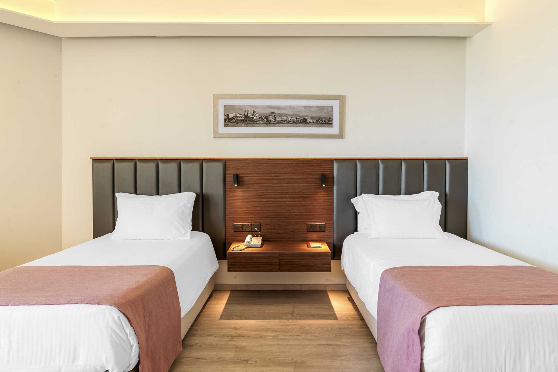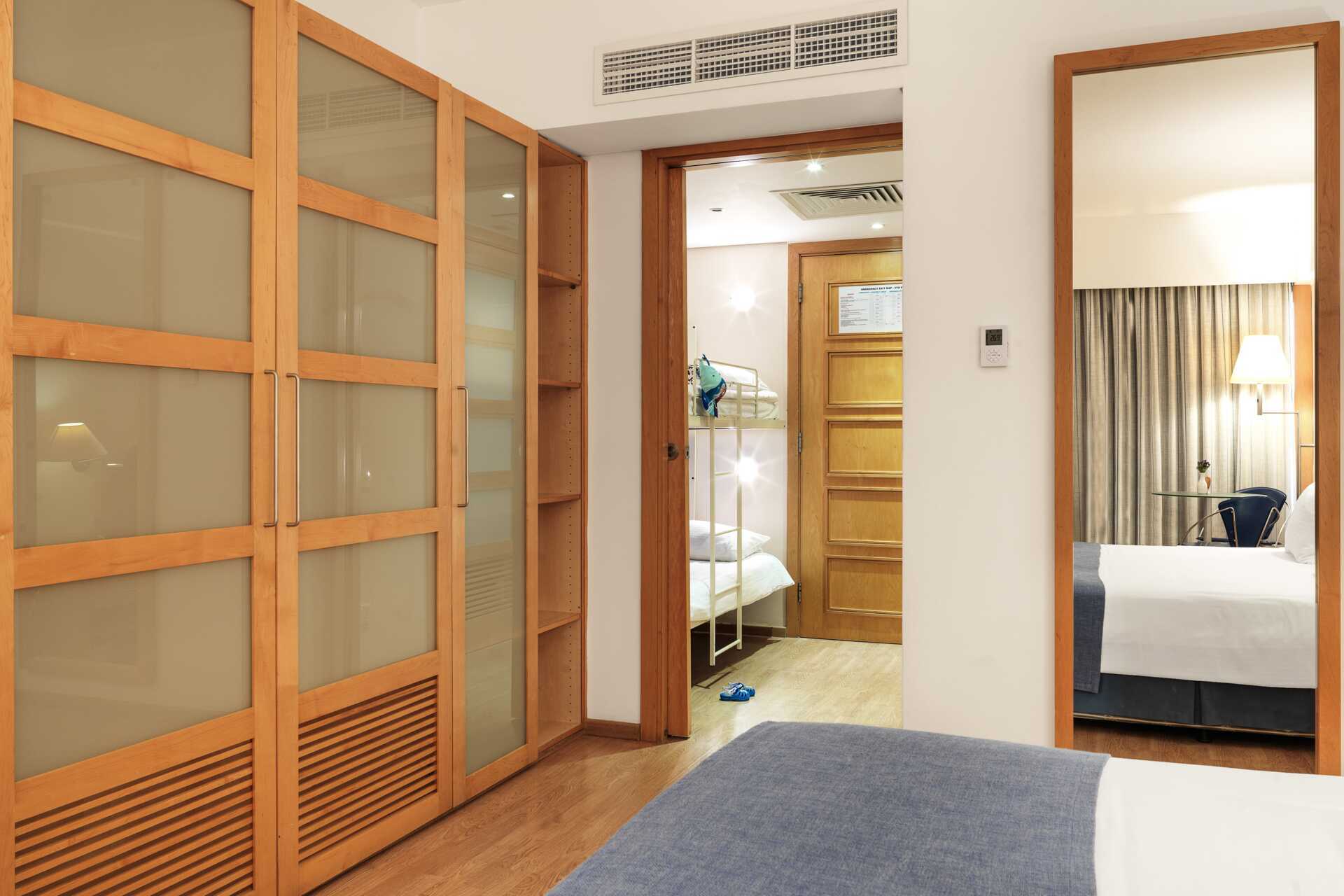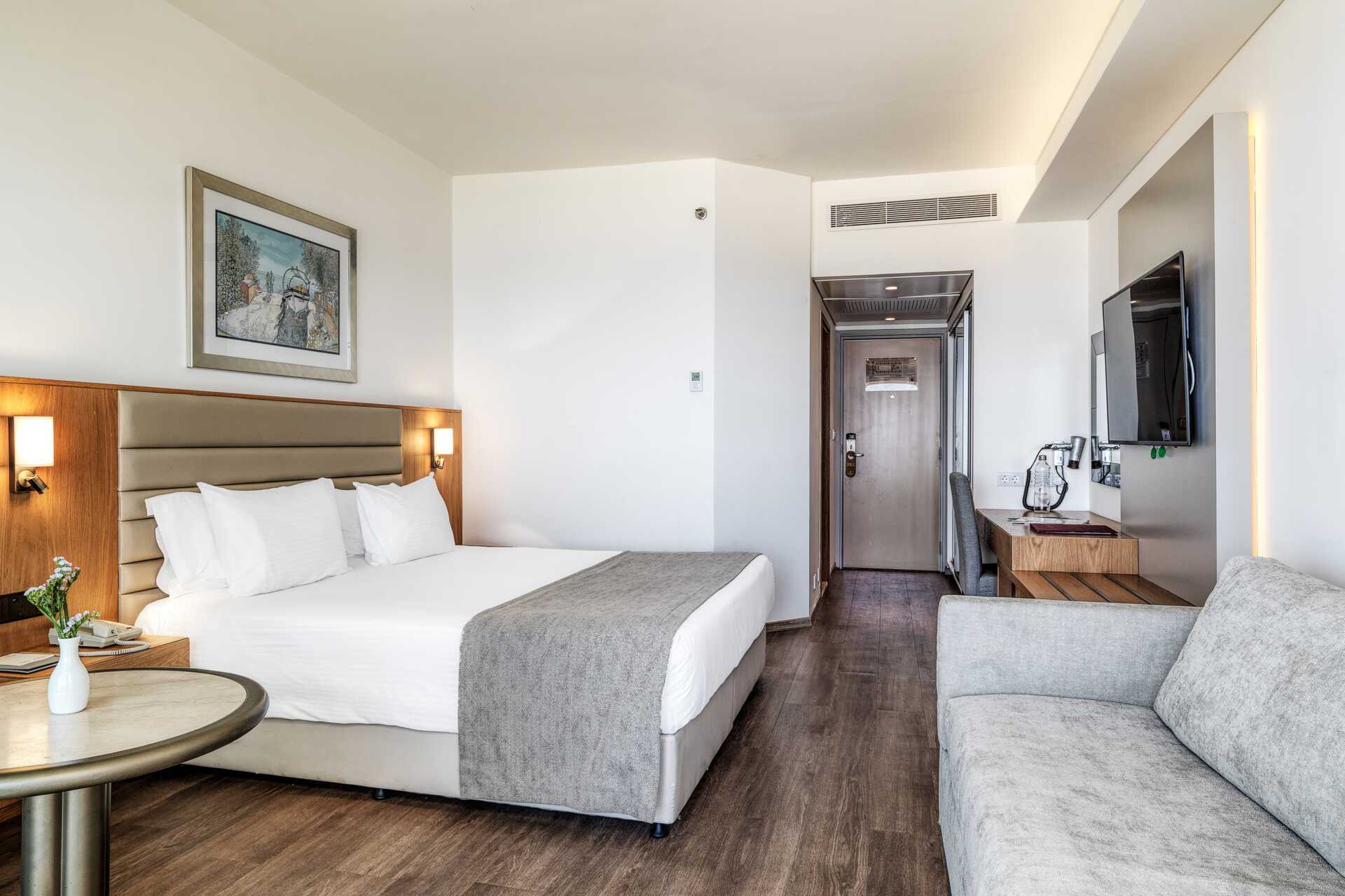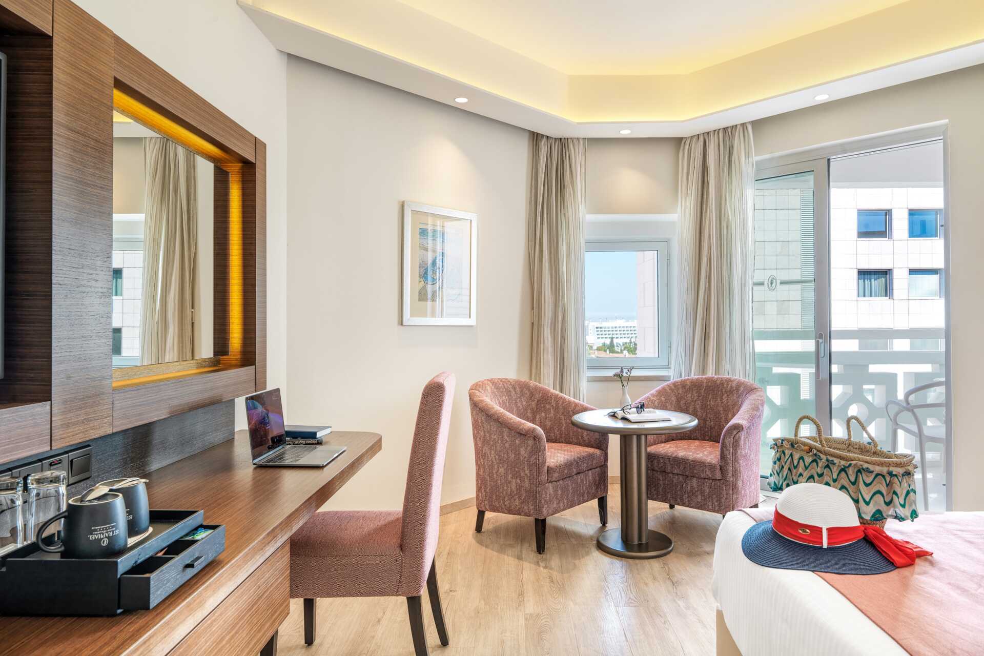 Dubbelrum med balkong, vissa med havsutsikt och några med utsikt mot lagunen. En dubbelsäng eller två enkelsängar. Möjlighet till extrabäddar i bäddsoffa och i våningssäng. Wifi, luftkonditionering och deponering ingår. Minibar mot avgift. Vattenkokare samt kaffe och te. Tv med internationella kanaler. Badrockar och tofflor för två vuxna. Hårtork. Badrum med badkar och wc. Städning 7 ggr/vecka. Barn under två år räknas in i maxantalet personer i rummet.