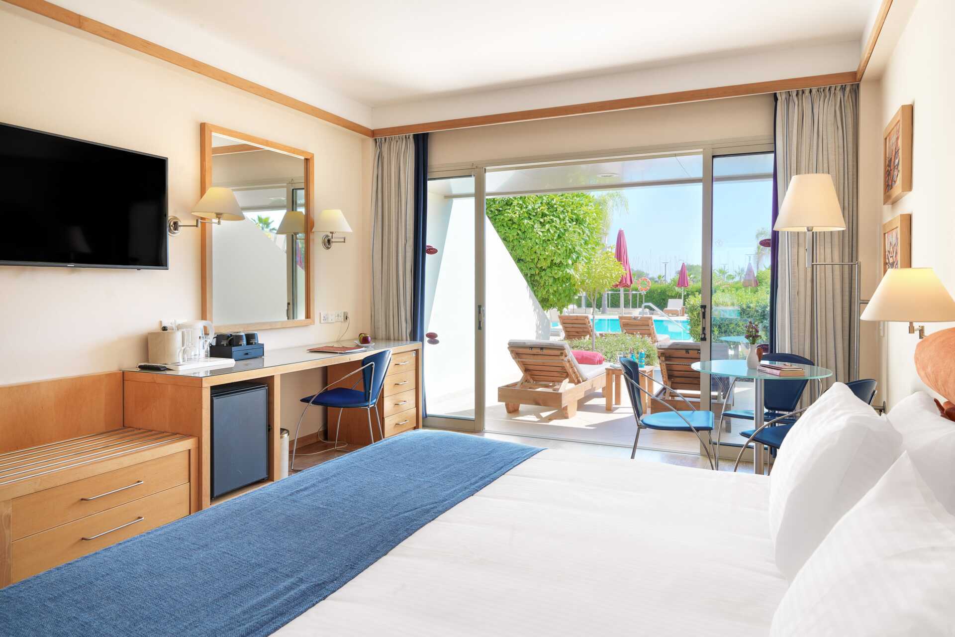 Executiverum med balkong, vissa med utsikt mot lagunen eller med markterrass och poolutsikt. Rummen med markterrass har två solstolar på terrassen. En dubbelsäng. Möjlighet till extrabäddar i våningssäng i en sovalkov med skjutdörr. Wifi, luftkonditionering och deponering ingår. Minibar mot avgift. Vattenkokare samt kaffe och te. Tv med internationella kanaler. Badrockar och tofflor till två vuxna. Hårtork. Badrum med badkar och wc. Städning 7 ggr/vecka. Barn under två år räknas in i maxantalet personer i rummet.