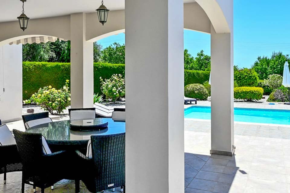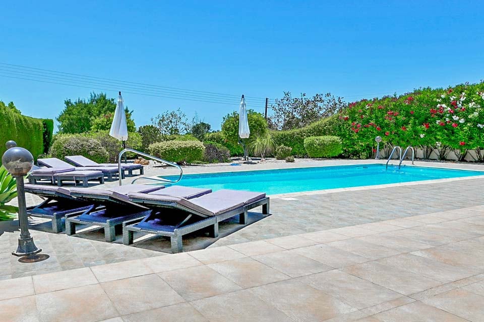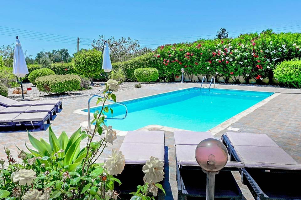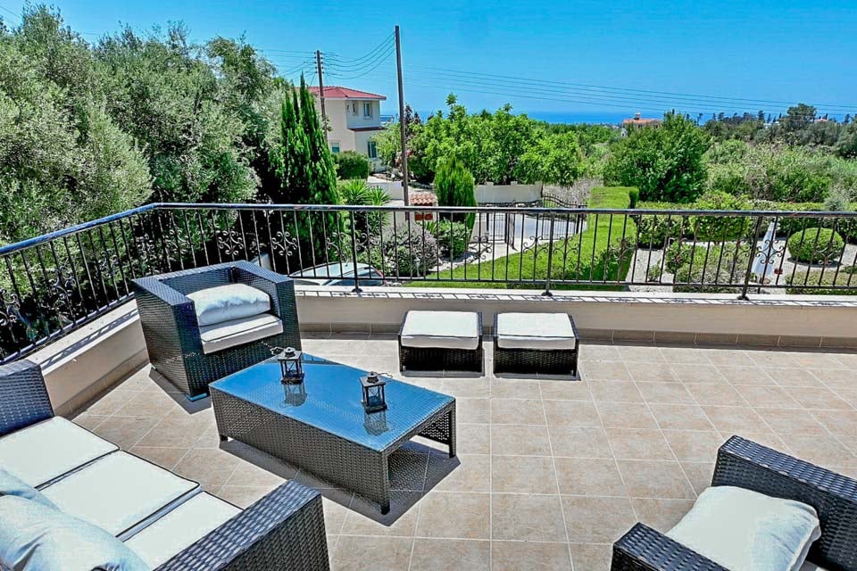 Terrassen är utan tvekan där du kommer att tillbringa större delen av din tid, och njuta av solen vid din alldeles egna privata pool. Med upp till 340 soldagar per år är Cypern det ultimata semestermålet. Från sovrummet på första våningen kan du bekvämt beundra den avlägsna panoramautsikten över havet, medan du sjunker ner i en av trädgårdssofforna och njuter av kvällen som lider mot sitt slut. För kvällsgrillfester hittar du en liten bärbar grill, perfekt för att grilla några läckra godsaker med vänner och familj.