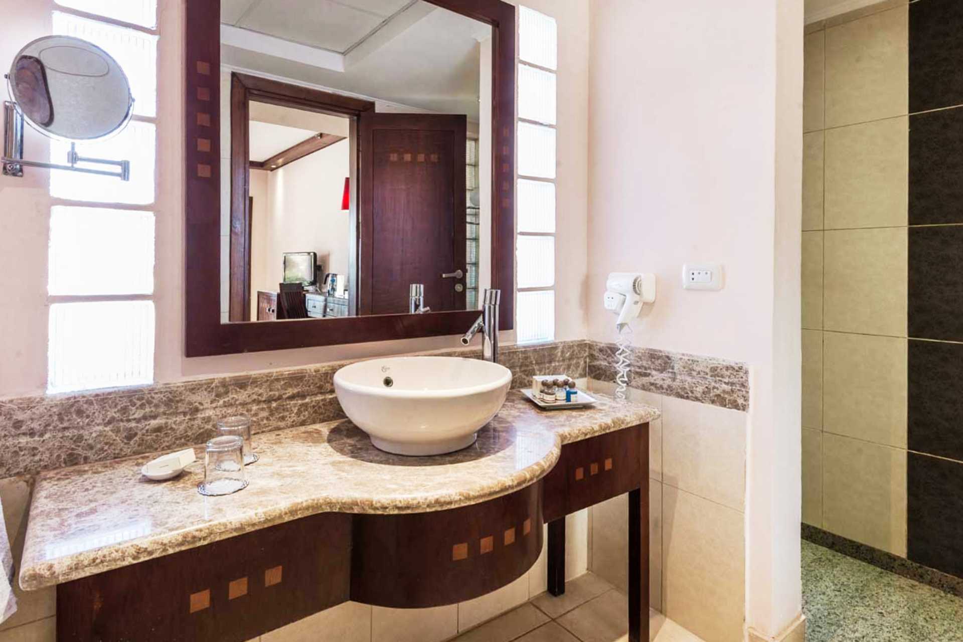 Dubbelrum med markterrass och begränsad havsutsikt. En dubbelsäng eller två enkelsängar. Wifi, luftkonditionering och deponering ingår. Minibar ingår med alkoholfria drycker som fylls på dagligen. Vattenkokare samt kaffe och te. Tv med internationella kanaler. Badrockar och tofflor. Hårtork. Badkar med dusch och wc. Städning 7 ggr/vecka.