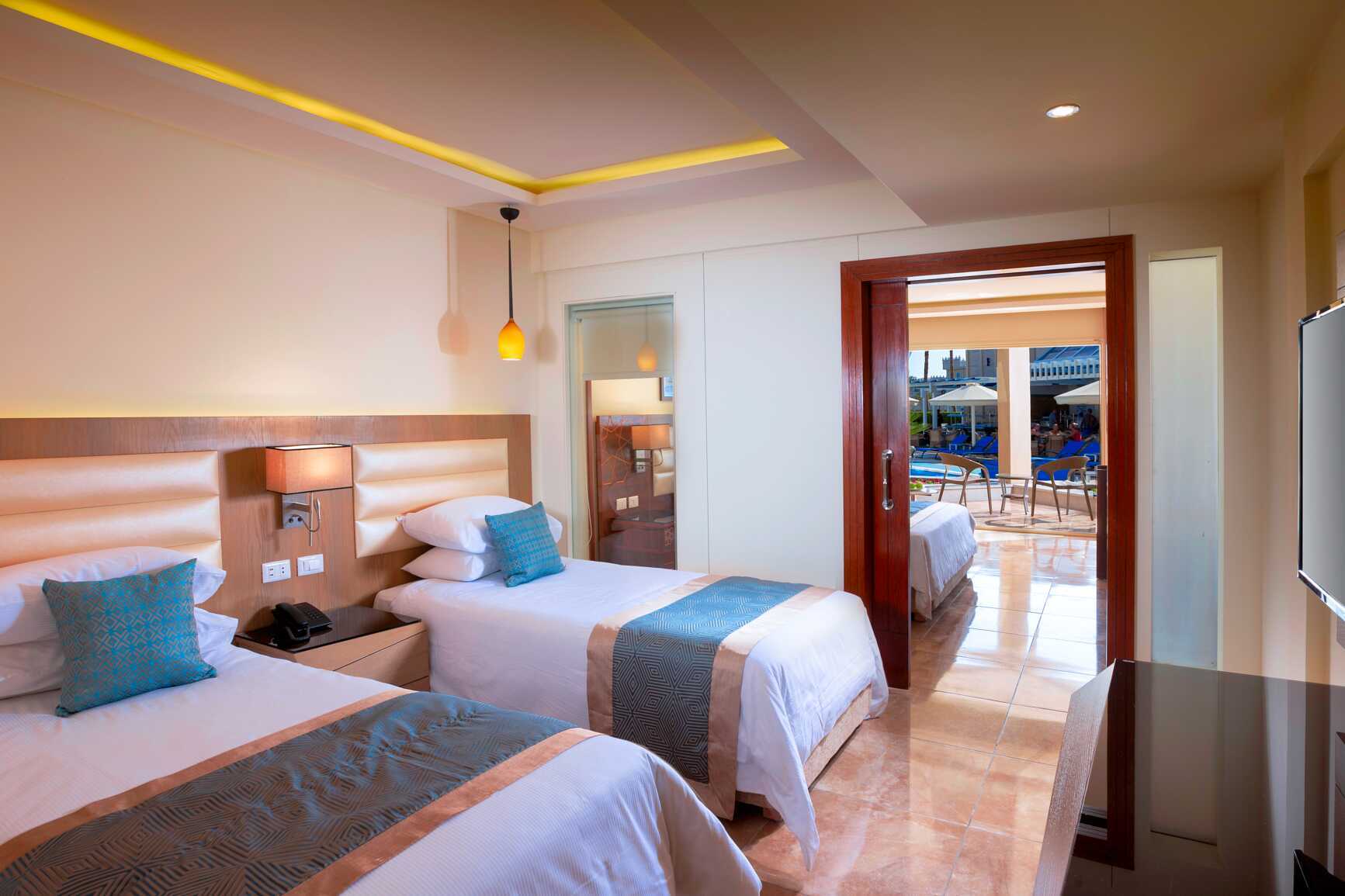 Juniorsvit med balkong eller markterrass. Två sovrum med en skjutdörr mellan rummen. En dubbelsäng och två enkelsängar. Extrabädd möjlig i hopfällbar säng eller extrasäng. Minibar som dagligen fylls på med en flaska vatten per person. Vattenkokare samt kaffe och te. Wifi, luftkonditionering och deponering ingår. Tv med Internationella kanaler. Hårtork. Badrum med dusch och wc. Städning 7 ggr/vecka.