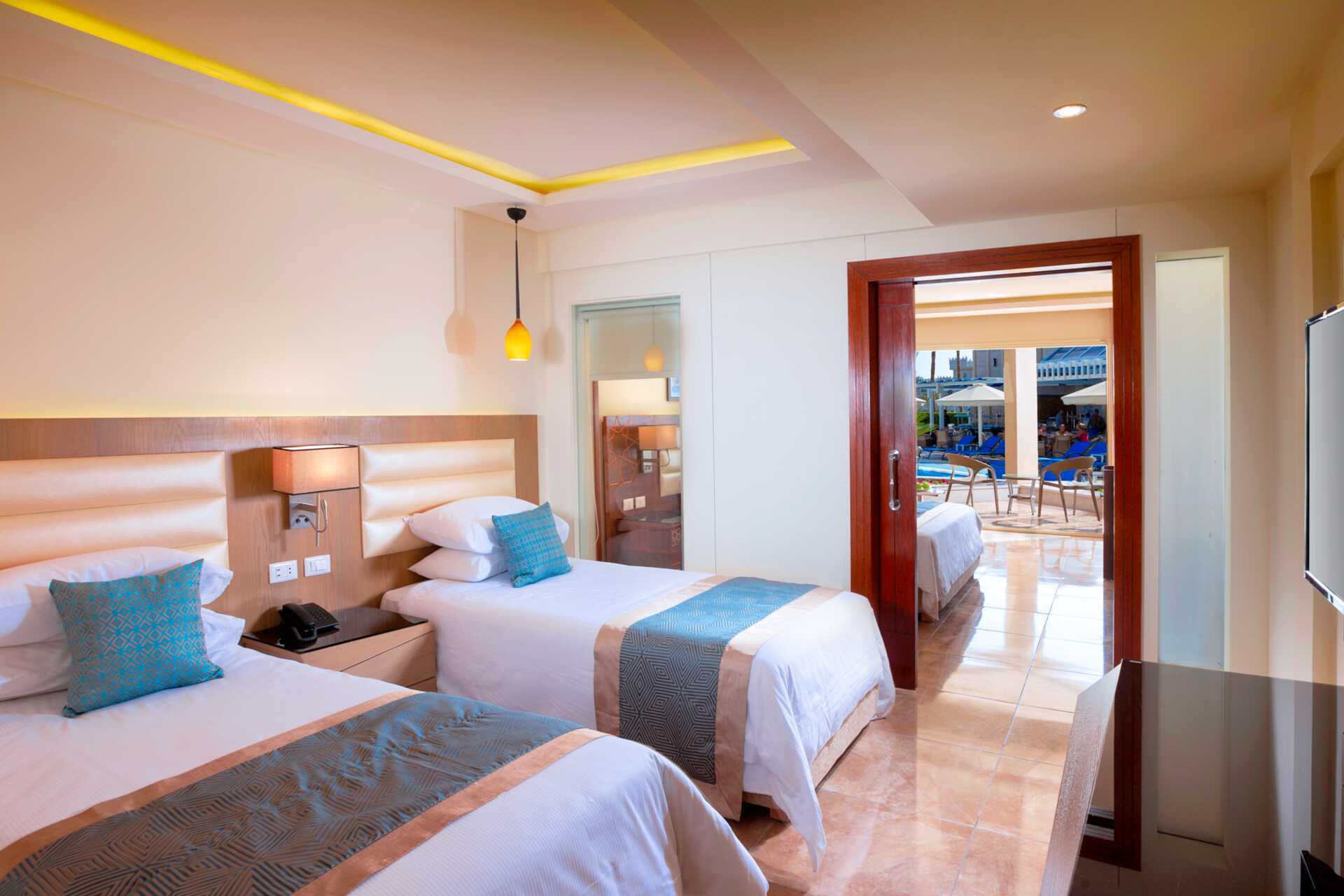 Familjerum med balkong, vissa med poolutsikt. Familjerummet består av två sovrum med skjutdörr mellan sovrummen En dubbelsäng. Möjlighet till extrabäddar i en enkelsäng och i en dubbelsäng. Minibar som dagligen fylls på med en flaska vatten per person. Vattenkokare samt kaffe och te. Wifi, luftkonditionering och deponering ingår. Tv med Internationella kanaler. Hårtork. Badrum med dusch och wc. Städning 7 ggr/vecka.