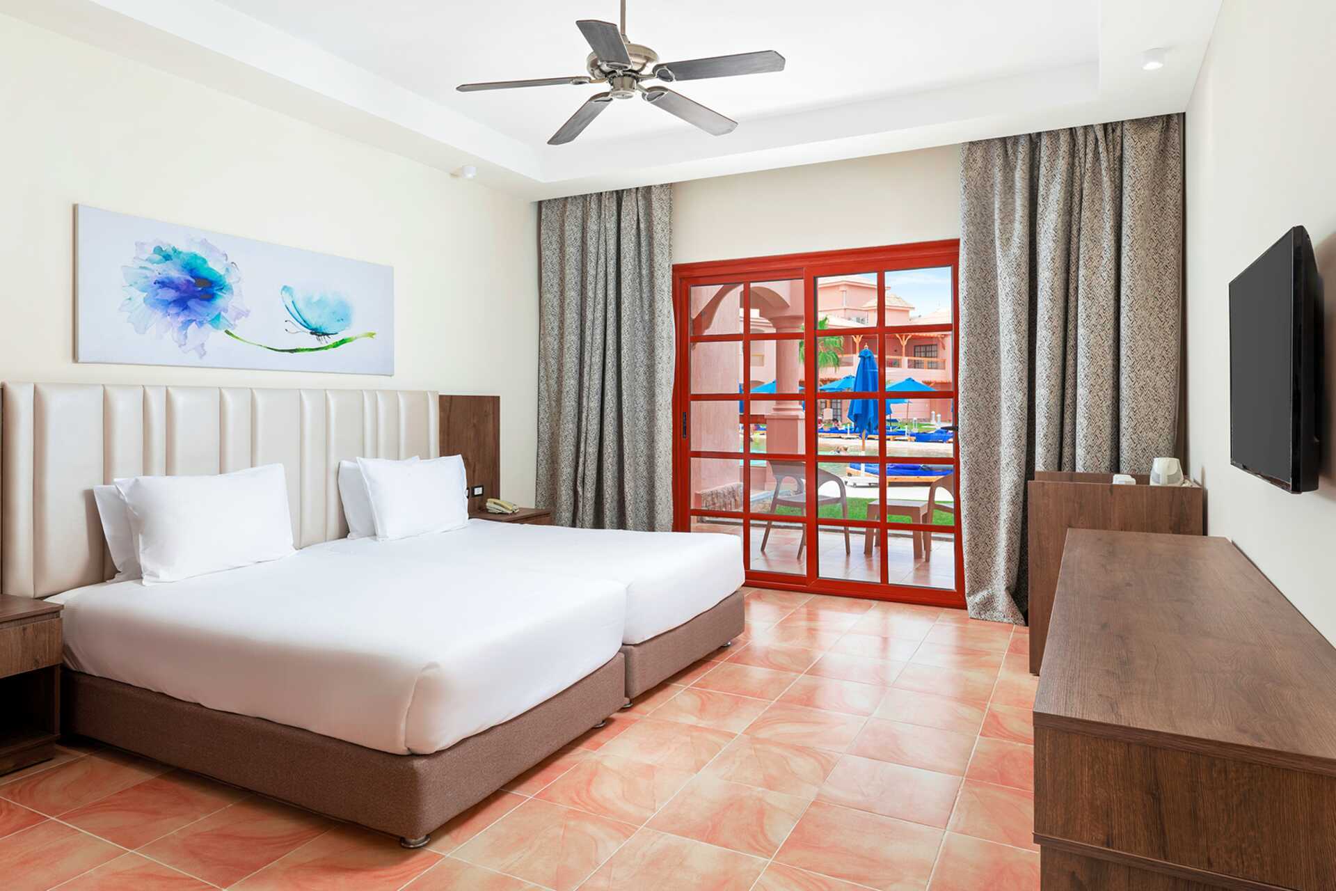 Dubbelrum med balkong eller terrass och poolutsikt. En dubbelsäng eller två enkelsängar. Möjlighet till extrabäddar i hopfällbar säng. Wifi, luftkonditionering och deponering ingår. Kylskåp med en alkoholfri dryck vid ankomst. Vattenkokare samt kaffe och te. Tv med internationella kanaler. Hårtork. Badrum med dusch och wc. Städning 7 ggr/vecka.