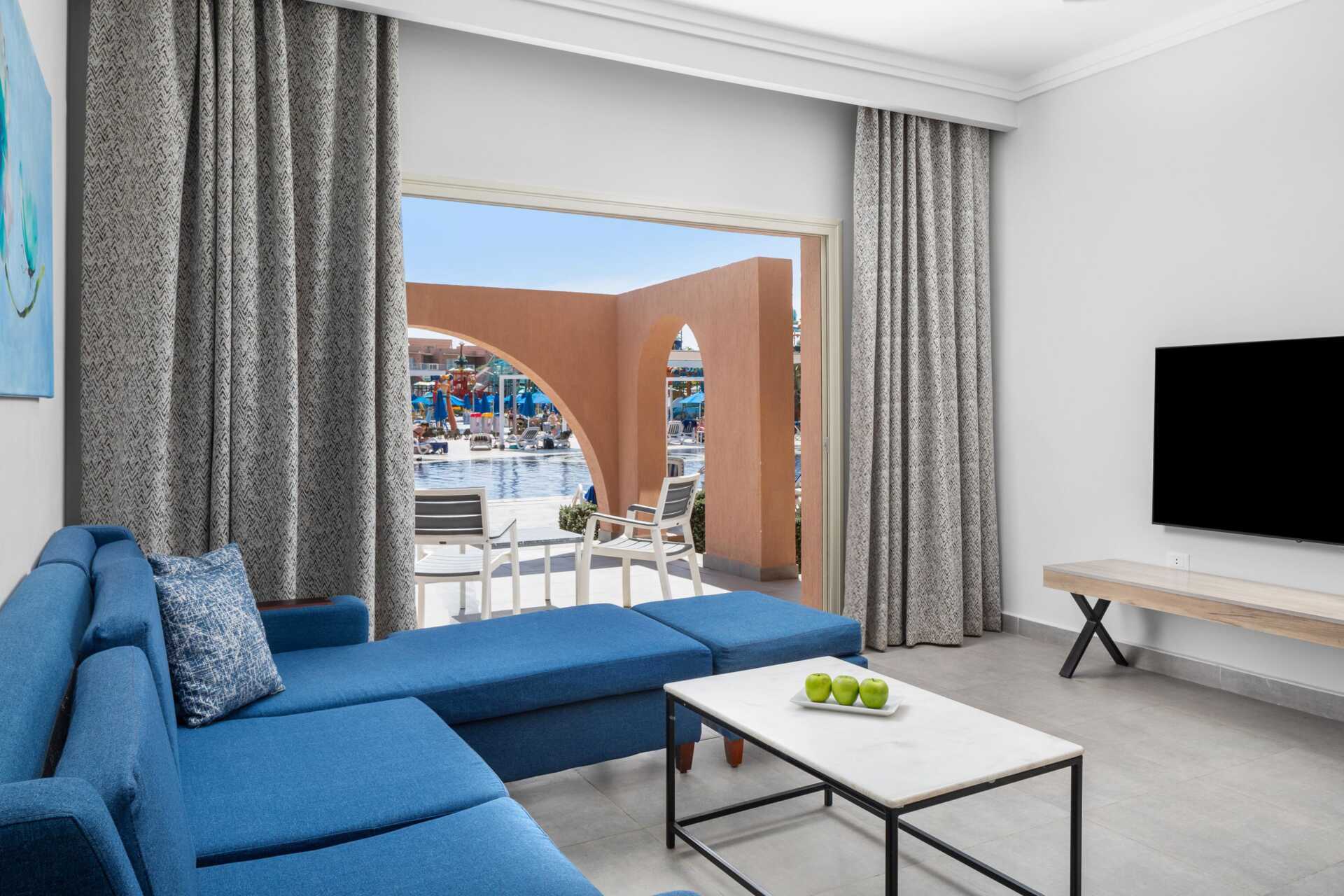 Servicenivån är toppen. Har inte sett kvinnor städa rummen (menar att de har ett mer kritiskt öga när det gäller städningen). Lekplatsen är mycket väl organiserad. Bra mat - är man duktig äter man inte samma sak varje dag och det finns mycket att välja på. Det verkar som att de inte har kontroll över två saker: de som säljer paket (safari, Luxor osv.) och taxibranschen vid receptionsområdet. Vad menar jag med det: de som säljer paket är ute för att tjäna pengar men också för att slösa bort människors tid - föråldrade bilar, ATV och utnyttjande av beduiner är inte bra. När det gäller taxi tycker jag att hotellet kan ställa krav på god engelska och att man blir skjutsad dit man beställer, inte ut i ödemarken.