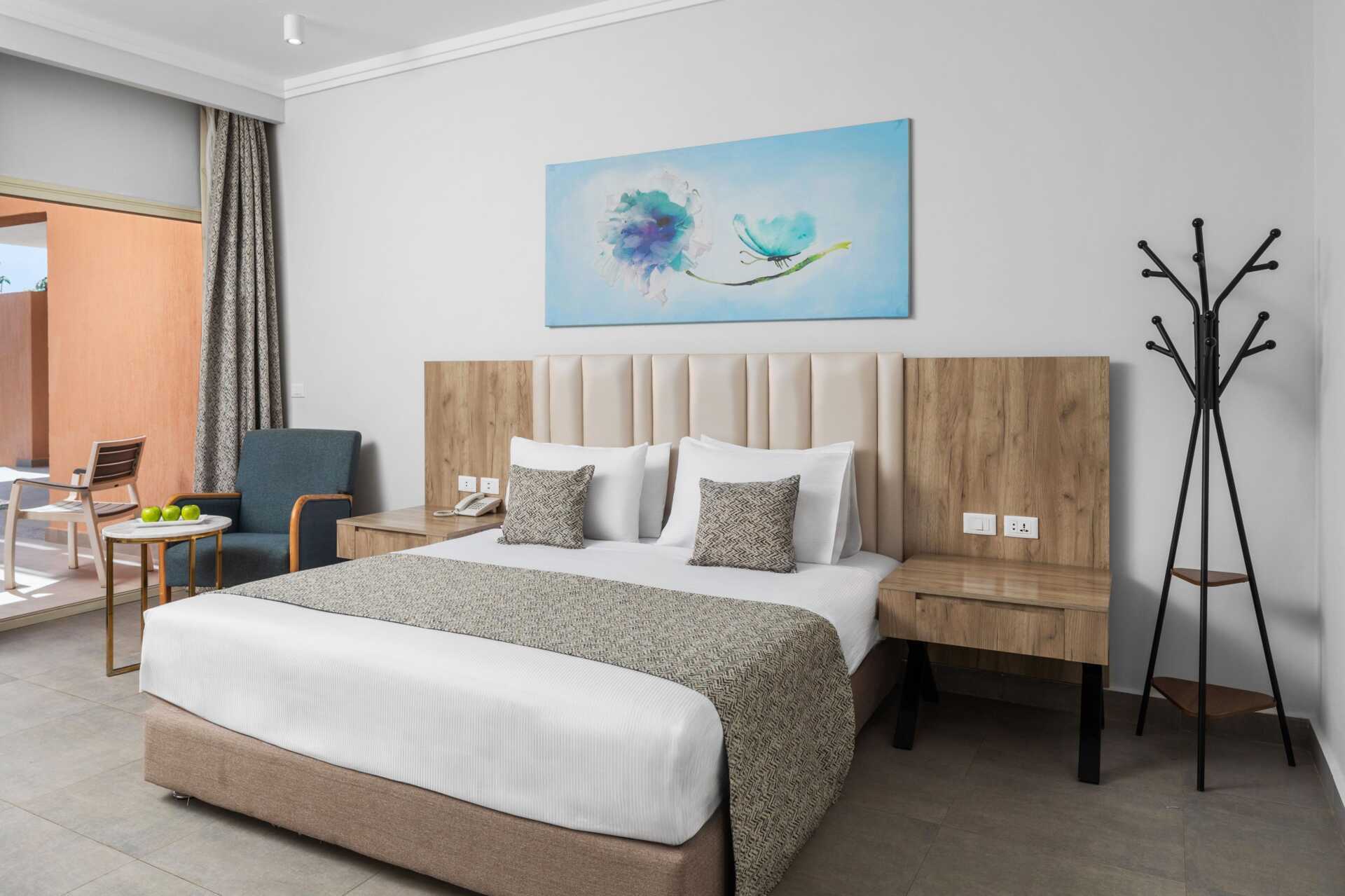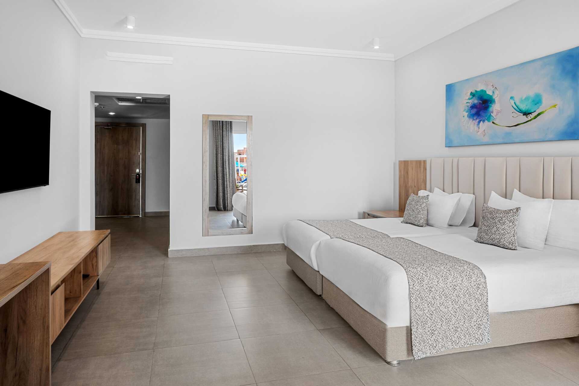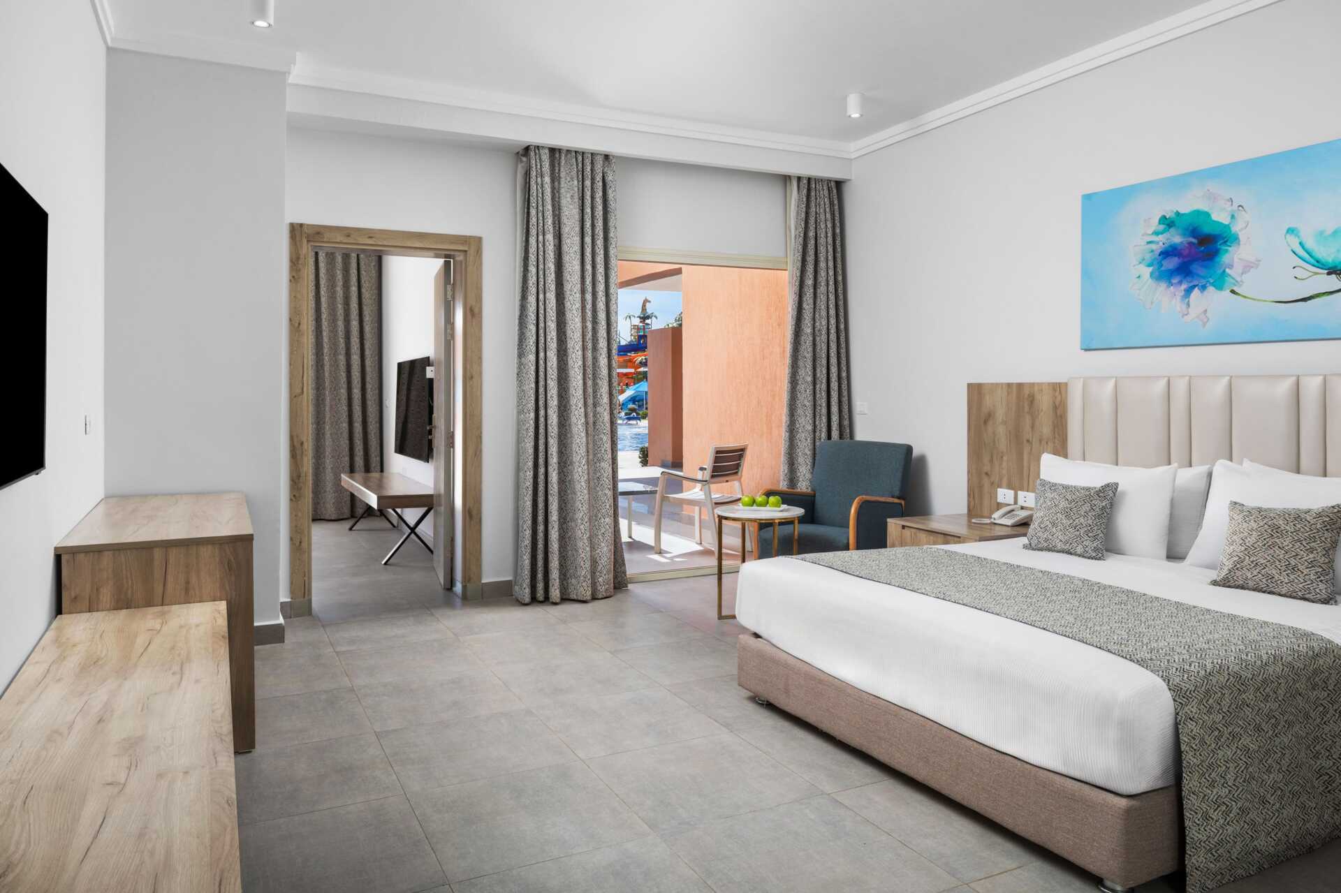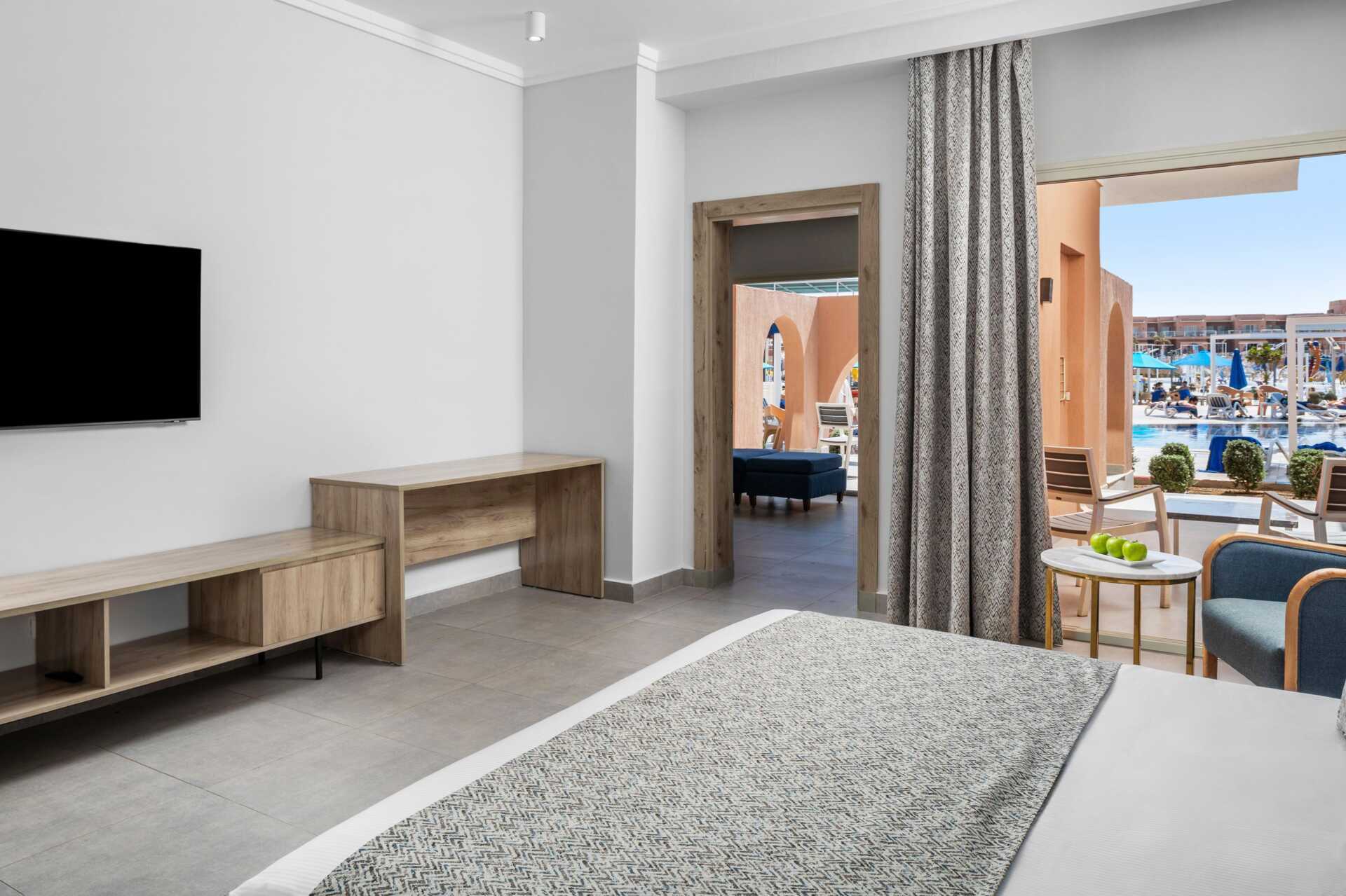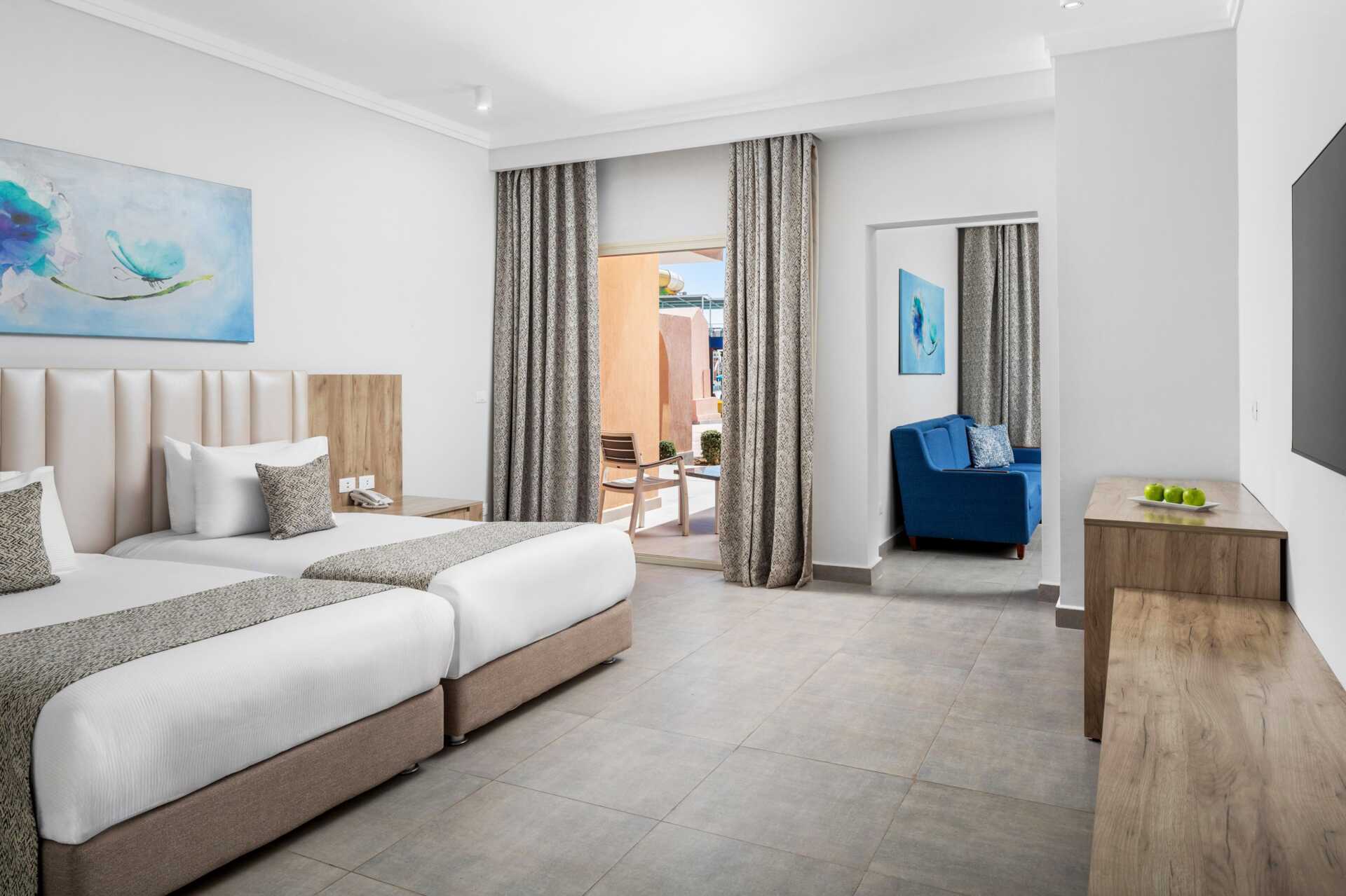 Tvårumssvit med balkong eller terrass och poolutsikt. Sviten består av två sovrum med varsitt badrum i den gemensamma hallen, varav ett har en vardagsrumsdel. En dubbelsäng i ett sovrum och det andra sovrummet har två enkelsängar. Möjlighet till extrabädd i hopfällbar säng. Wifi, luftkonditionering och deponering ingår. Minibar mot avgift - daglig påfyllning av vatten på flaska som ingår. Tv med internationella kanaler. Hårtork. Badrum med badkar, separat dusch samt wc. Städning 7 ggr/vecka.