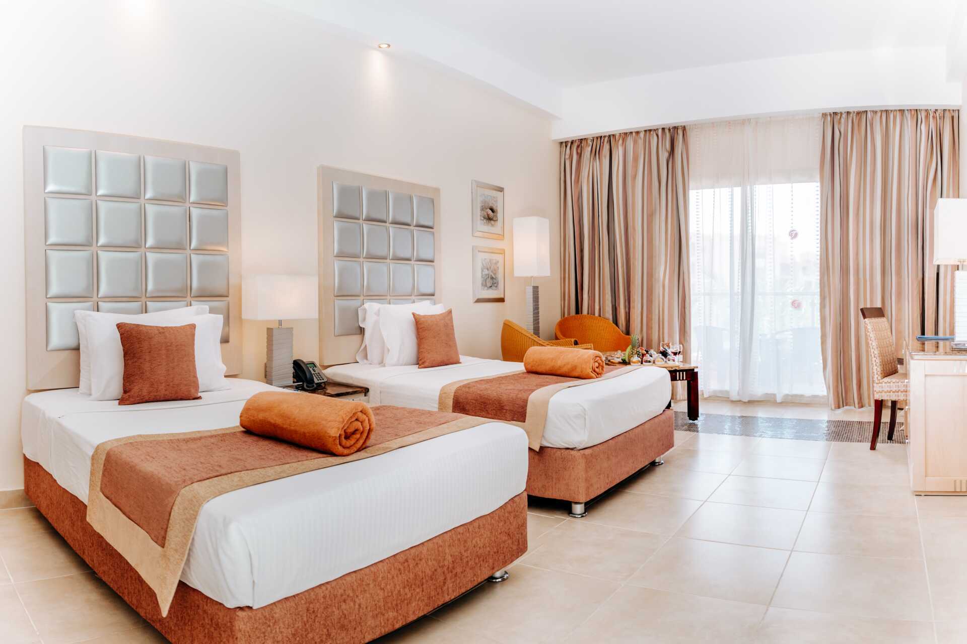 Familjerum med balkong. Rummet består av två dubbelrum med förbindelsedörr. En dubbelsäng. Möjlighet till extrabäddar i två enkelsängar och en bäddsoffa. Wifi, luftkonditionering och deponering ingår. Vattenkokare samt kaffe och te. En stor flaska vatten per person/dag ingår. En tv med internationella kanaler i varje rum. Hårtork. Två badrum, ett med badkar och dusch och ett med endast dusch samt wc. Städning 7 ggr/vecka. Barn under två år räknas in i maxantalet personer i rummet.