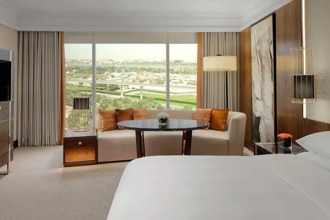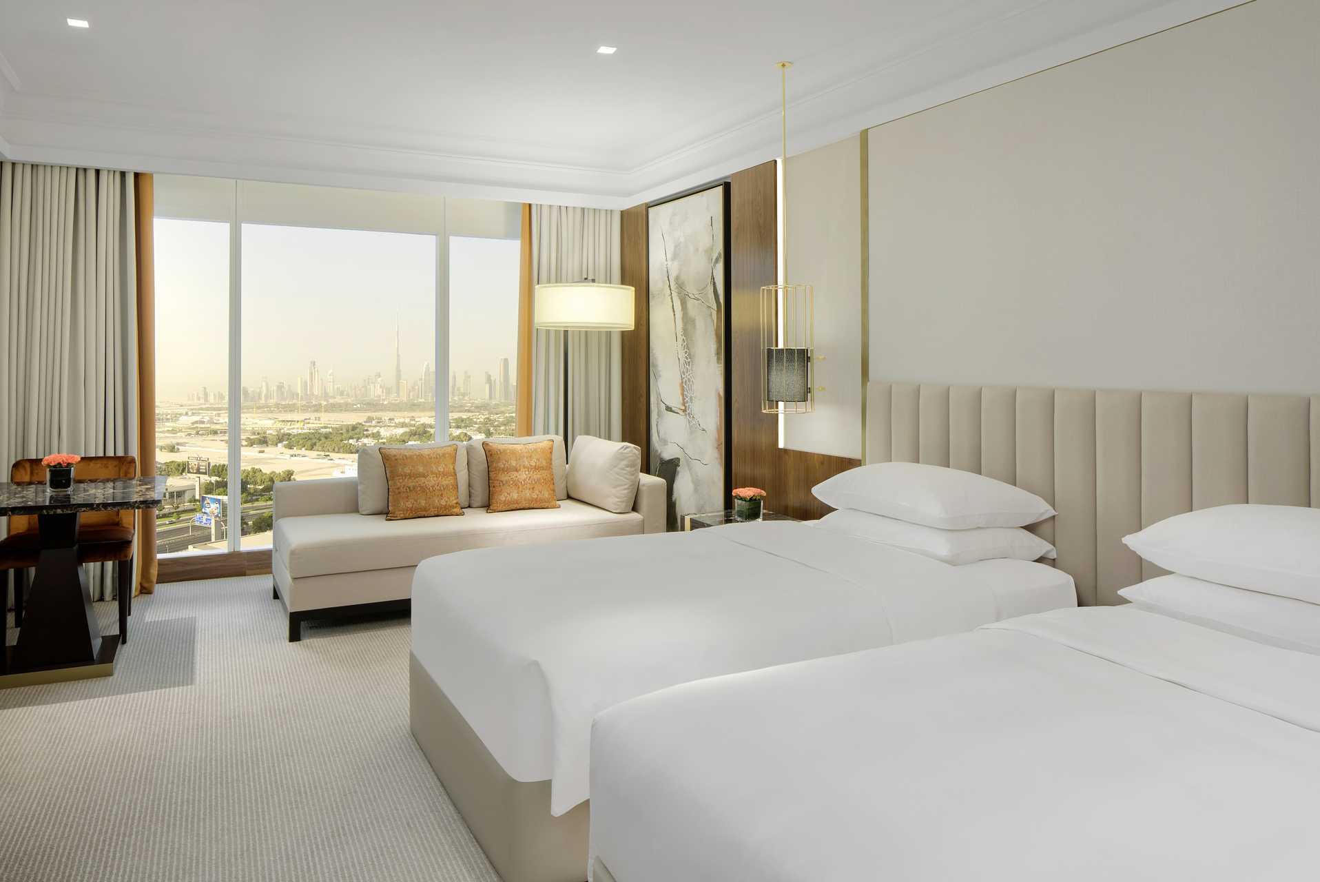 Deluxerum, vissa med utsikt över Dubais skyline. Rummen har ingen uteplats. En dubbelsäng eller två enkelsängar. Möjlighet till extrabädd i bäddsoffa. Wifi, luftkonditionering och deponering ingår. Heltäckningsmatta. Minibar. Kaffemaskin. Tv med internationella kanaler. Strykjärn och strykbräda. Hårtork. Badrockar och tofflor. Badrum med badkar eller dusch samt wc. Städning 7 ggr/vecka. Barn under två år räknas in i maxantalet personer i rummet.