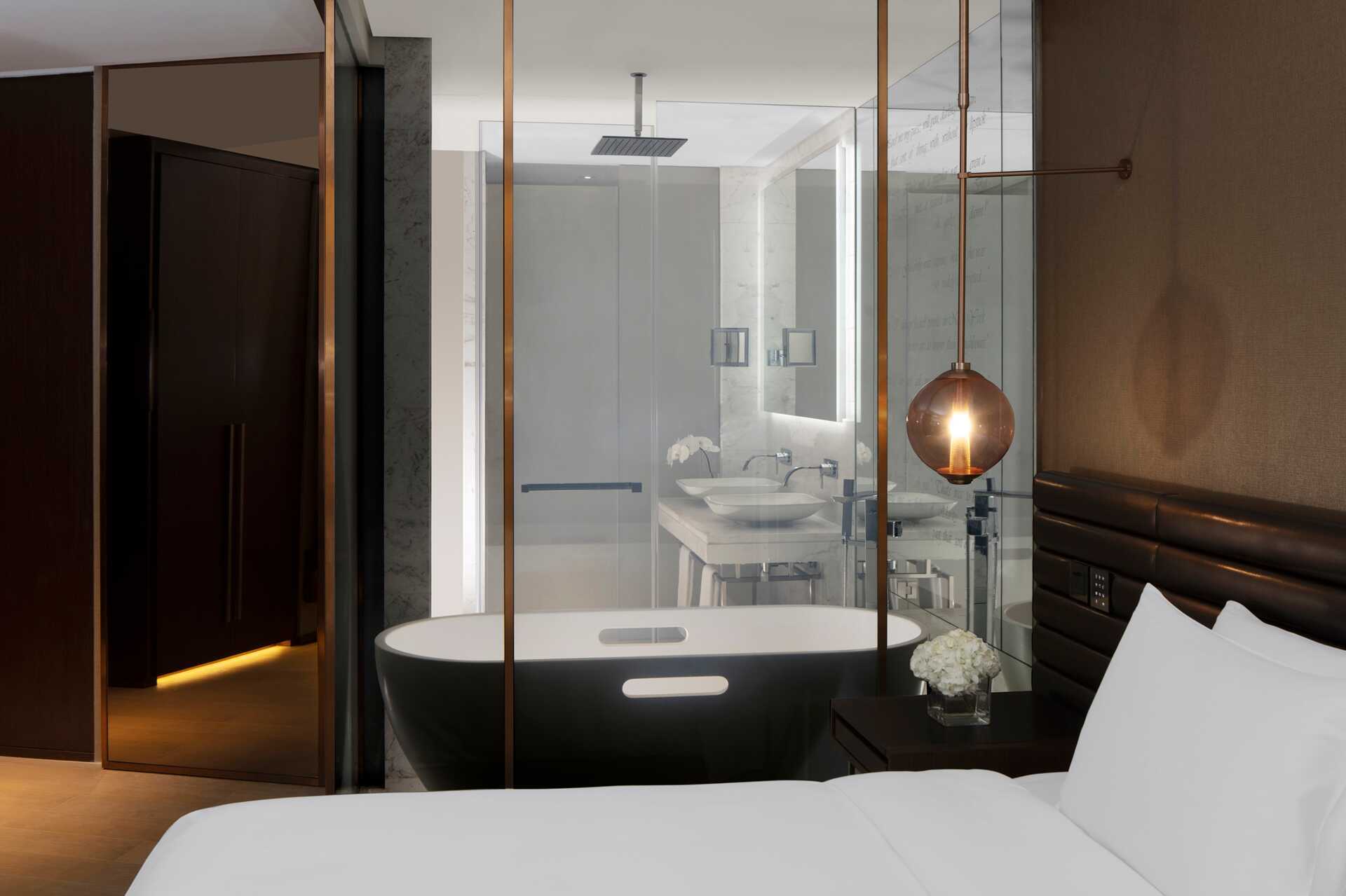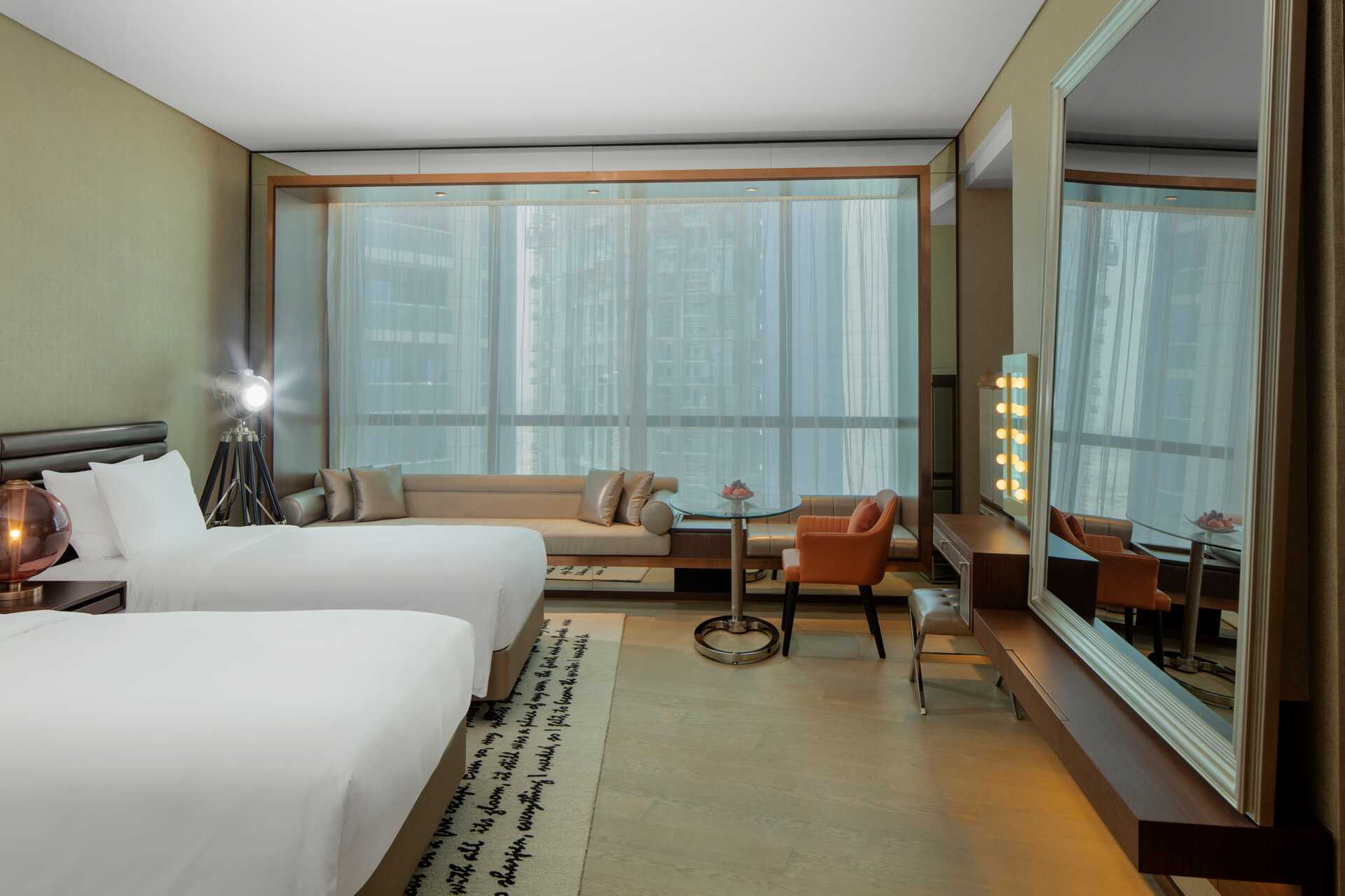 Dubbelrum utan uteplats, vissa har utsikt mot Dubai Downtown. En dubbelsäng. Separat sittgrupp. Wifi, luftkonditionering och deponering ingår. Minibar. Vattenkokare samt kaffe och te. Nespressomaskin. Tv med internationella kanaler. Strykjärn och strykbräda. Badrockar och tofflor. Hårtork. Badrummet, som har en glasvägg mot rummet, har badkar och separat dusch samt wc. Städning 7 ggr/vecka.
