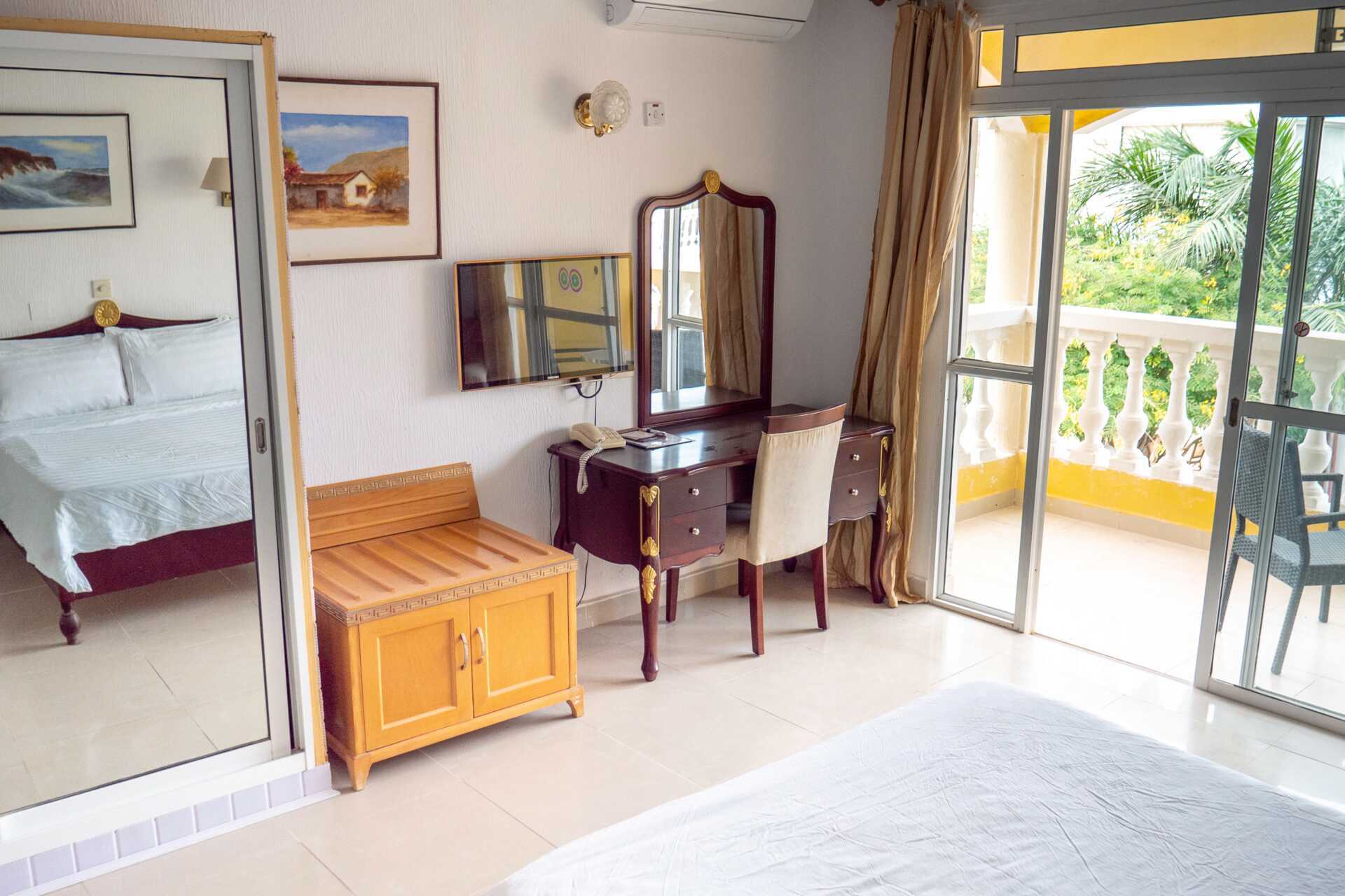 Dubbelrum med balkong eller terrass. Två enkelsängar. Möjlighet till extrabäddar i hopfällbara sängar. Wifi och deponering ingår. Luftkonditionering mot avgift. Takfläkt. Kylskåp. Vattenkokare. Tv med internationella kanaler. Strykjärn och strykbräda. Hårtork. Badrum med badkar eller dusch samt wc. Städning 7 ggr/vecka. Myggnät finns vid varje fönster.