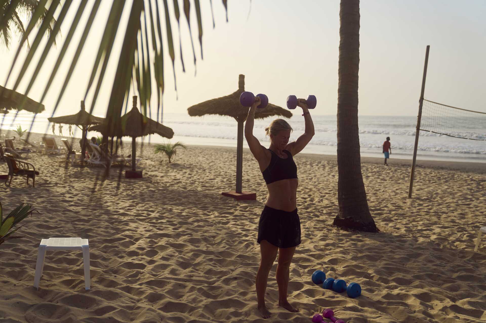 Lokalbefolkningen tränar ofta på stranden på morgonen och blandar löpningen med styrketräning och stretching.
