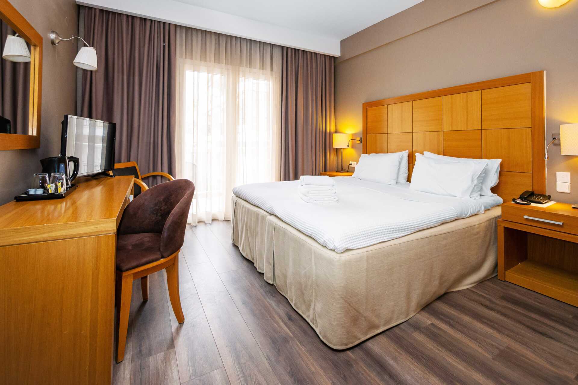 Dubbelrum med balkong, vissa med havsutsikt. En dubbelsäng eller två enkelsängar. Wifi, luftkonditionering och deponering ingår. Minibar. Vattenkokare samt kaffe och te. Tv med internationella kanaler. Städning 6 ggr/vecka. Hårtork. Badrum med dusch och wc. Barn under två år räknas in i maxantalet personer i rummet.