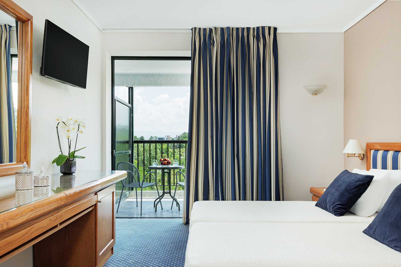 Dubbelrum med balkong och trädgårdsutsikt. Två enkelsängar. Möjlighet till extrabädd i enkelsäng. Wifi, luftkonditionering och deponering ingår. Kylskåp. Tv med internationella kanaler. Heltäckningsmatta. Badrockar. Hårtork. Badrum med badkar eller dusch samt wc. Städning 7 ggr/vecka.