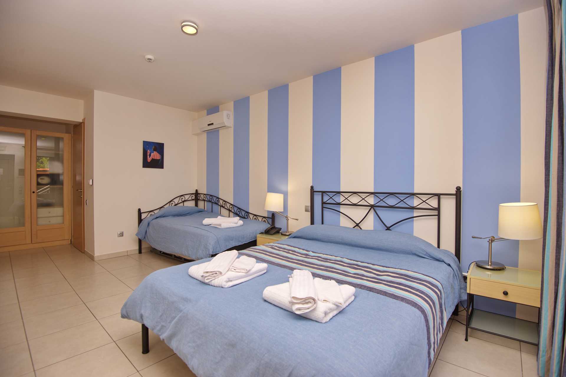Dubbelrum med balkong eller terrass. En dubbelsäng eller två enkelsängar. Möjlighet med extrabädd. Wifi, luftkonditionering och deponering ingår. Kylskåp. Vattenkokare. Tv med internationella kanaler. Hårtork. Badrum med badkar eller dusch samt wc. Städning 7 ggr/vecka.