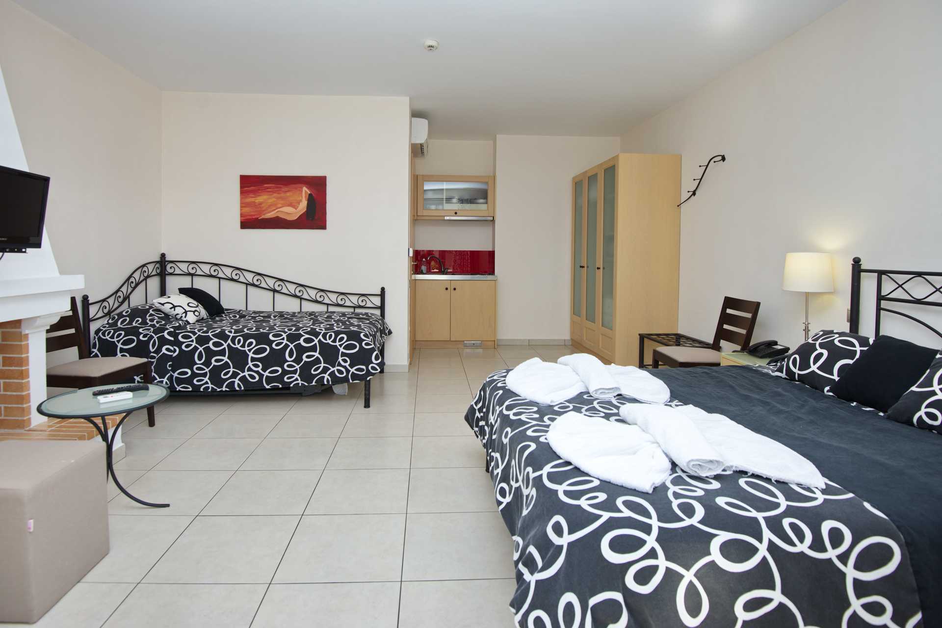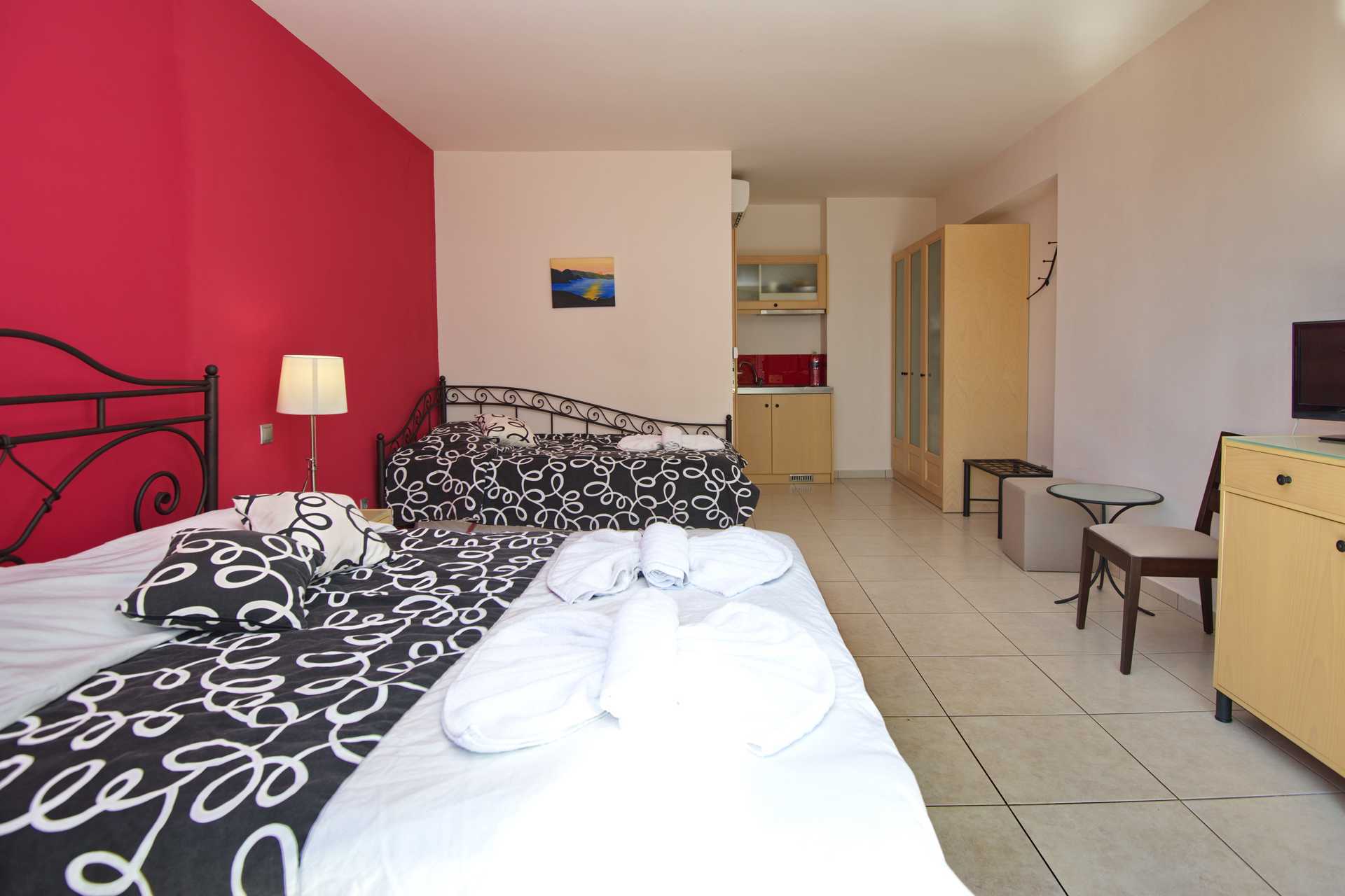 Superiorrum med markterrass. En dubbelsäng och en enkelsäng. Wifi, luftkonditionering och deponering ingår. Kylskåp. Vattenkokare. Tv med internationella kanaler. Hårtork. Badrum med badkar eller dusch samt wc. Städning 7 ggr/vecka.