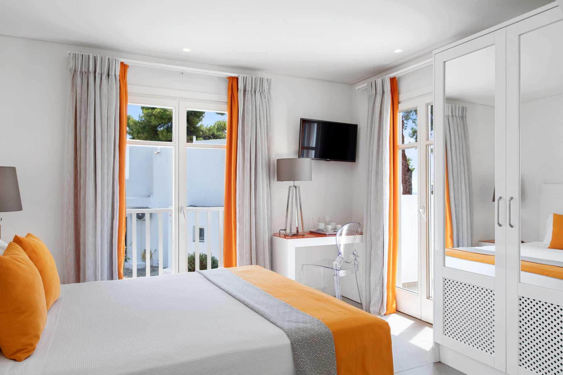 Deluxerum med balkong eller terrass. En dubbelsäng eller två enkelsängar. Möjlighet till extrabädd i bäddsoffa. Wifi, luftkonditionering och deponering ingår. Kylskåp. Tv med internationella kanaler. Badrum med dusch och wc. Städning 7 ggr/vecka. Barn under två år räknas in i max antal personer i rummet.