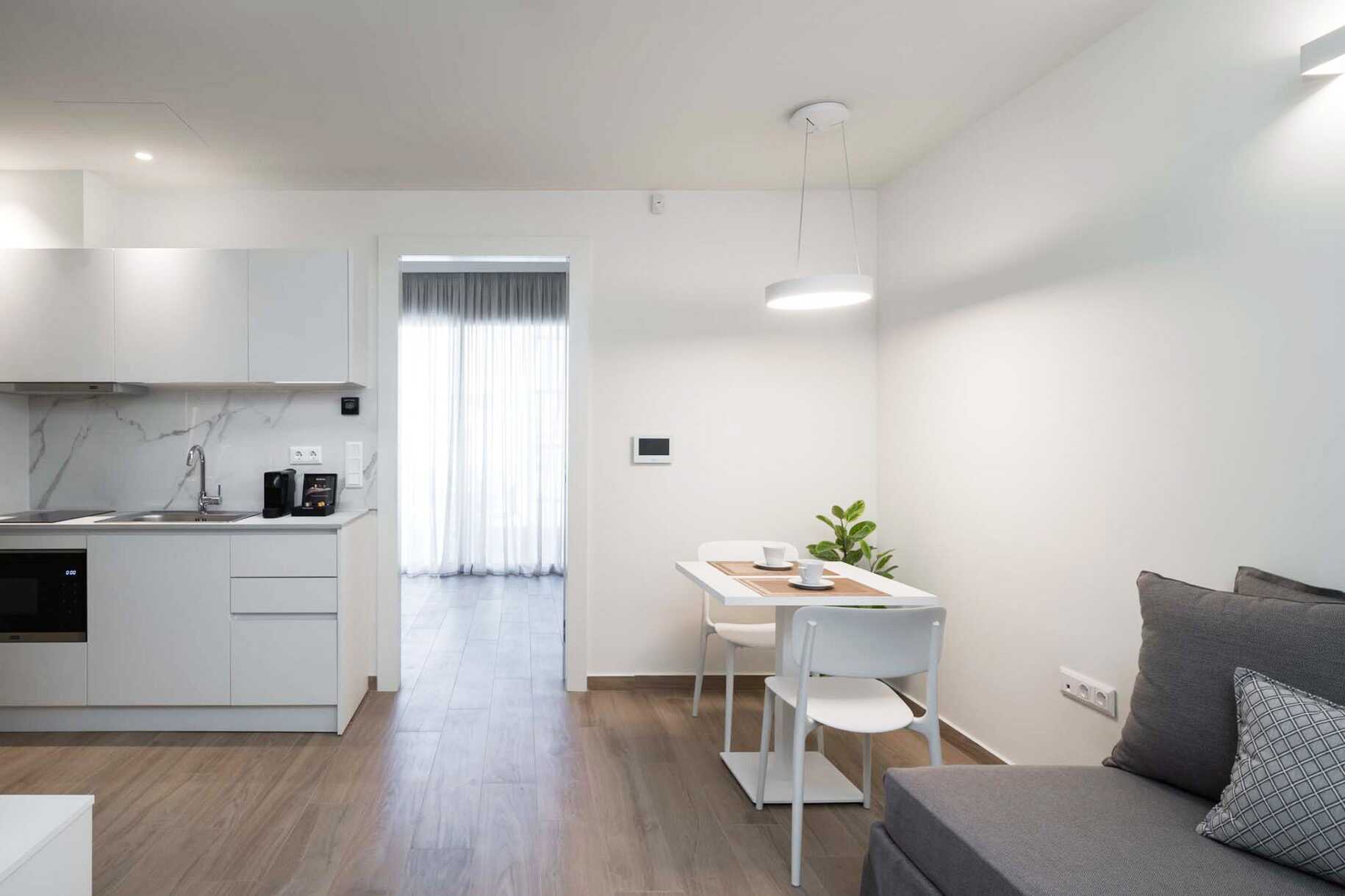 Tvårumslägenhet med balkong. Sovrum och kombinerat vardagsrum med minikök. En dubbelsäng. Möjlighet till extrabäddar i bäddsoffa. Minikök med kokplattor, mikrovågsugn, kylskåp, vattenkokare, brödrost, Nespresso kaffemaskin, diskmaskin och enkel köksutrustning. Wifi, luftkonditionering och deponering ingår. Tv med internationella kanaler. Tvättmaskin. Strykjärn och strykbräda. Badrockar och tofflor. Hårtork. Badrum med dusch och wc. Städning 6 ggr/vecka. Barn under två år räknas in i maxantalet personer i lägenheten.