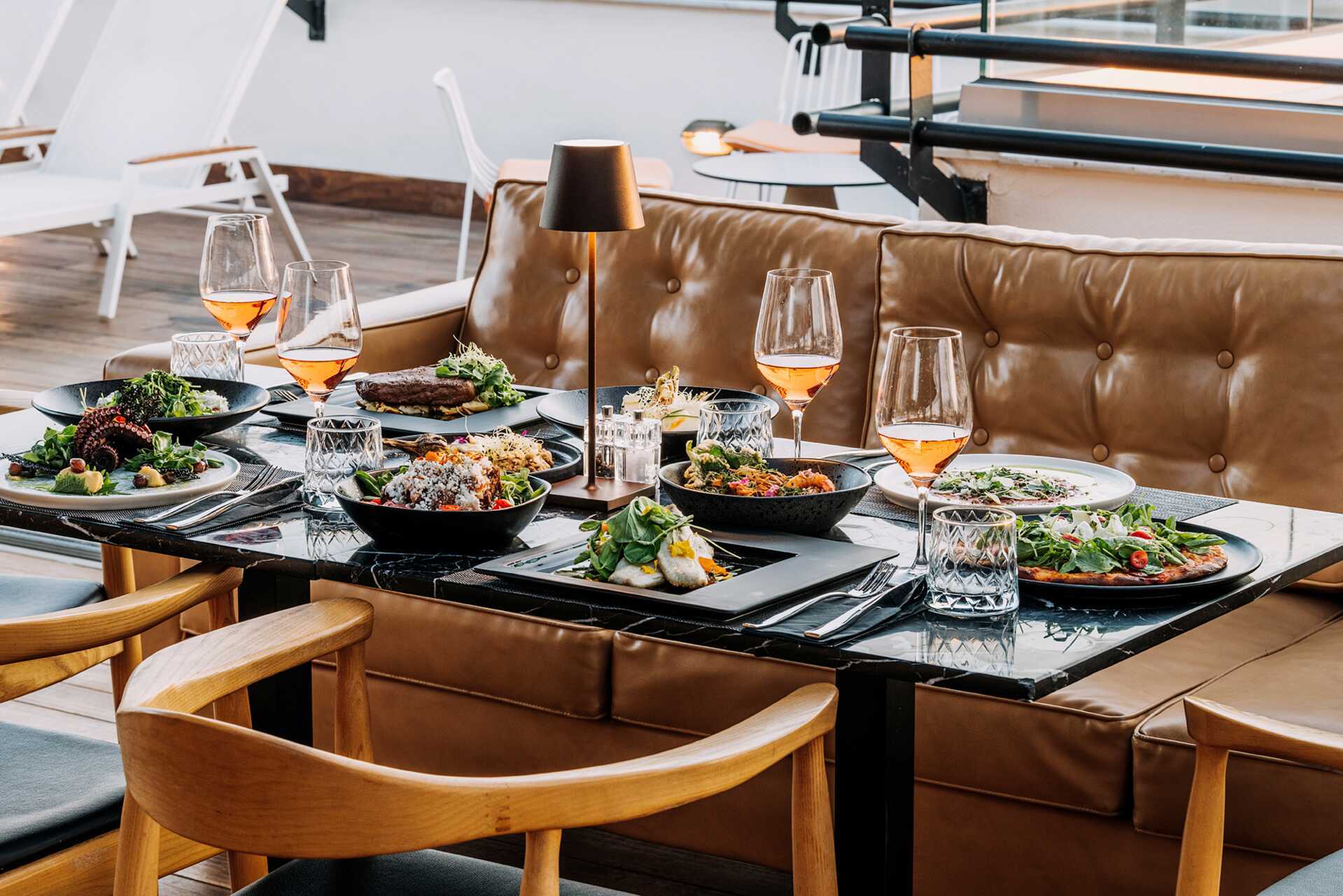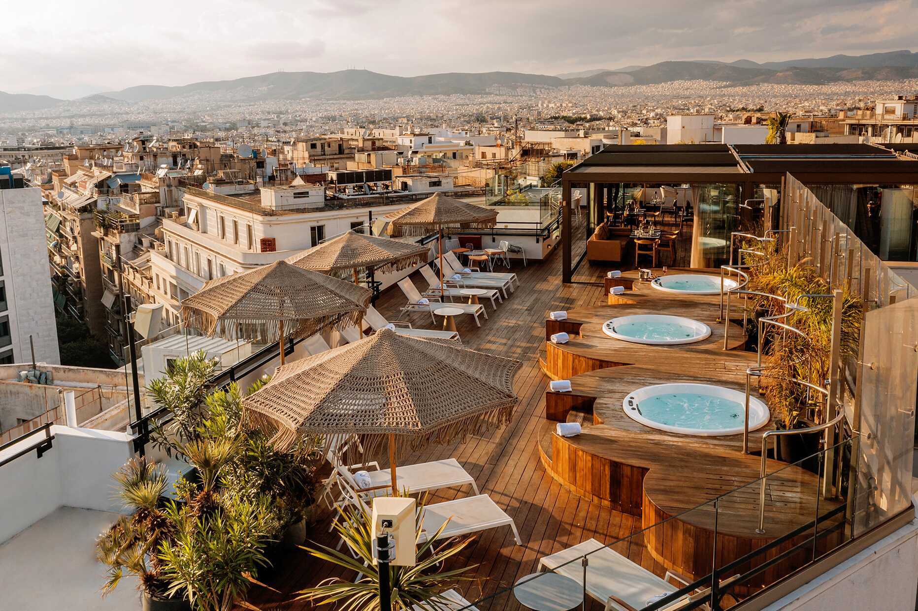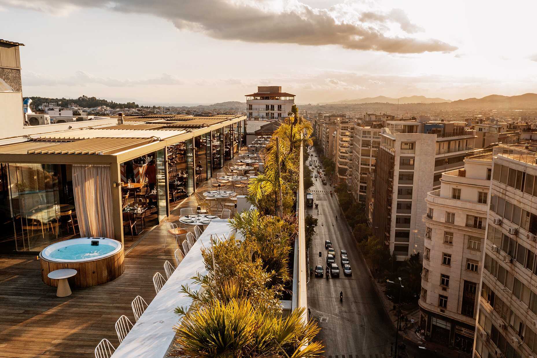 I hotellets huvudrestaurang serveras en härlig frukostbuffé varje morgon och på hotellets takterrass finns en restaurang som håller öppet under kvällstid, här kan du njuta av en varierad meny, ta en drink eller bara njuta av den magiska utsikten över Aten. På takterassen finns även en bar och bubbelpooler med tillhörande solstolar och parasoller.