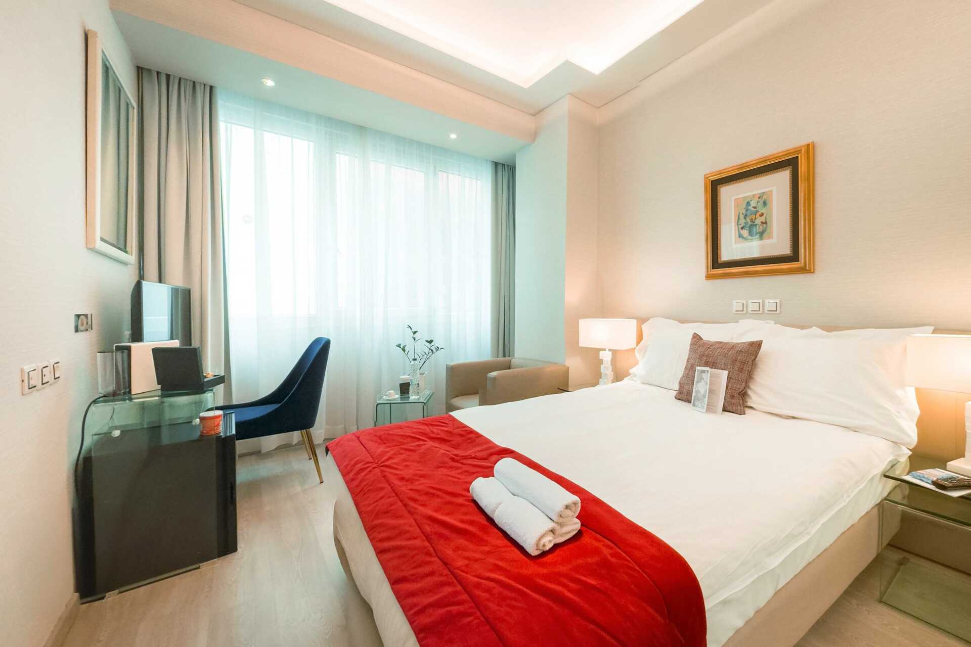 Standardrum utan uteplats. En dubbelsäng eller två enkelsängar. Möjlighet till extrabädd i bäddsoffa. Wifi, luftkonditionering och deponering ingår. Minibar. Vattenkokare samt kaffe och te. Tv med internationella kanaler. Strykjärn och strykbräda. Hårtork. Badrum med badkar eller dusch samt wc. Städning 7 ggr/vecka.