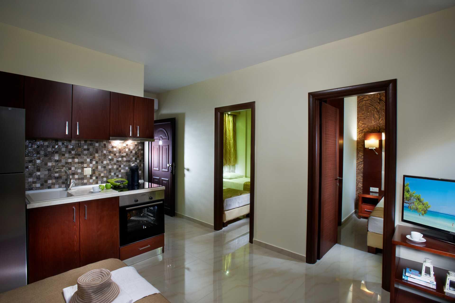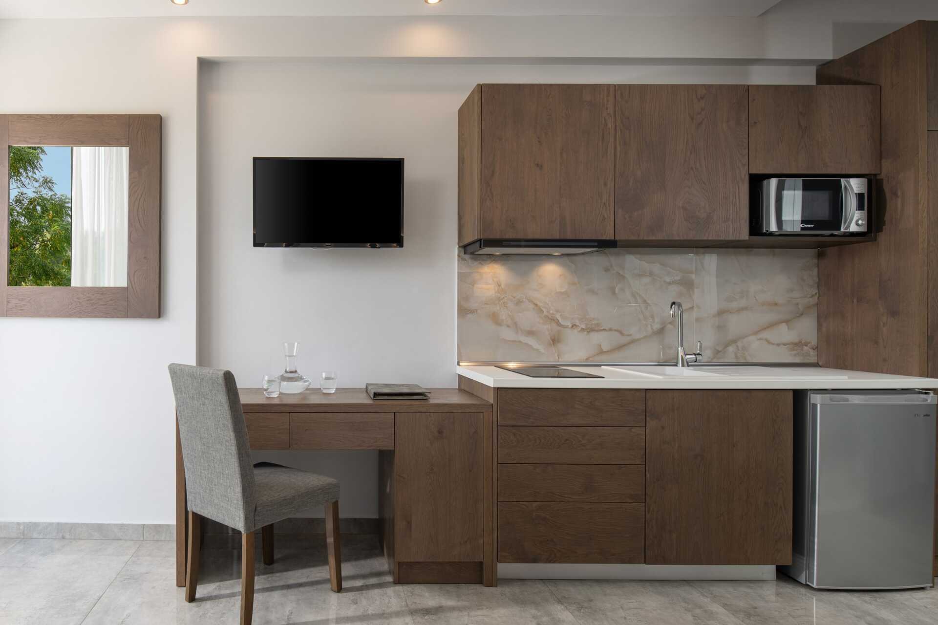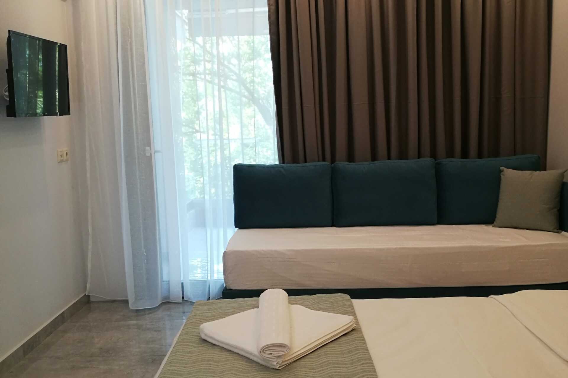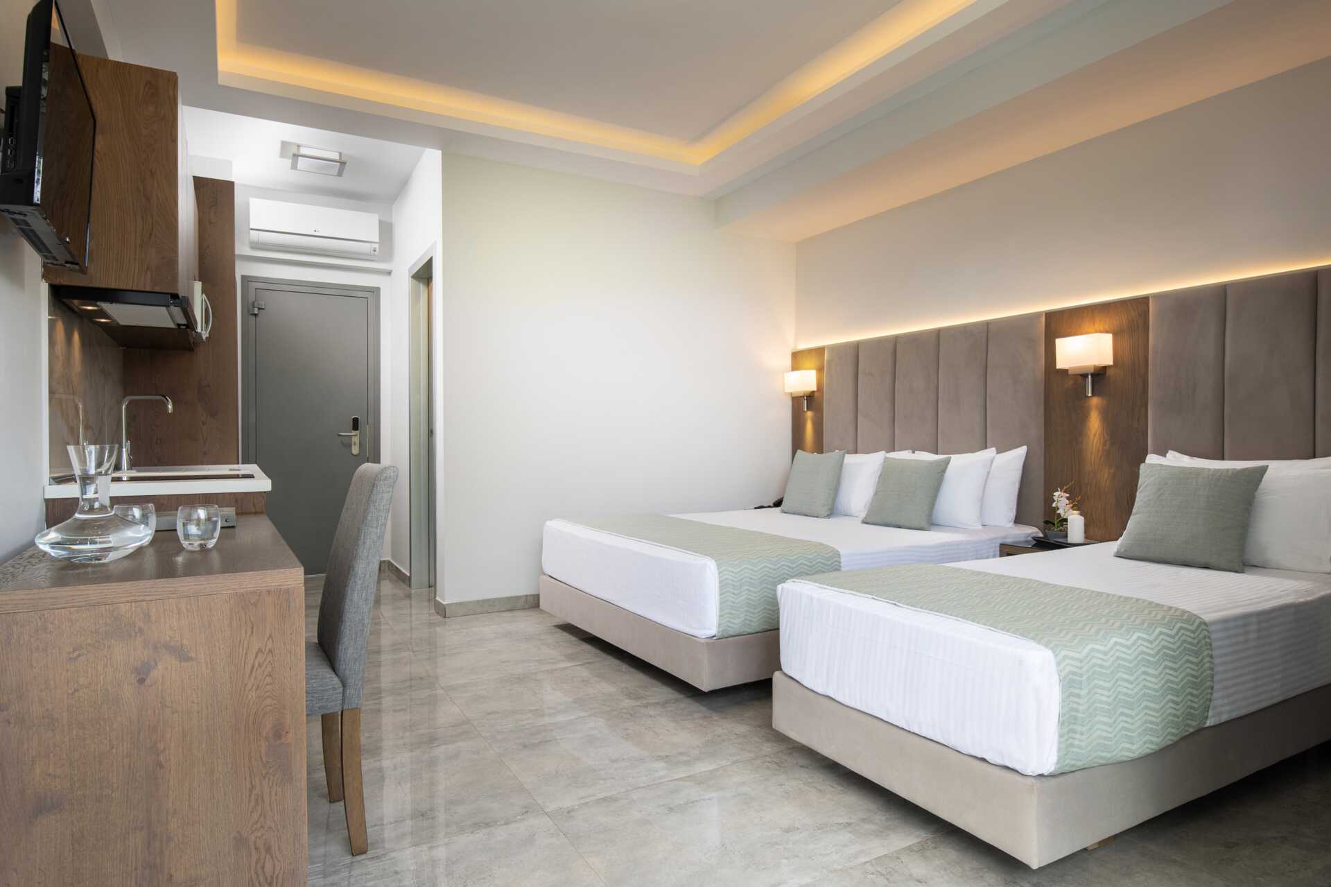 Enrumslägenhet superior med balkong eller terrass. Kombinerat sovrum och minikök. En dubbelsäng och möjlighet till extrabäddar i bäddsoffa. En skjutdörr av glas mellan sängen och bäddsoffan. Minikök med kylskåp, kokplattor, mikrovågsugn och enkel köksutrustning. Wifi, luftkonditionering och deponering ingår. Tofflor. Hårtork. Badrum med dusch och wc. Städning 7 ggr/vecka.