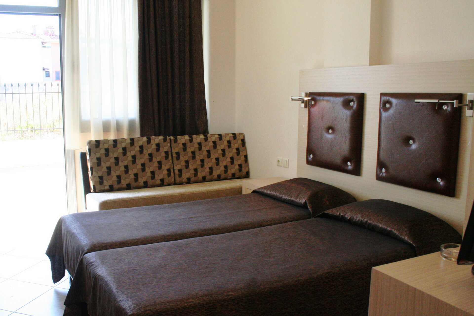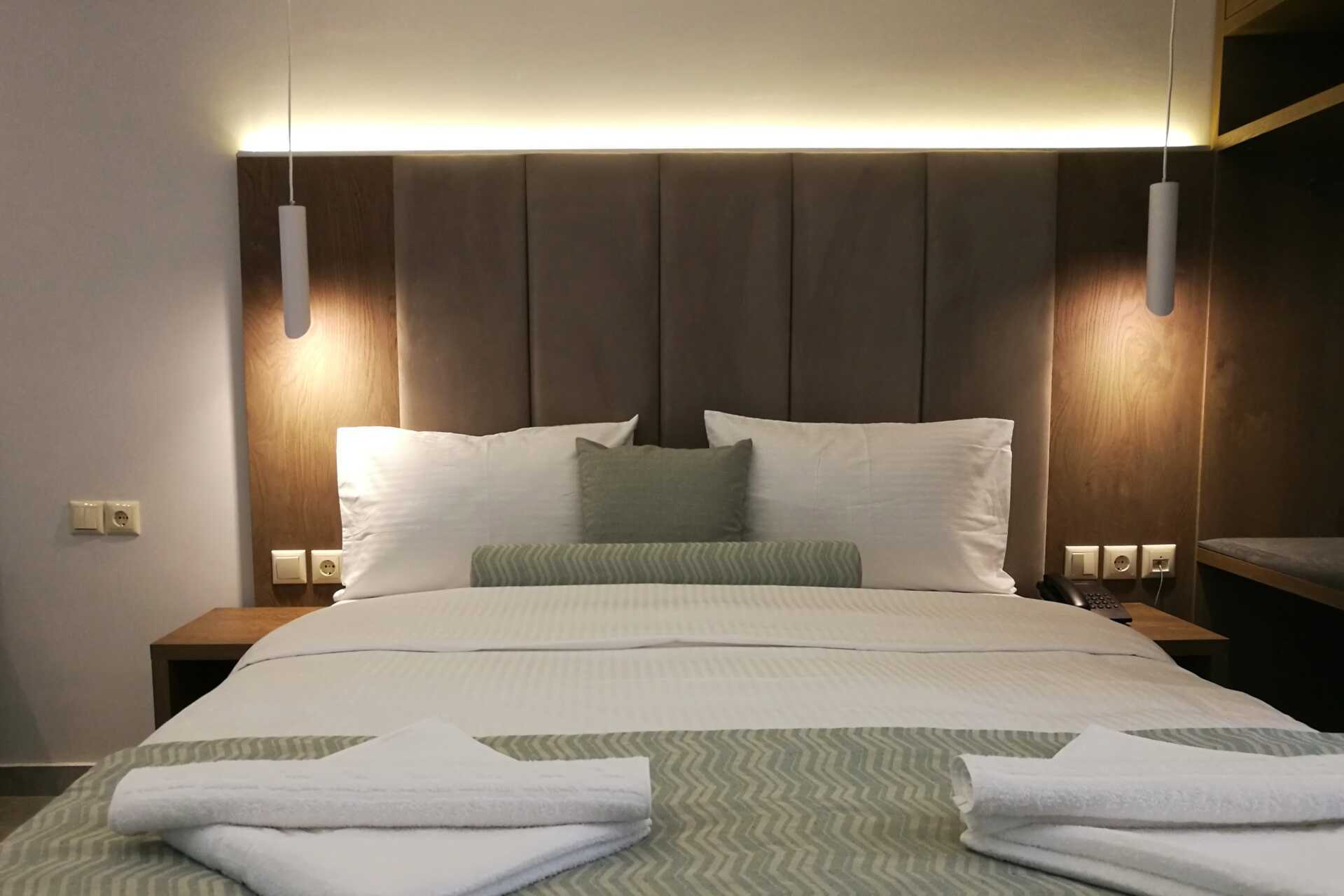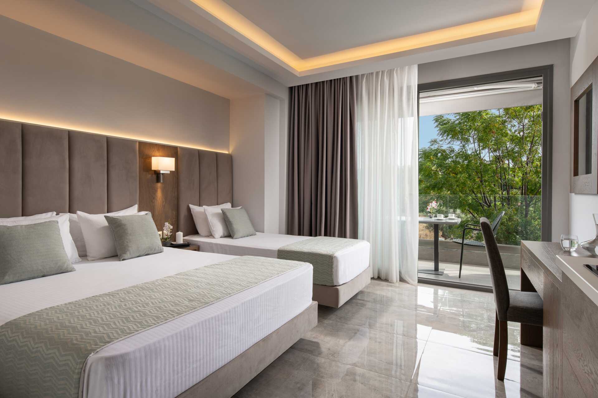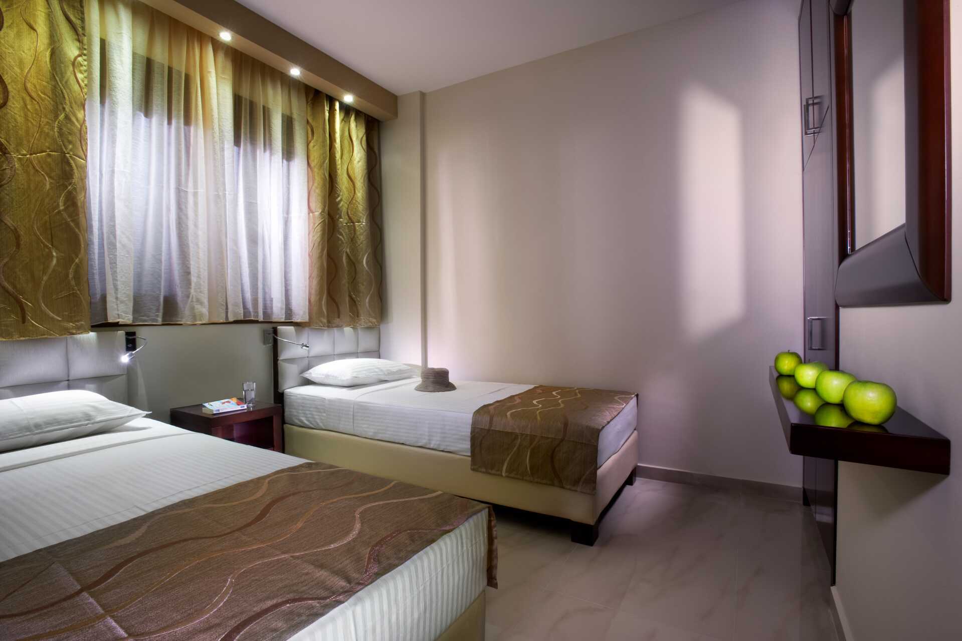 Enrumslägenhet superior med balkong eller terrass. Kombinerat sovrum och minikök. En dubbelsäng och möjlighet till extrabäddar i bäddsoffa. En skjutdörr av glas mellan sängen och bäddsoffan. Minikök med kylskåp, kokplattor, mikrovågsugn och enkel köksutrustning. Wifi, luftkonditionering och deponering ingår. Tofflor. Hårtork. Badrum med dusch och wc. Städning 7 ggr/vecka.