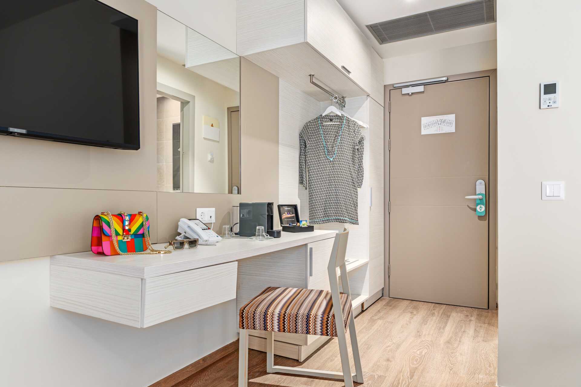 Deluxerum med balkong, vissa med havsutsikt. En dubbelsäng eller två enkelsängar. Möjlighet till extrabädd i bäddsoffa. Kuddmeny. Wifi, luftkonditionering och deponering ingår. Kylskåp. Vattenkokare samt kaffe och te. Nespresso kaffemaskin - kapslar ingår vid ankomsten, påfyllning mot avgift. Tv med internationella kanaler. Tofflor. Hårtork. Badrum med dusch och wc. Städning 7 ggr/vecka.