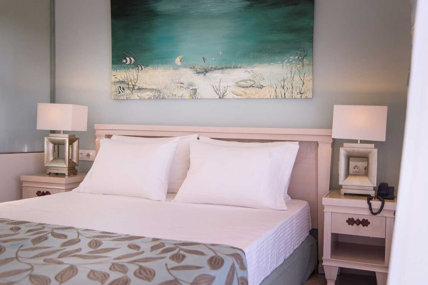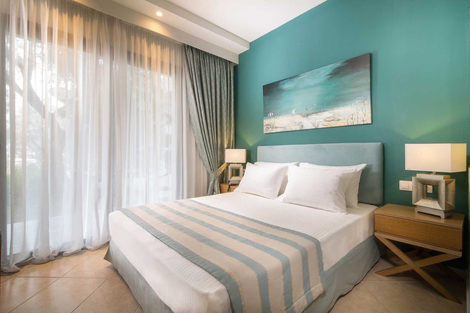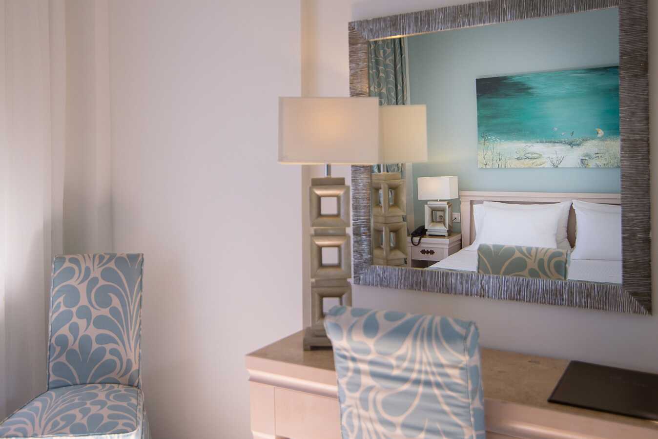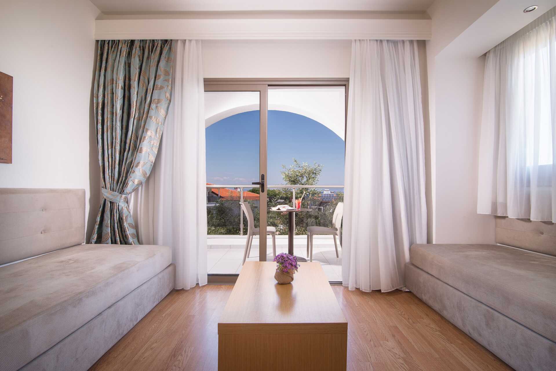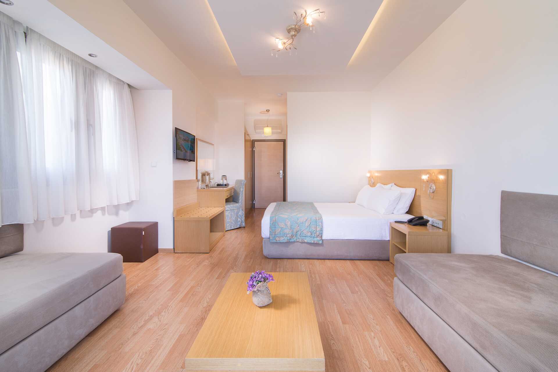Juniorsvit med balkong eller terrass och poolutiskt. En dubbelsäng och möjlighet till extrabädd i två enkelsängar. Wifi, luftkonditionering och deponering ingår. Litet kylskåp. Vattenkokare samt kaffe och te. Tv med internationella kanaler. Badrum med badkar eller dusch samt wc. Städning 6 ggr/vecka.