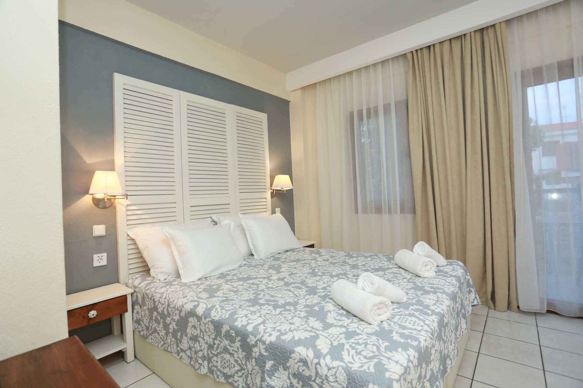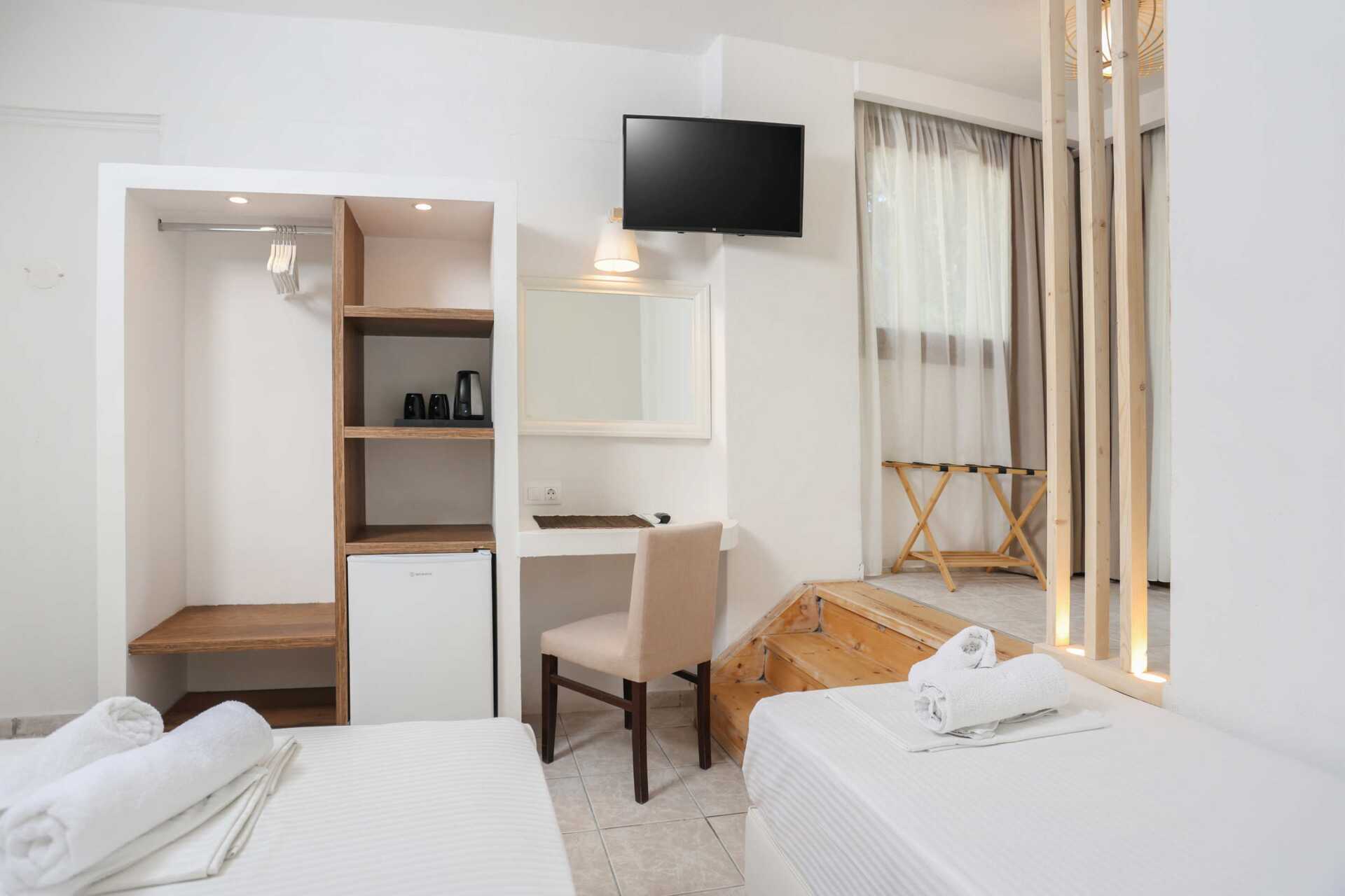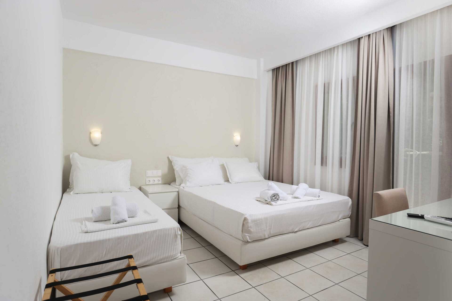 Trippelrum med balkong. En dubbelsäng och en enkelsäng. Wifi, luftkonditionering och deponering ingår. Kylskåp. Tv med lokala kanaler. Hårtork. Badrum med dusch och wc. Städning 6 ggr/vecka.