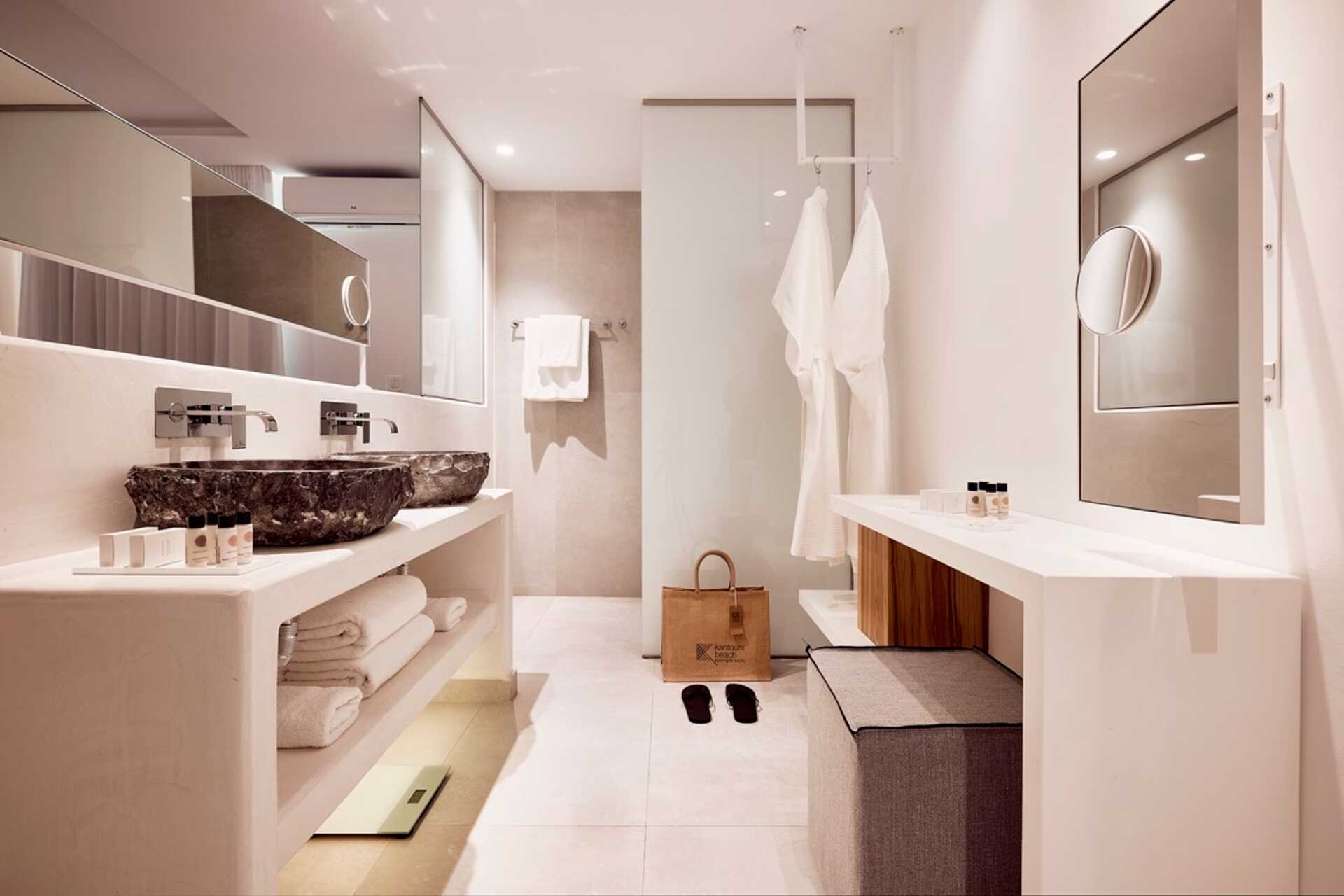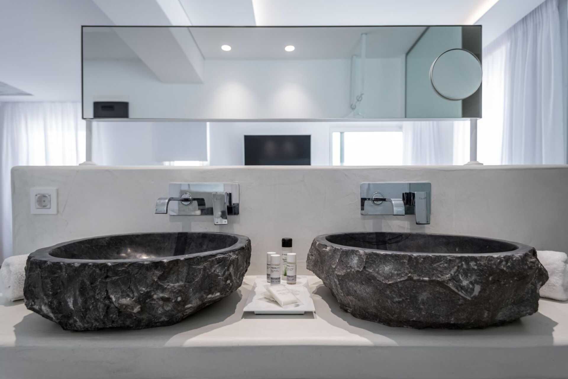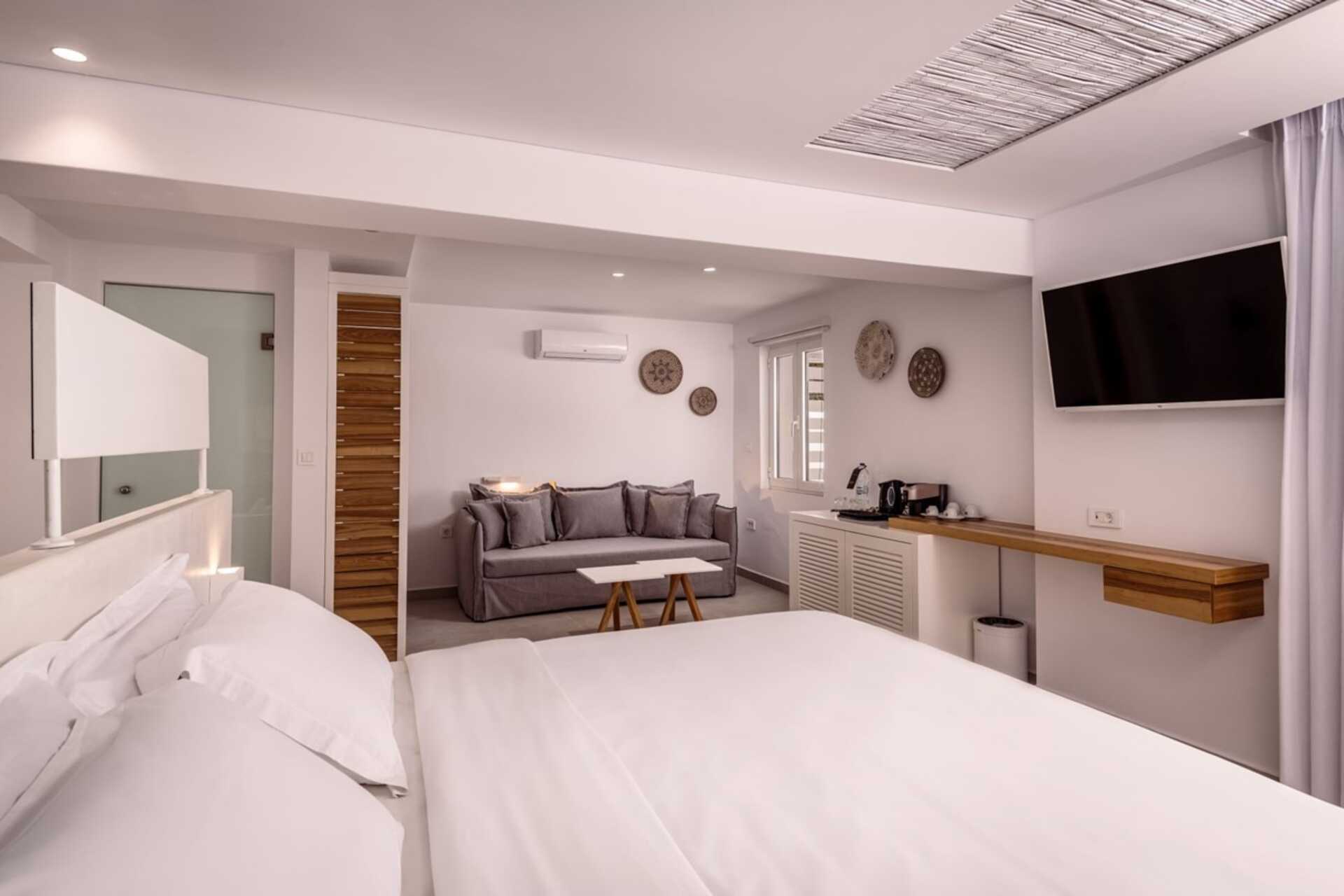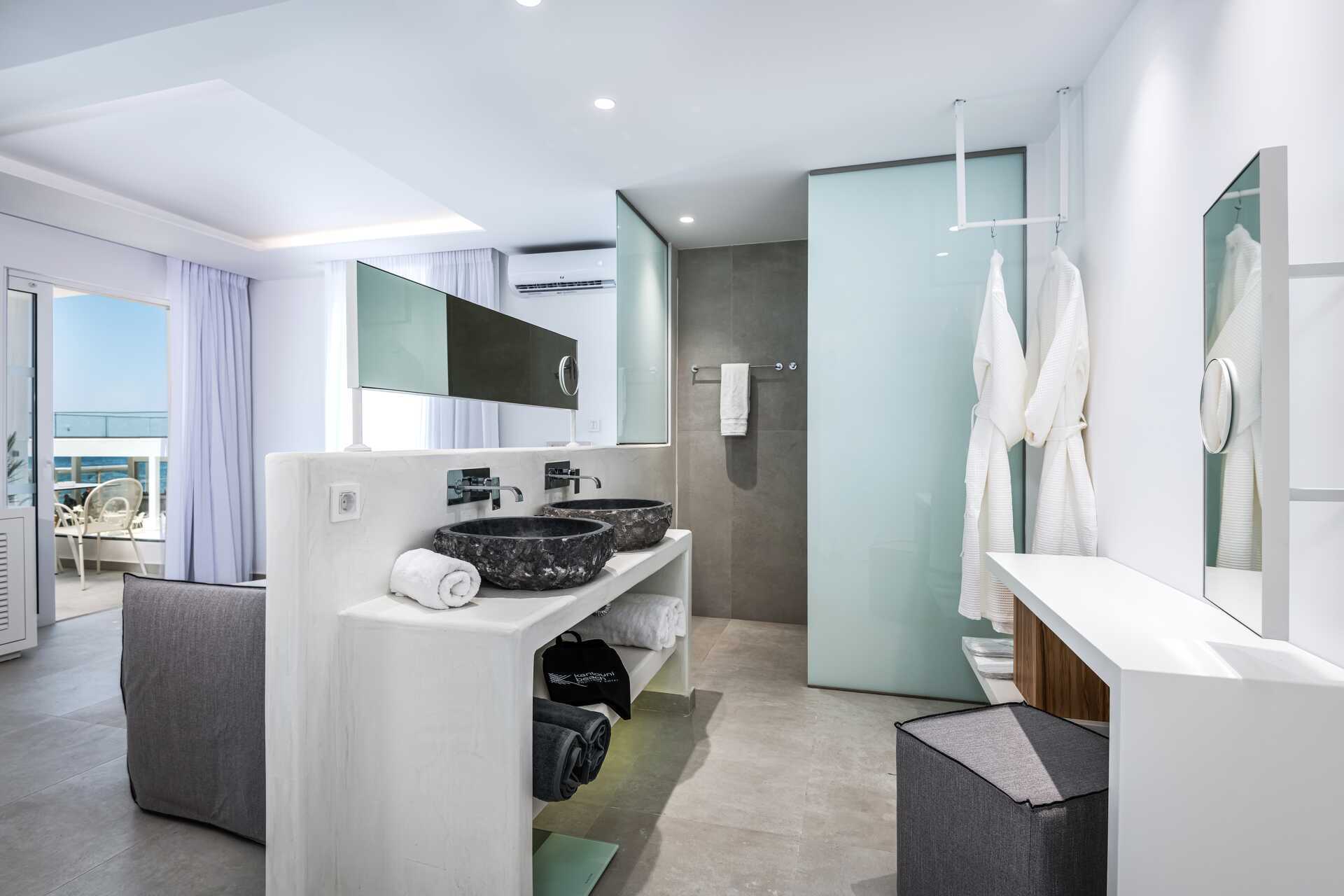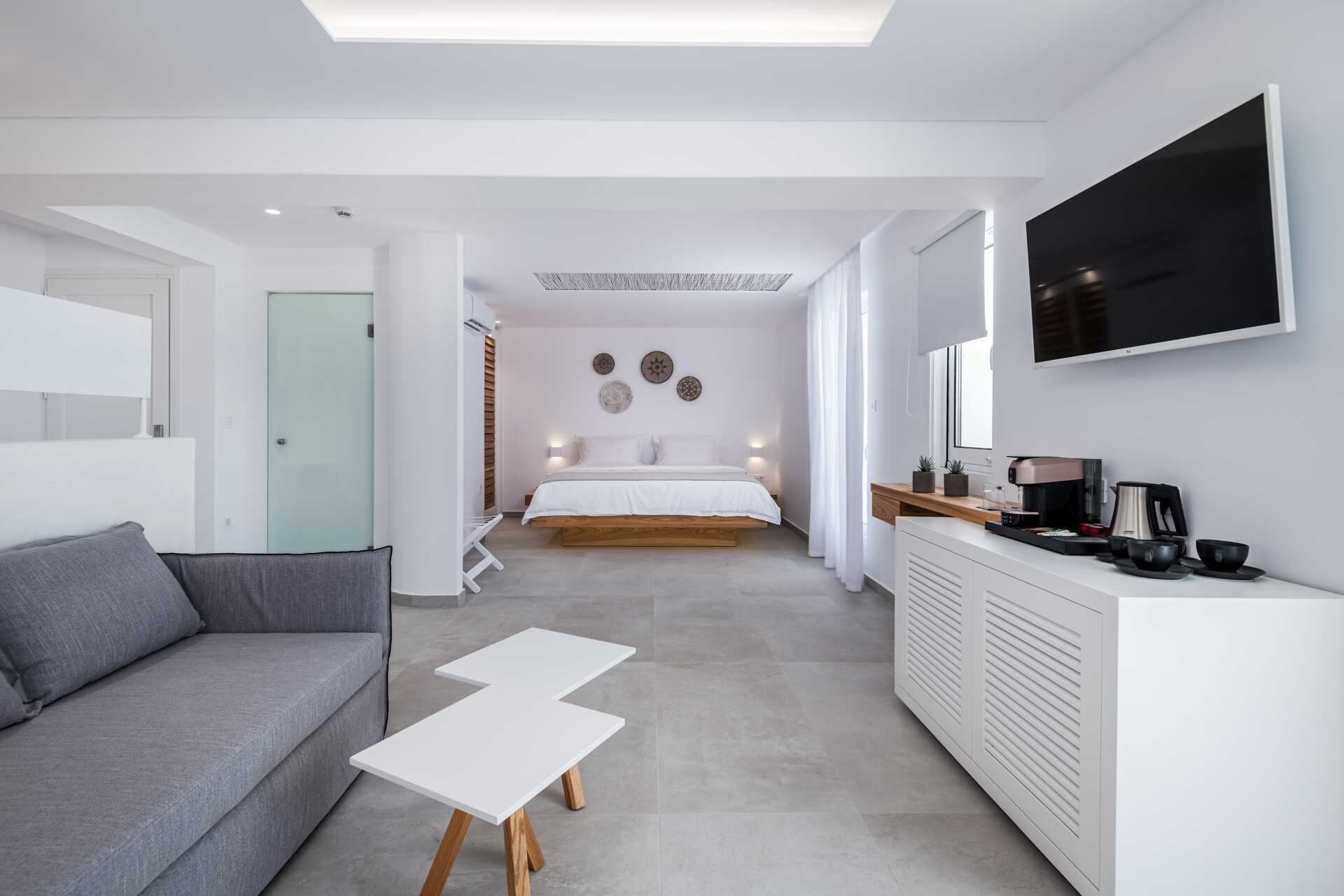 Juniorsvit med balkong eller terrass, vissa med havsutsikt. En dubbelsäng. Möjlighet till extrabäddar i en bäddsoffa. Wifi, luftkonditionering och deponering ingår. Kylskåp. Espressomaskin. Vattenkokare samt kaffe och te. Tv med internationella kanaler. Badrockar och tofflor. Strandväska med pool- och strandhanddukar och strandskor. Hårtork. Badrum med dusch och wc. Städning 7 ggr/vecka. Barn under två år räknas in i maxantalet personer i rummet.