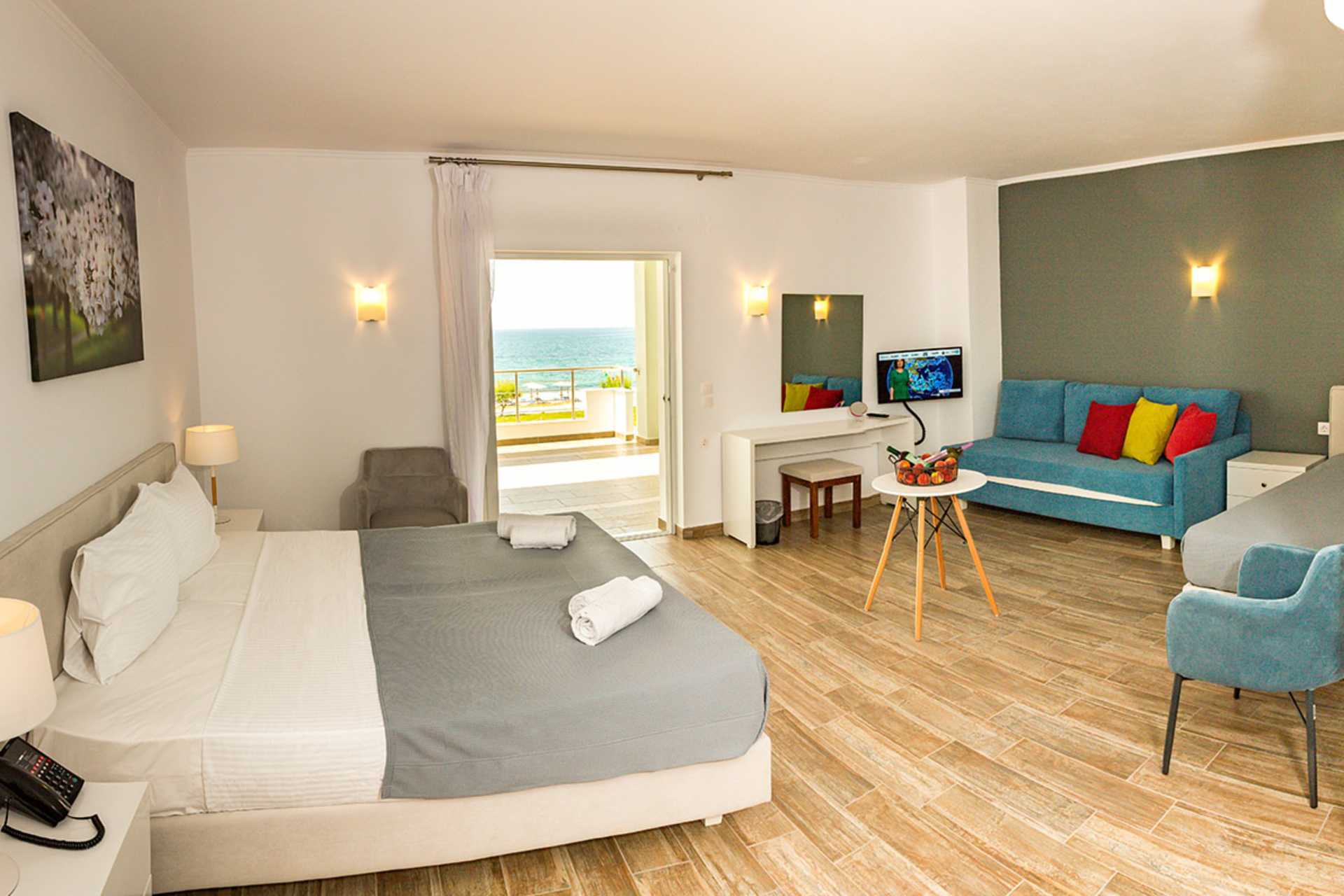 Dubbelrum med balkong. En dubbelsäng eller två enkelsängar. Möjlighet till extrabädd i enkelsäng eller i bäddsoffa. Wifi, luftkonditionering och deponering ingår. Kylskåp. Tv med internationella kanaler. Hårtork. Badrum med dusch och wc. Städning 7 ggr/vecka.