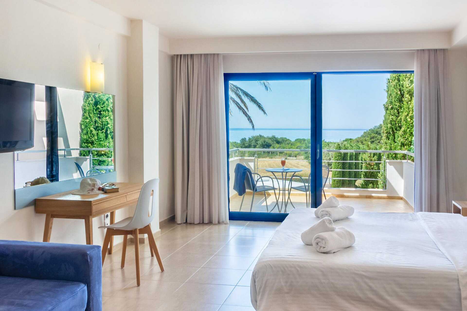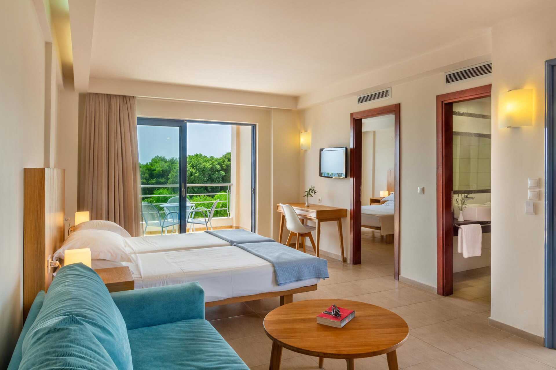 Familjerum deluxe med balkong och begränsad havsutsikt. Familjerummet består av ett sovrum och ett vardagsrum. En dubbelsäng eller två enkelsängar. I vardagsrummet står två enkelsängar och i bäddsoffan finns möjlighet till extrabäddar för två barn. Wifi, luftkonditionering och deponering ingår. Kylskåp. Vattenkokare. Tv med internationella kanaler. Tofflor. Hårtork. Badrum med dusch och wc. Städning 7 ggr/vecka.