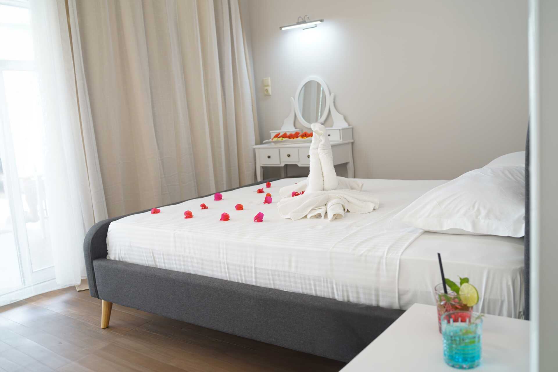 Dubbelrum med balkong och begränsad havsutsikt eller med markterrass och begränsad havsutsikt. En dubbelsäng eller två enkelsängar. Möjlighet till extrabädd i bäddsoffa. Wifi, luftkonditionering och deponering ingår. Minibar. Vattenkokare samt kaffe och te. Tv med internationella kanaler. Badrockar och tofflor. Hårtork. Badrum med dusch och wc. Städning 7 ggr/vecka.