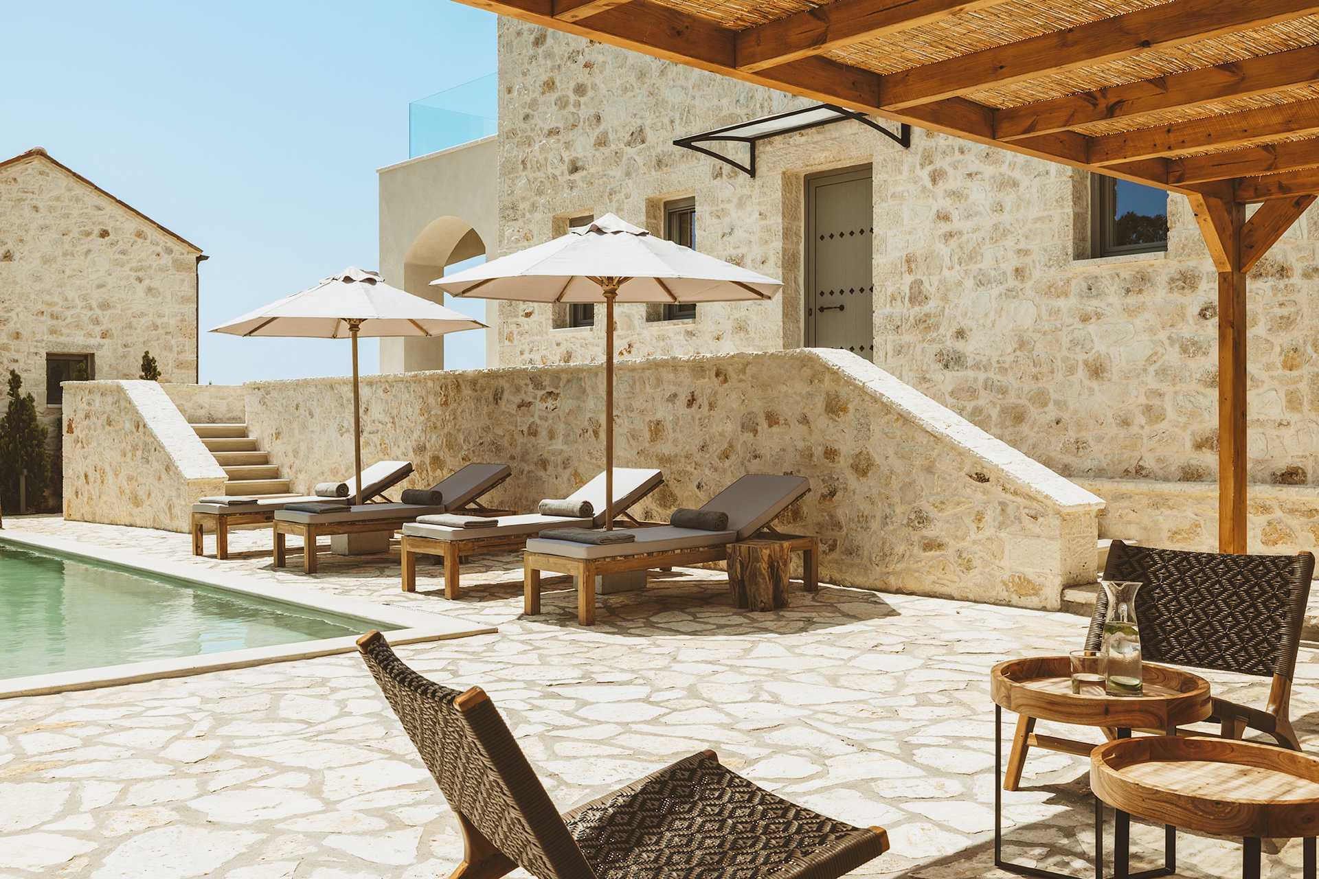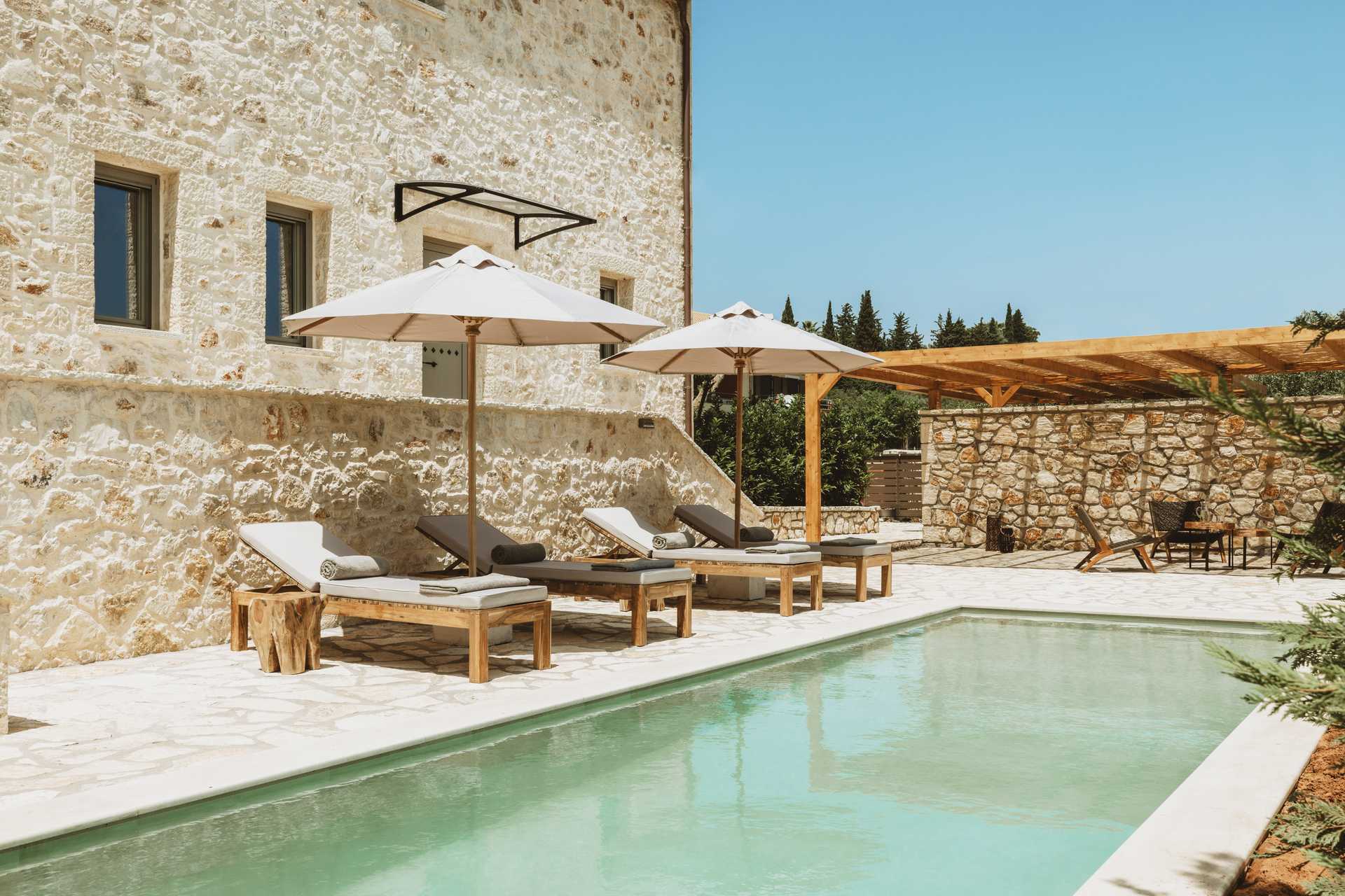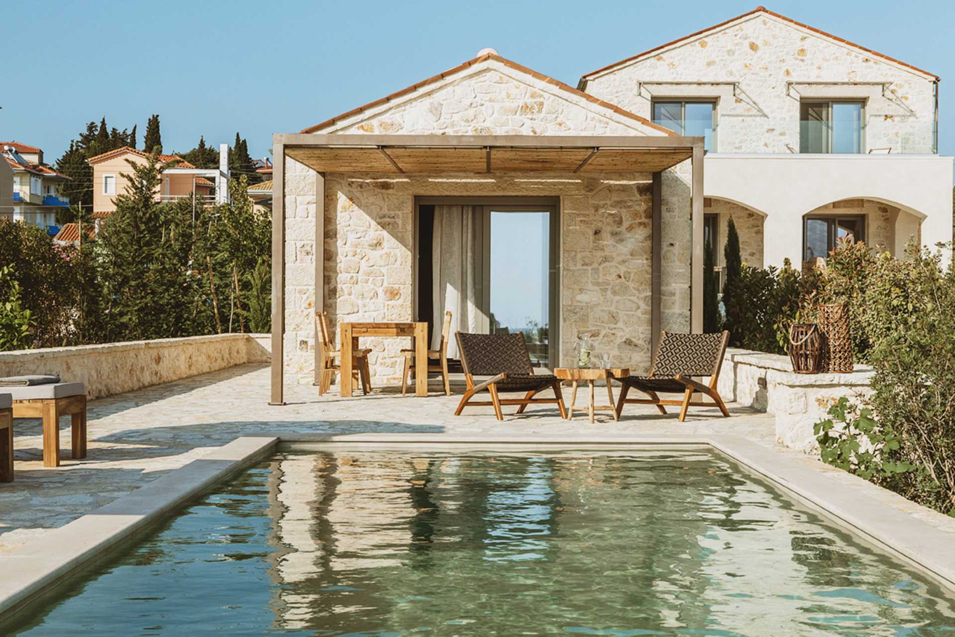 Trerumsvilla med privat pool. På uteplatsen finns ett matbord, loungemöbler samt solstolar och parasoller vid poolen. Villan består av två våningar med öppen planlösning mellan våningarna. På entréplan finns ett vardagsrum med öppen spis, minikök samt wc. En trappa upp finns två sovrum, balkong och ett badrum. En dubbelsäng eller två enkelsängar i sovrummen. Möjlighet till extrabäddar i bäddsoffa. Minikök med spis, kylskåp och frys och bra köksutrustning. Wifi, luftkonditionering och deponering ingår. Tv med internationella kanaler. Strykjärn och strykbräda. Poolhanddukar. Badrockar och tofflor. Hårtork. Badrum med dusch och wc. Städning 5 ggr/vecka. Trappor inom och utanför villan, bland annat till poolen.