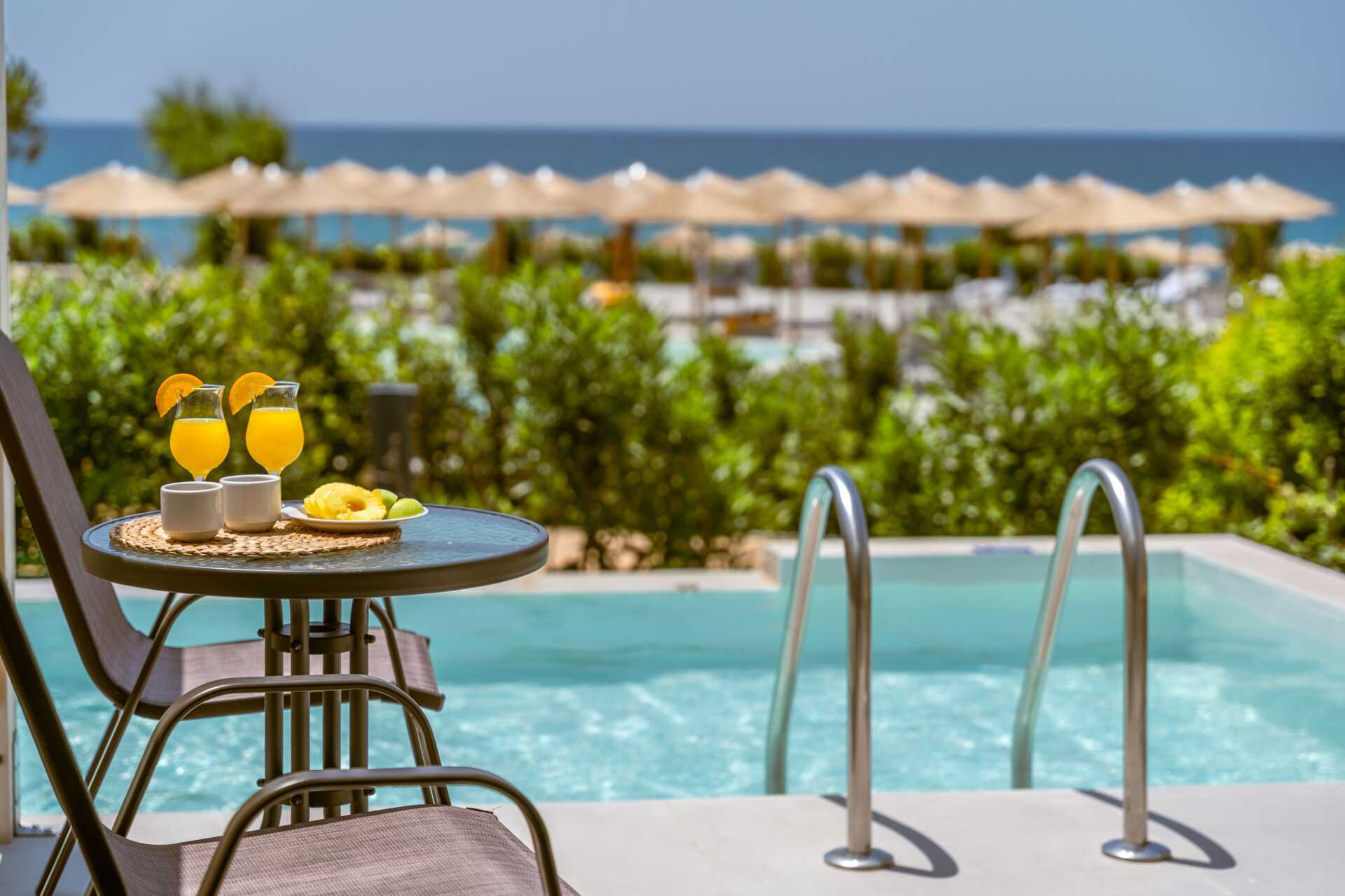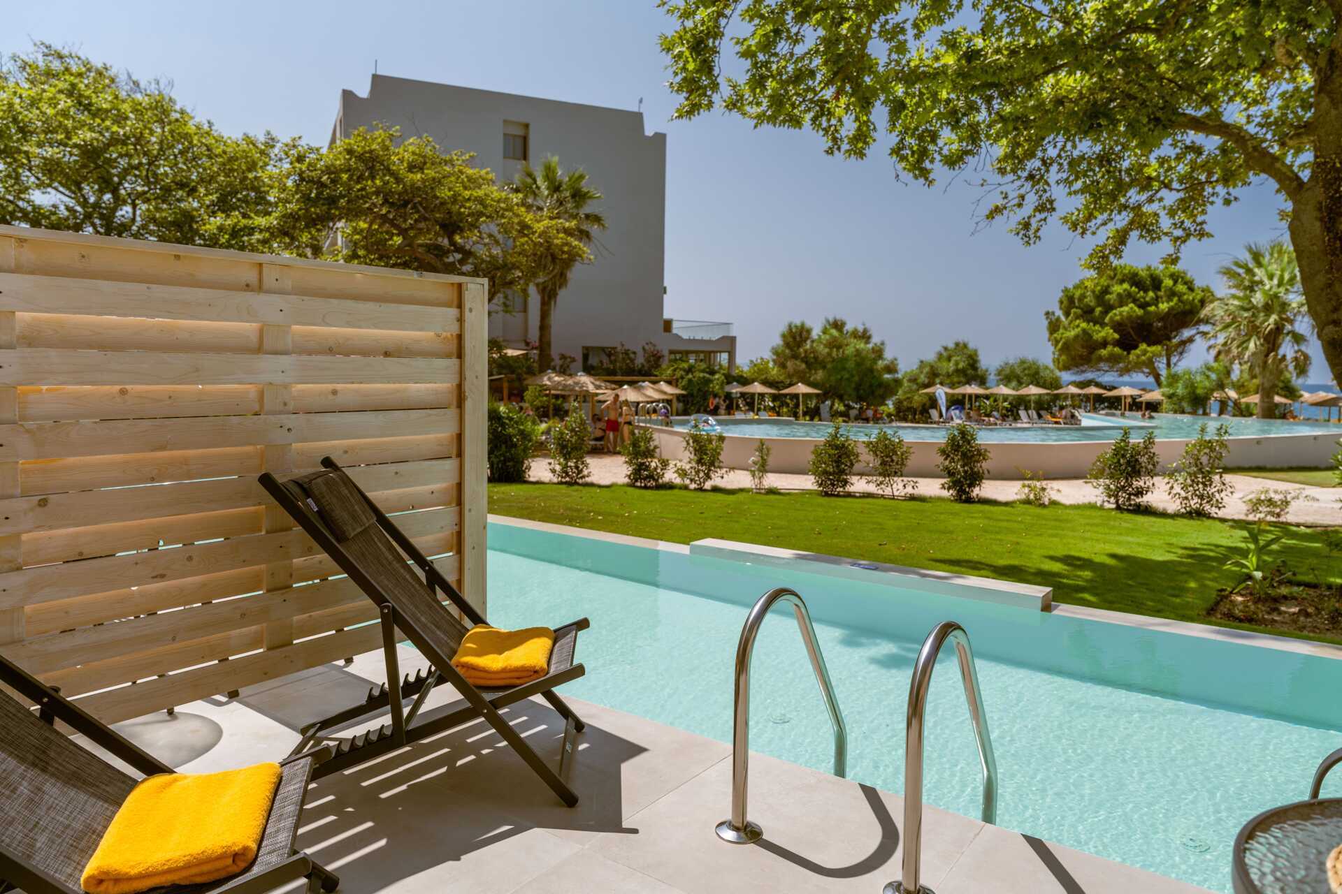 Juniorsvit med havsutsikt och uteplats med direkt utgång till en delad pool. På uteplatsen finns bord och stolar. Sviterna ligger i sidobyggnaderna. En dubbelsäng. Möjlighet till extrabädd i bäddsoffa. Wifi, luftkonditionering och deponering ingår. Kylskåp. Nespresso kaffemaskin. Tv med internationella kanaler. Hårtork. Badrum med dusch och wc. Städning 7 ggr/vecka. Barn under två år räknas in i max antal personer i rummet.