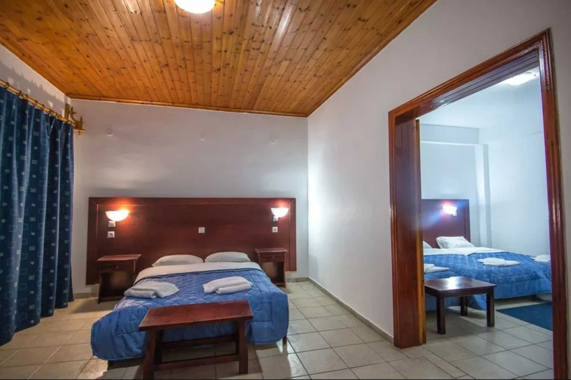 Familjerum med balkong och havsutsikt. Familjerummet består av två sovrum och ett badrum. Ett sovrum med en dubbelsäng och ett sovrum med två enkelsängar. Wifi och luftkonditionering ingår. Kylskåp. Tv med lokala kanaler. Badrum med dusch och wc. Städning 7 ggr/vecka. Barn under två år räknas in i maxantalet personer i rummet.