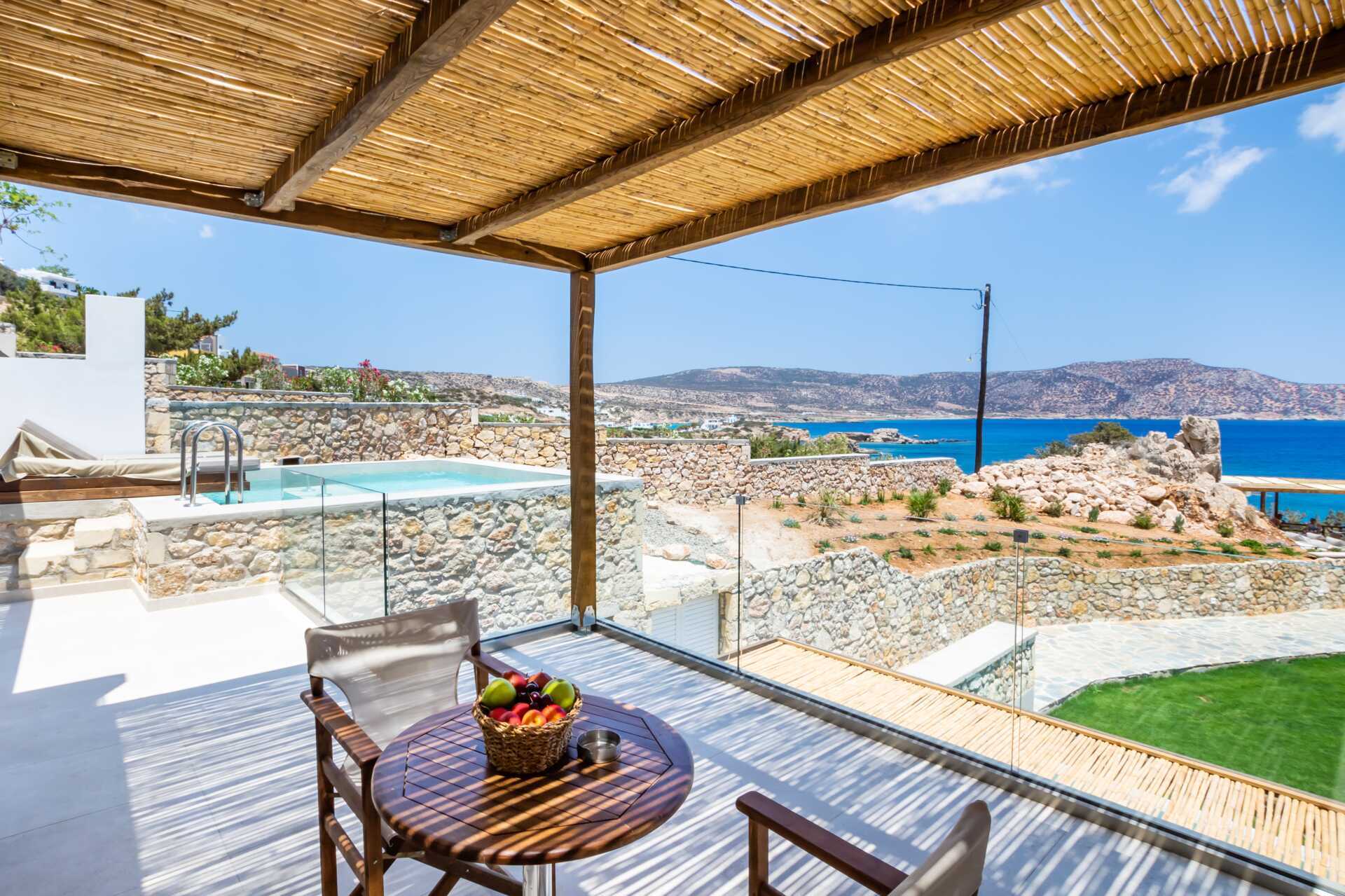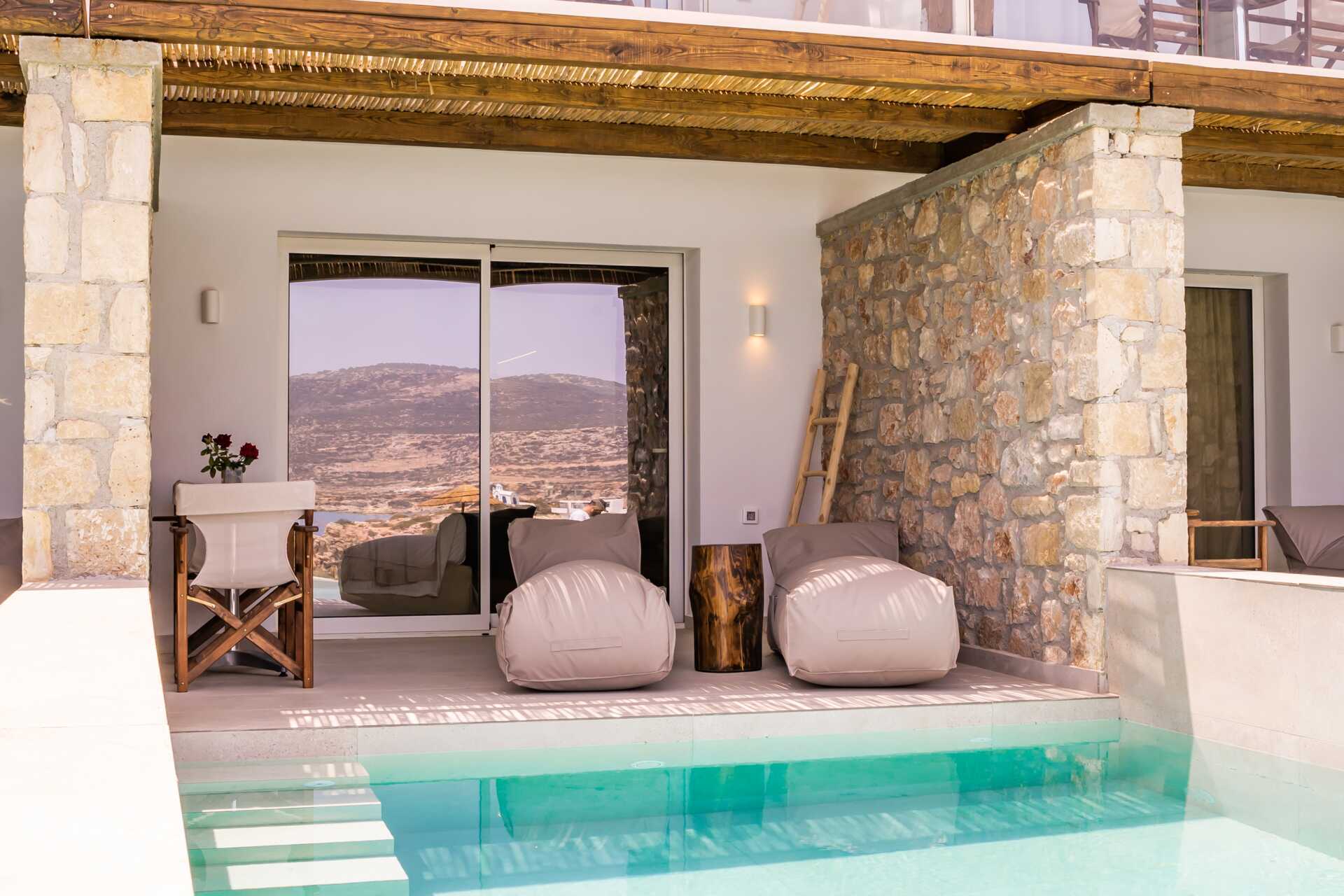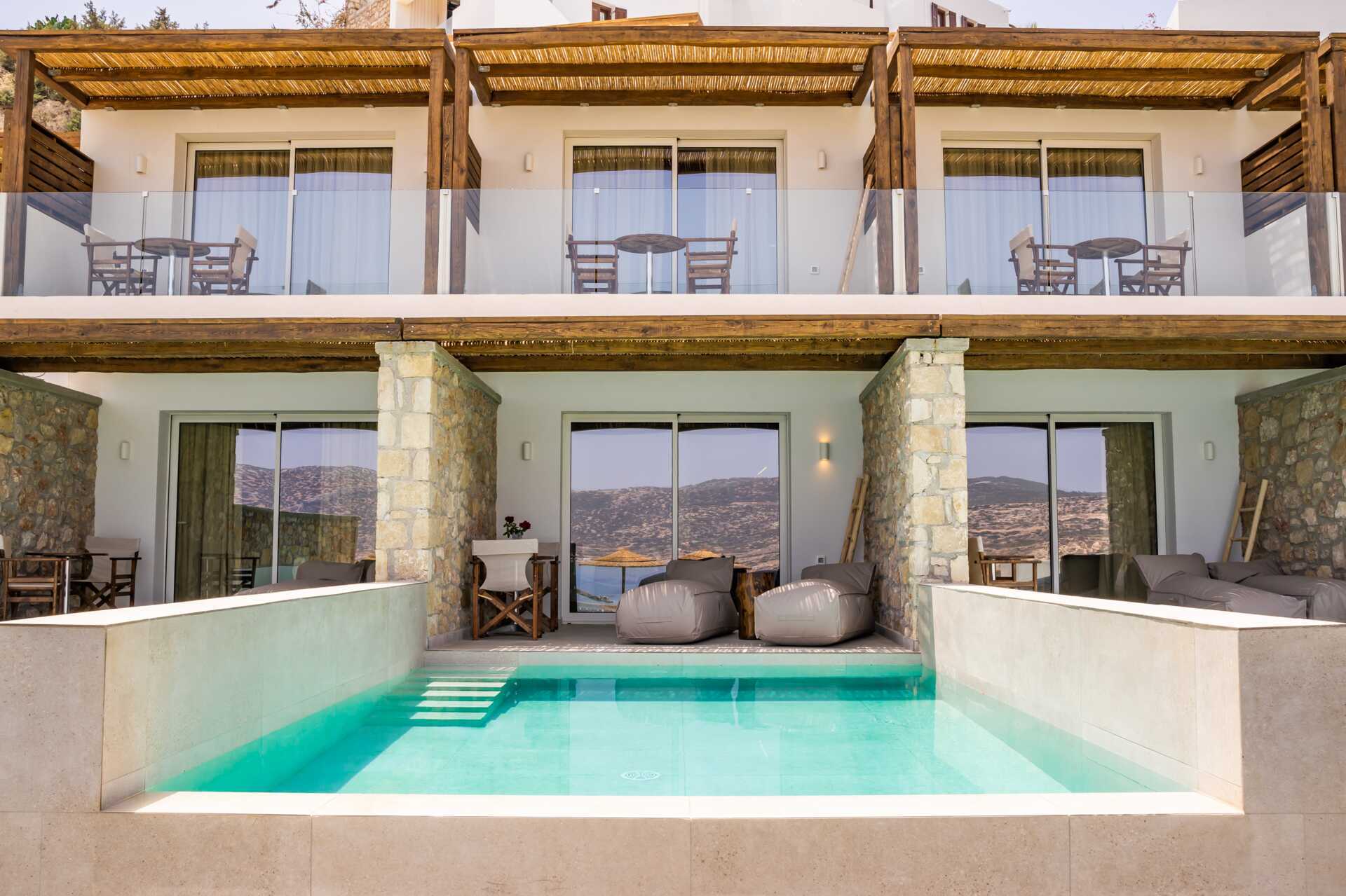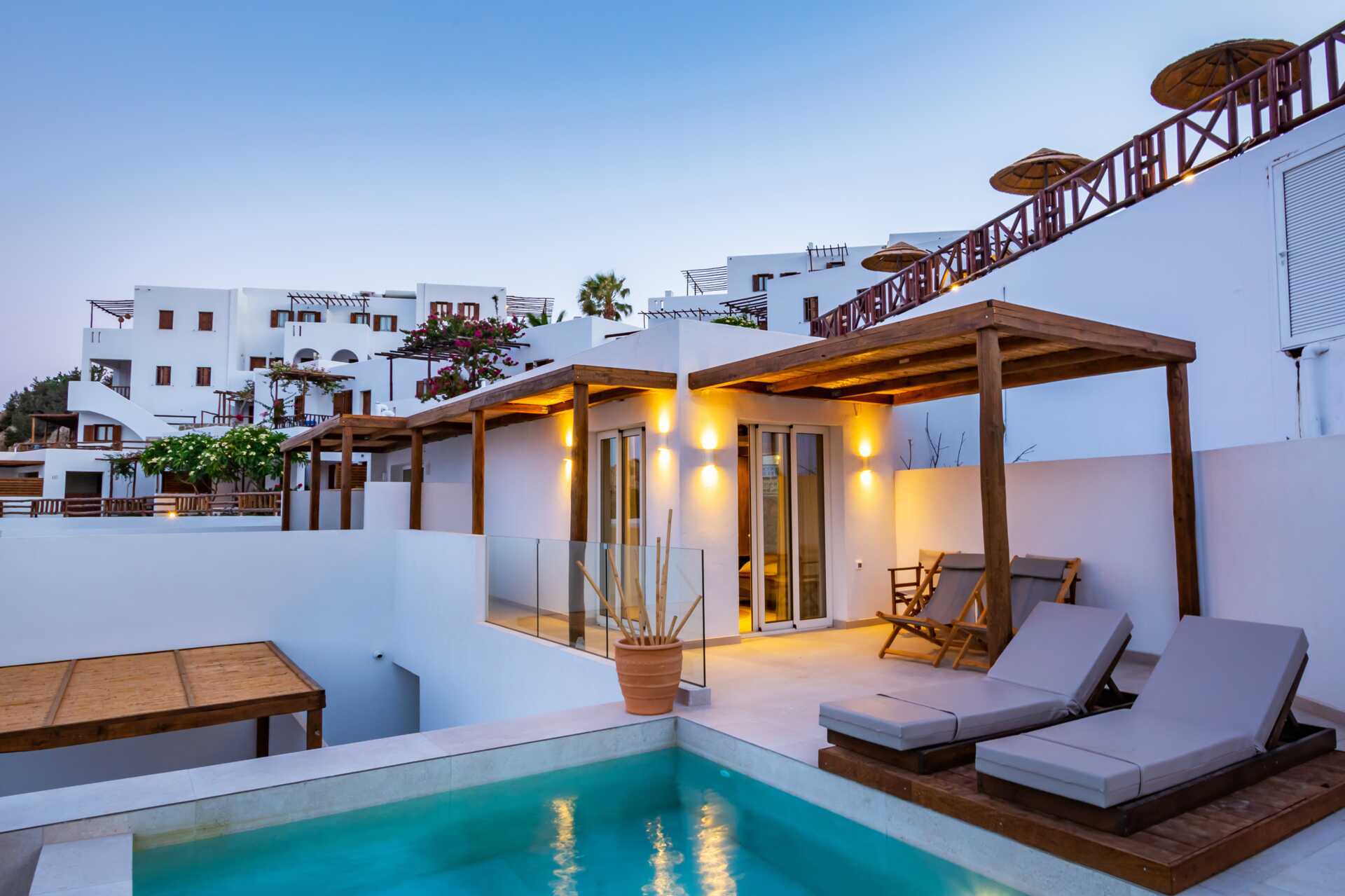 Deluxesvit med privat pool och havsutsikt från markterrassen. En dubbelsäng. Wifi, deponering och luftkonditionering ingår. Minibar. Vattenkokare samt kaffe och te. Kaffemaskin, fyra kaffekapslar ingår, önskas fler finns det att köpa i hotelbaren. Tv med internationella kanaler. Hårtork. Badrum med badkar eller dusch samt wc. Städning 6 ggr/vecka.