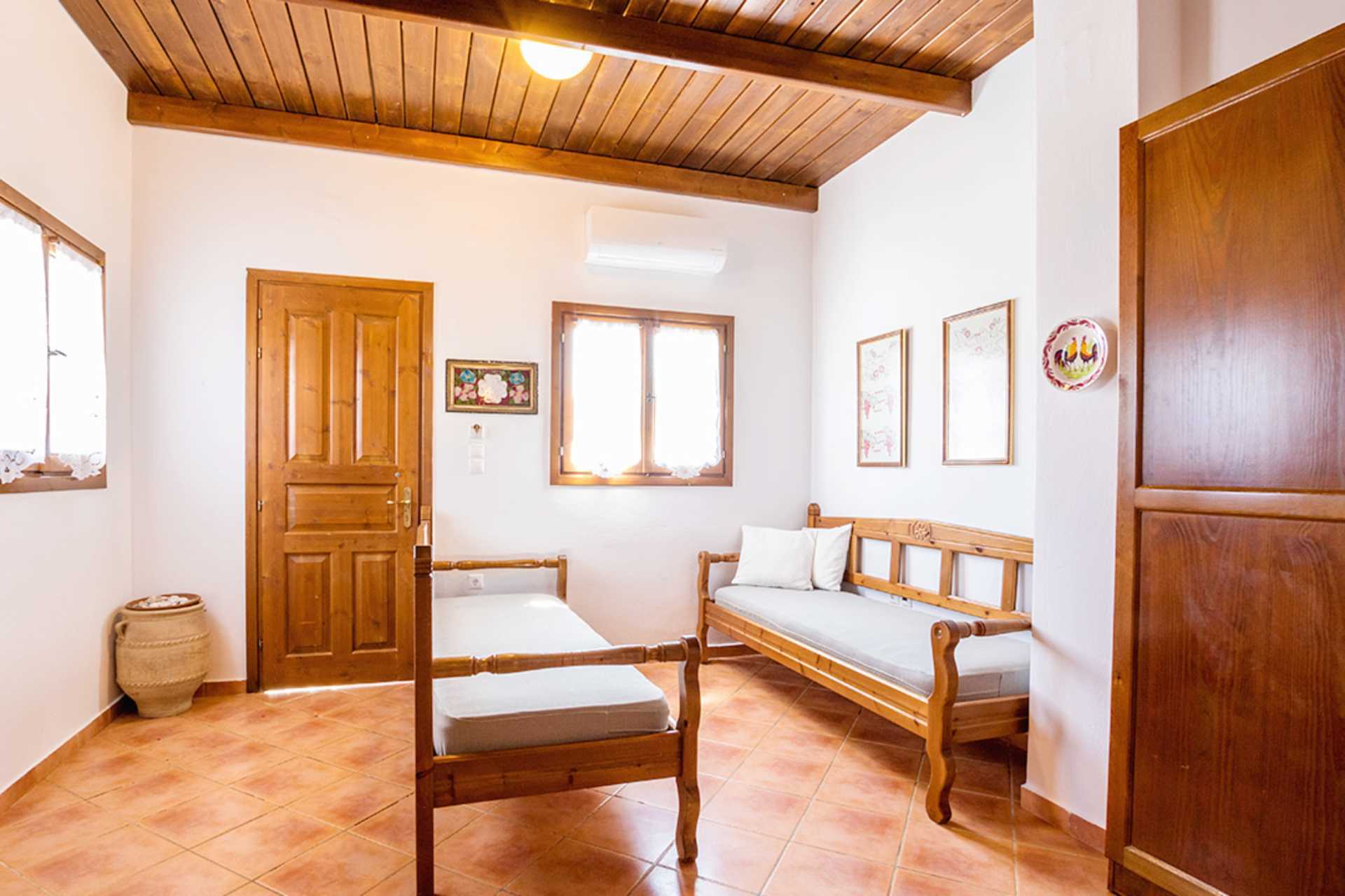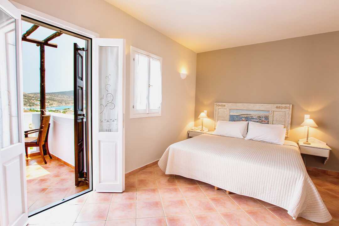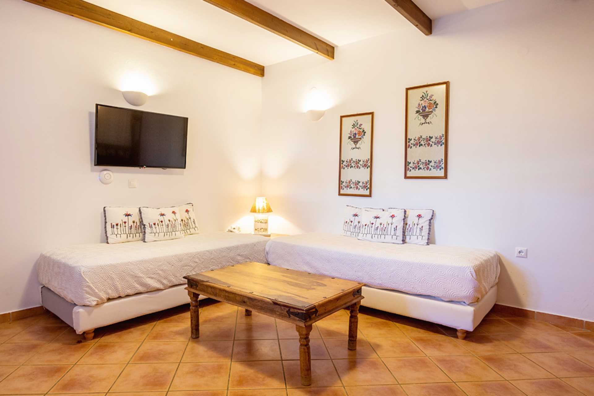 Familjerum med balkong eller terrass med begränsad havsutsikt. Familjerummet består av två delar i öppen planlösning, en del med vardagsrum/minikök och en sovrumsdel som nås med några trappsteg. En dubbelsäng och två enkelsängar. Extrabädd är i befintliga sängar. Minikök med kylskåp, kokplattor, vattenkokare samt kaffe och te och enkel köksutrustning. Kaffemaskin, fyra kaffekapslar ingår, önskas fler finns det att köpa i hotelbaren. Wifi, deponering och luftkonditionering ingår. Tv med internationella kanaler. Hårtork. Badrum med dusch och wc. Städning 6 ggr/vecka.