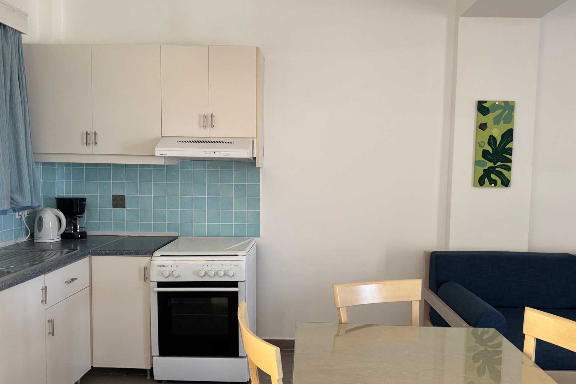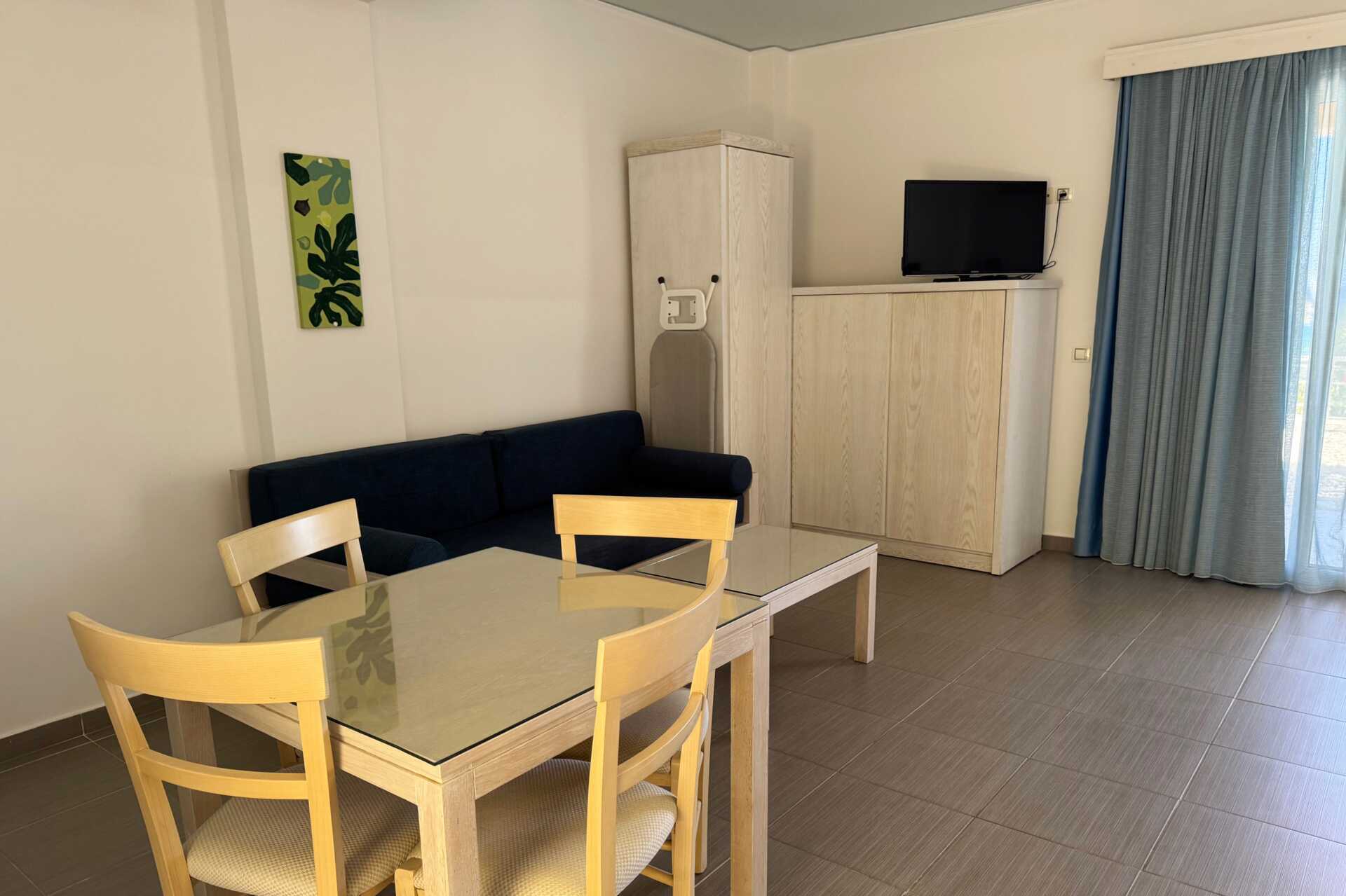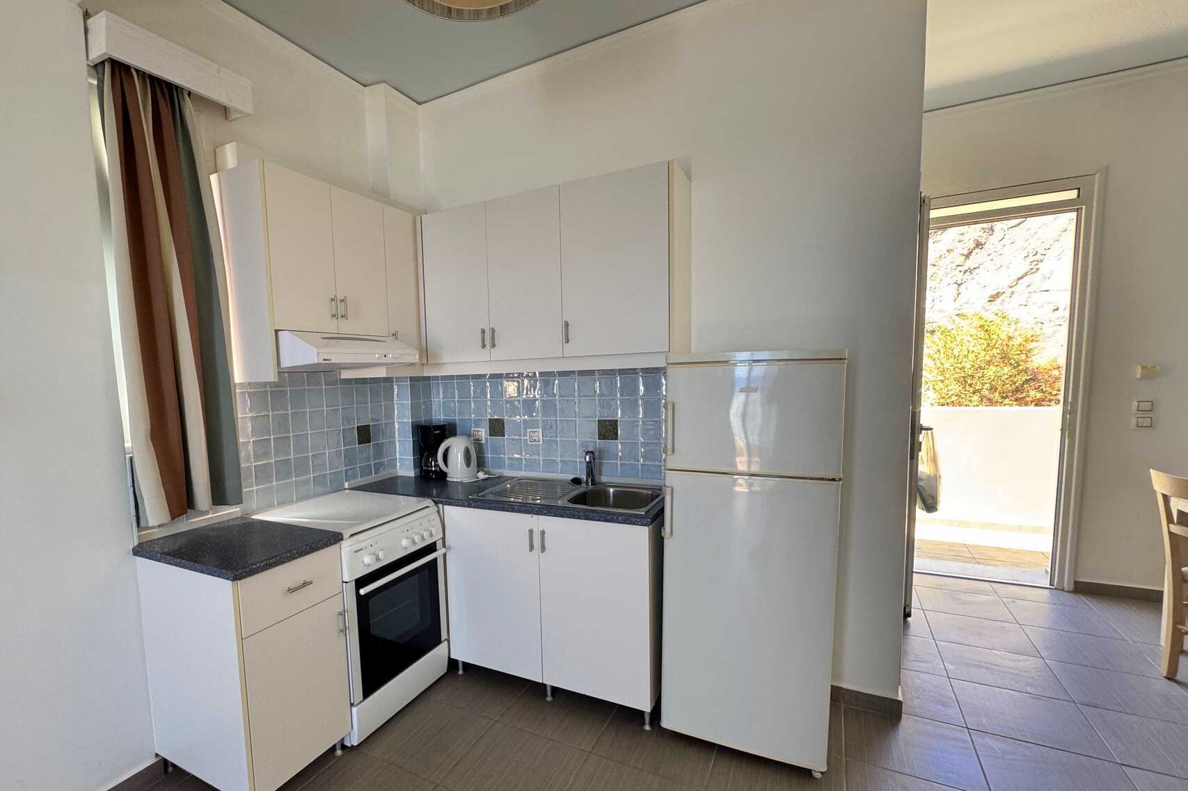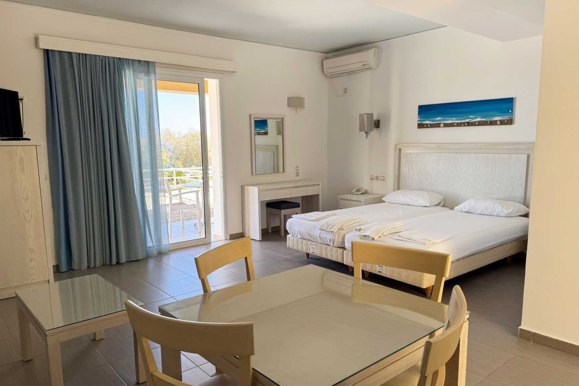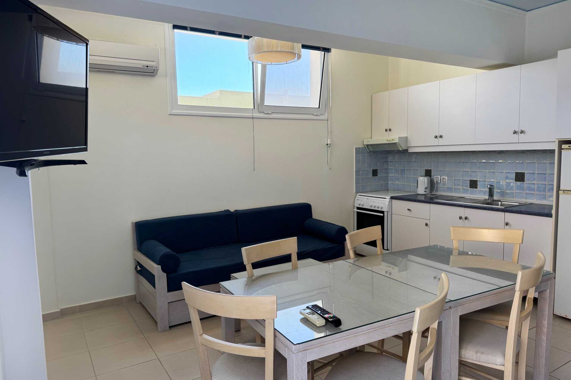 Enrumslägenheter med balkong eller markbalkong och med havsutsikt. Kombinerat sovrum med minikök. En dubbelsäng. Möjlighet till extrabädd i bäddsoffa. Minikök med ugn, spis, kylskåp, kaffebryggare, vattenkokare, brödrost, juicepress, smörgåsgrill, elvisp och enkel köksutrustning. Luftkonditionering och deponering ingår. Tv med internationella kanaler. Strykjärn och strykbräda. Hårtork. Badrum med dusch och wc. Städning 6 ggr/vecka.
