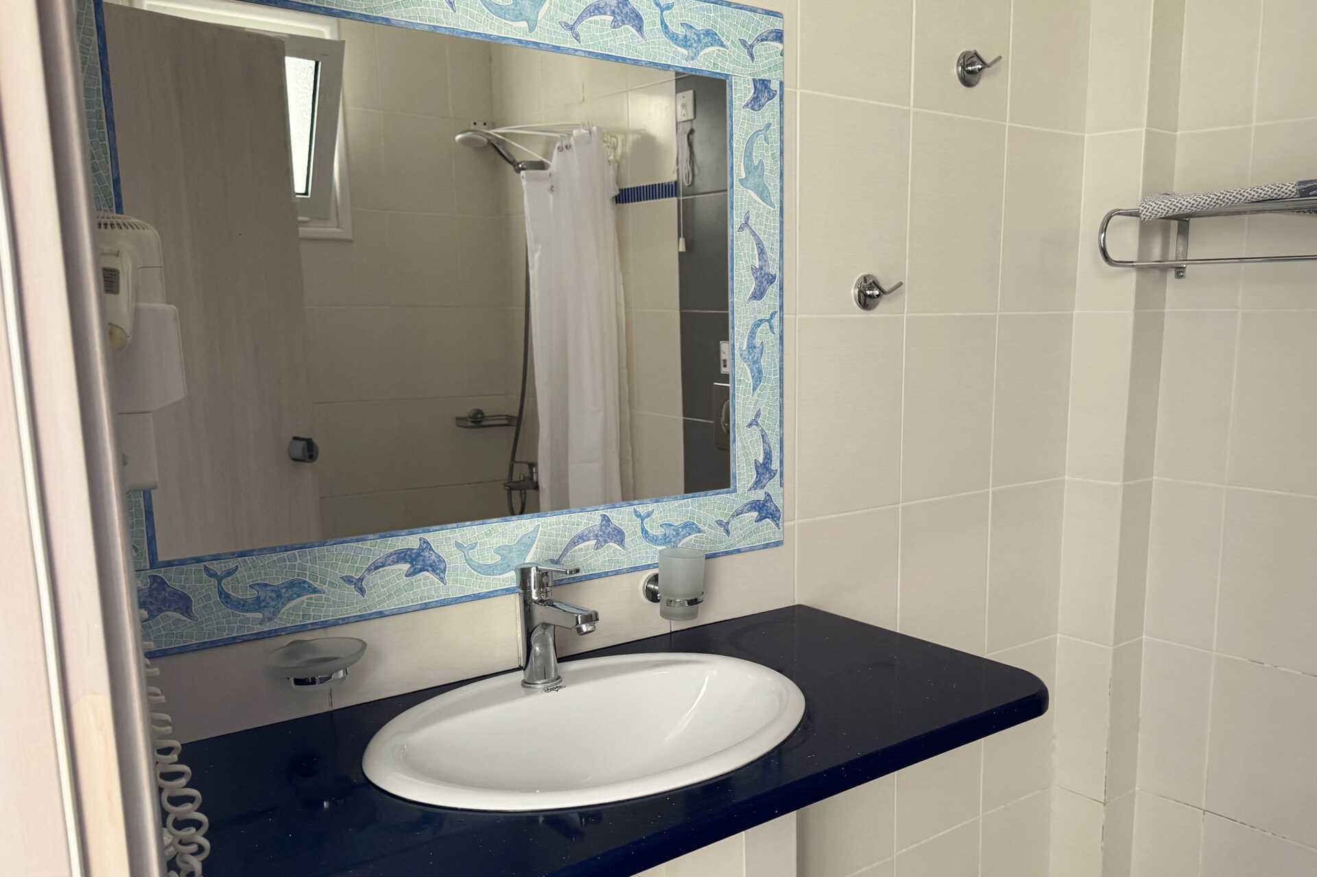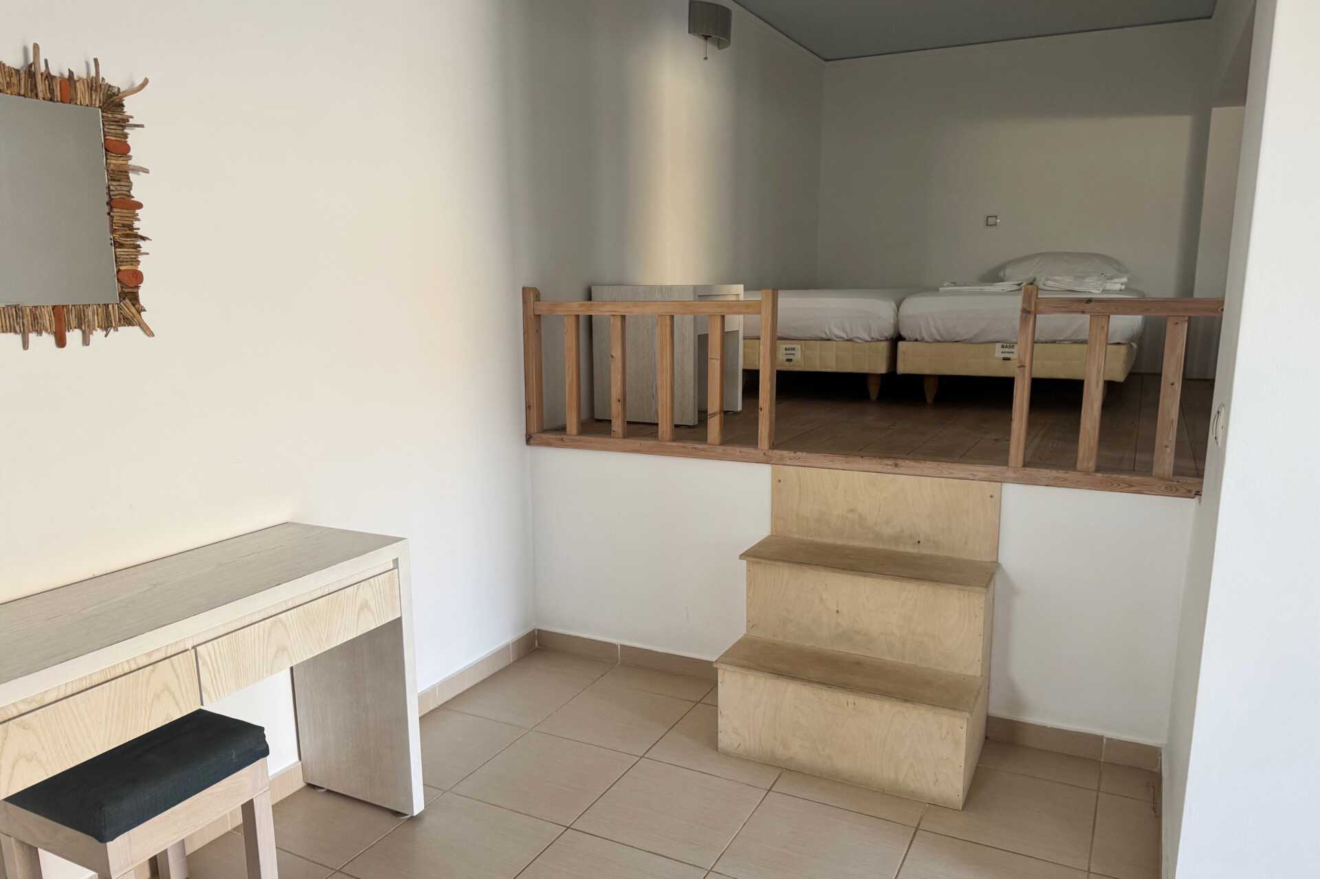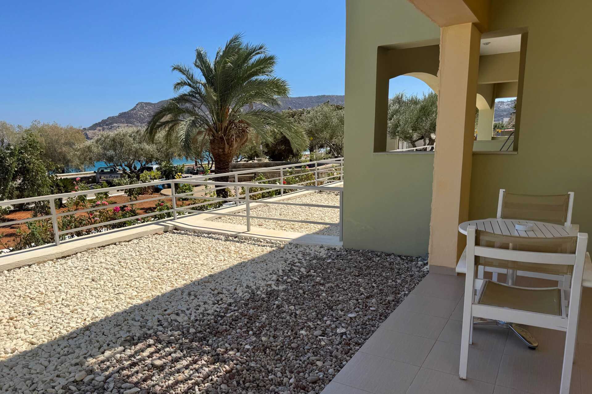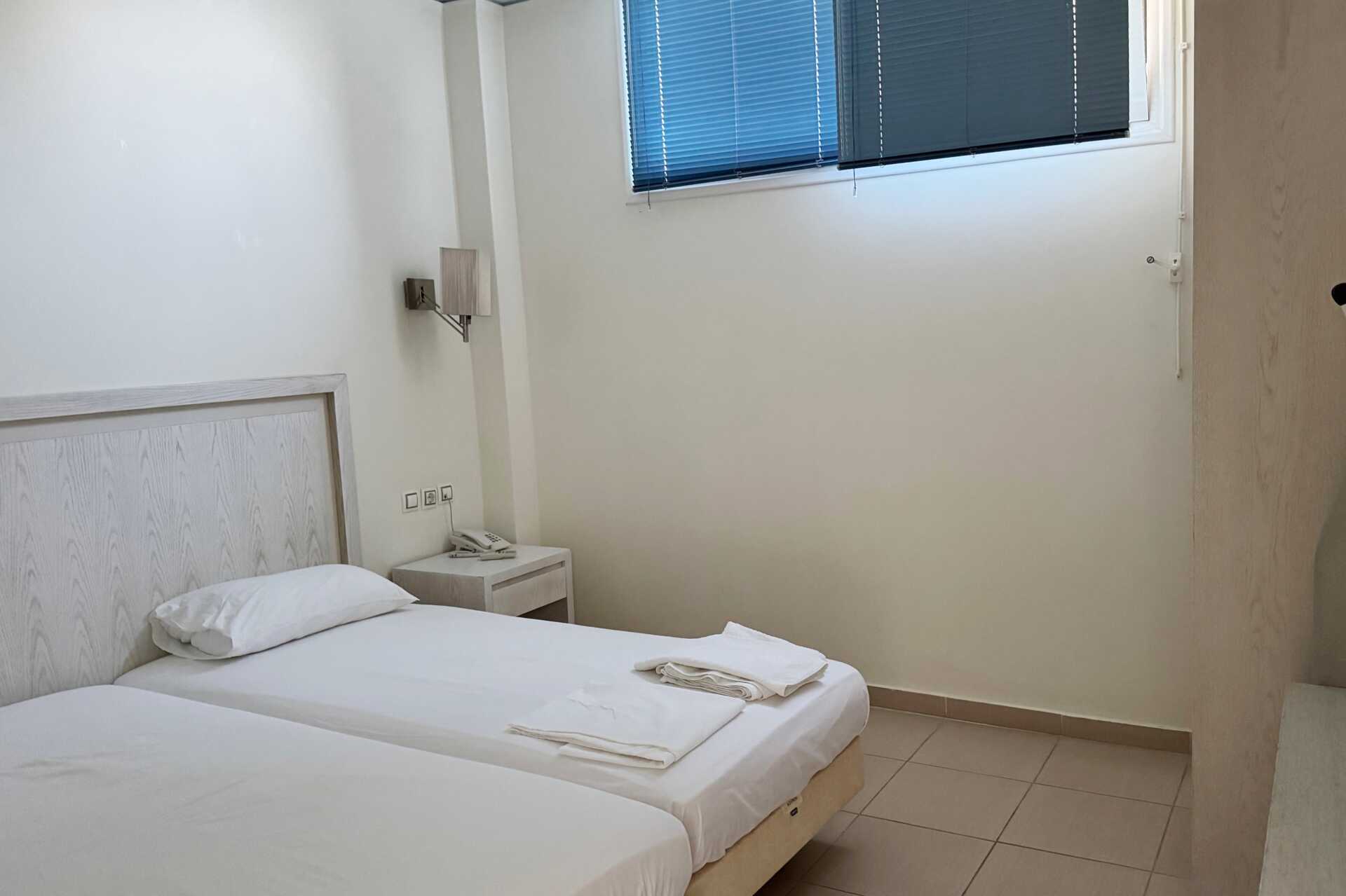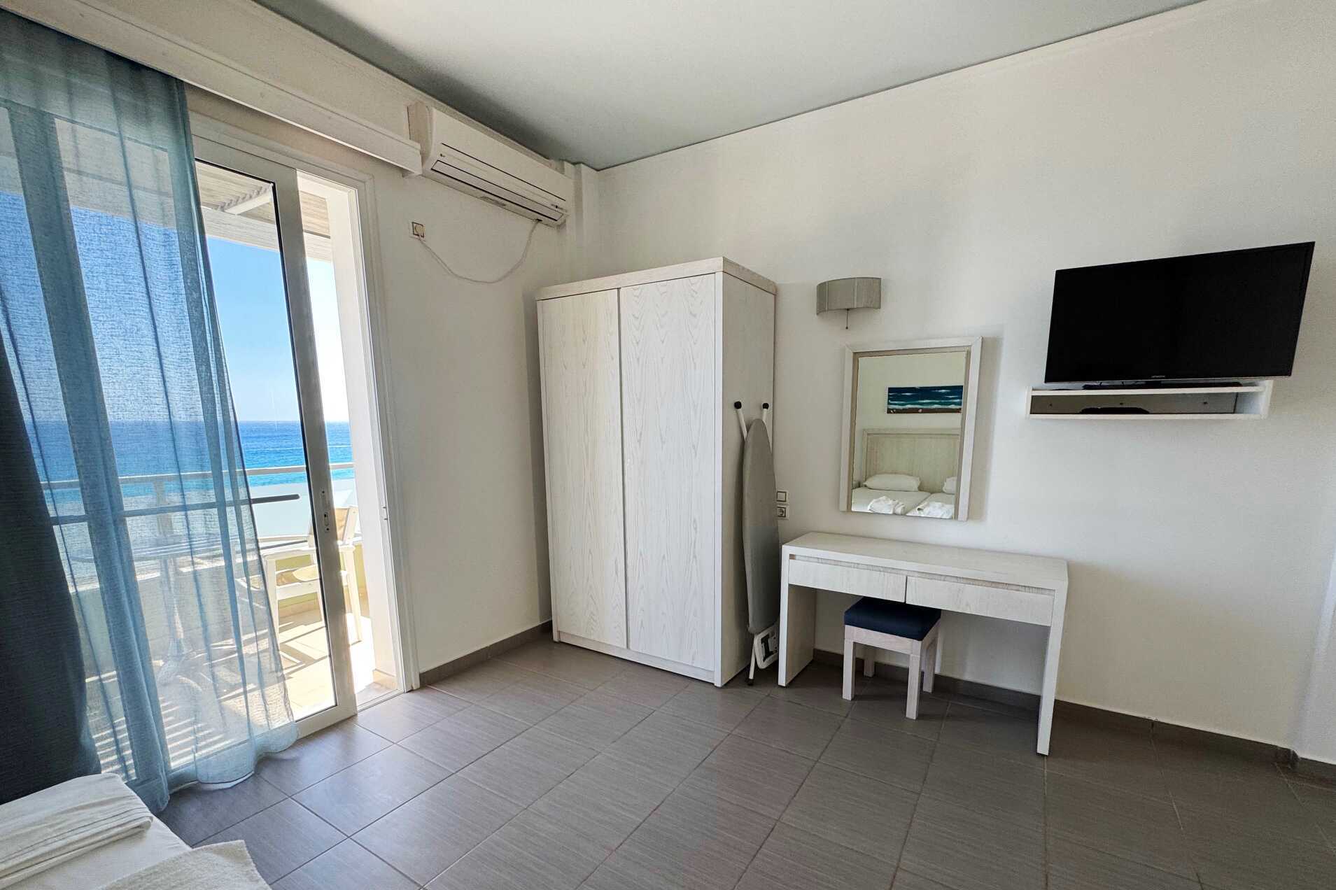 Enrumslägenheter med balkong eller markbalkong och med havsutsikt. Kombinerat sovrum med minikök. En dubbelsäng. Möjlighet till extrabädd i bäddsoffa. Minikök med ugn, spis, kylskåp, kaffebryggare, vattenkokare, brödrost, juicepress, smörgåsgrill, elvisp och enkel köksutrustning. Luftkonditionering och deponering ingår. Tv med internationella kanaler. Strykjärn och strykbräda. Hårtork. Badrum med dusch och wc. Städning 6 ggr/vecka.