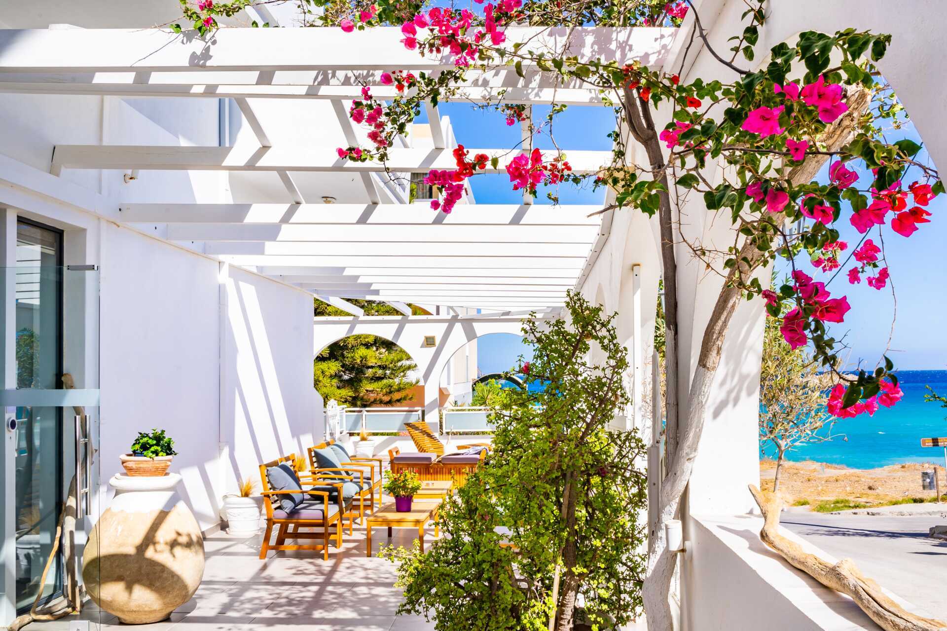 Tvårumslägenhet med balkong, vissa med begränsad havsutsikt eller med havsutsikt. Sovrum och kombinerat vardagsrum med minikök. Två enkelsängar. Möjlighet till extrabäddar i två bäddsoffor. Minikök med kylskåp, kokplattor, kaffemaskin - två kapslar ingår, vattenkokare, brödrost och enkel köksutrustning. Wifi, luftkonditionering och deponering ingår. Tv med internationella kanaler. Bluetooth-högtalare. Tofflor. Hårtork. Badrum dusch och wc. Städning 6 ggr/vecka.