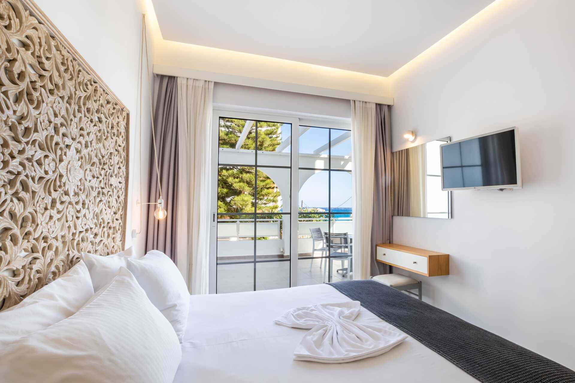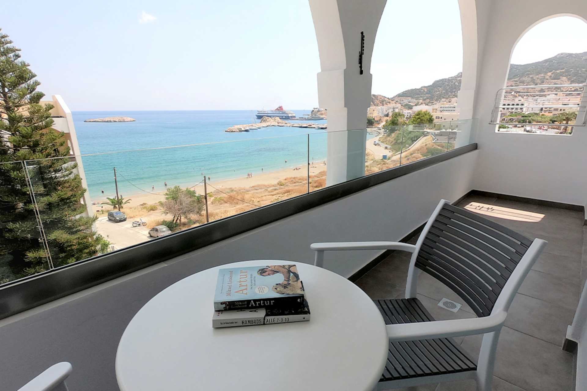 Deluxesvit med stor balkong och begränsad havsutsikt. Sovrum och kombinerat vardagsrum med minikök. Två enkelsängar. Möjlighet till extrabäddar i två bäddsoffor. Minikök med kylskåp, kokplattor, kaffemaskin - två kapslar ingår, vattenkokare, brödrost och enkel köksutrustning. Wifi, luftkonditionering och deponering ingår. Tv med internationella kanaler. Bluetooth-högtalare. Tofflor. Hårtork. Badrum dusch och wc. Städning 6 ggr/vecka.