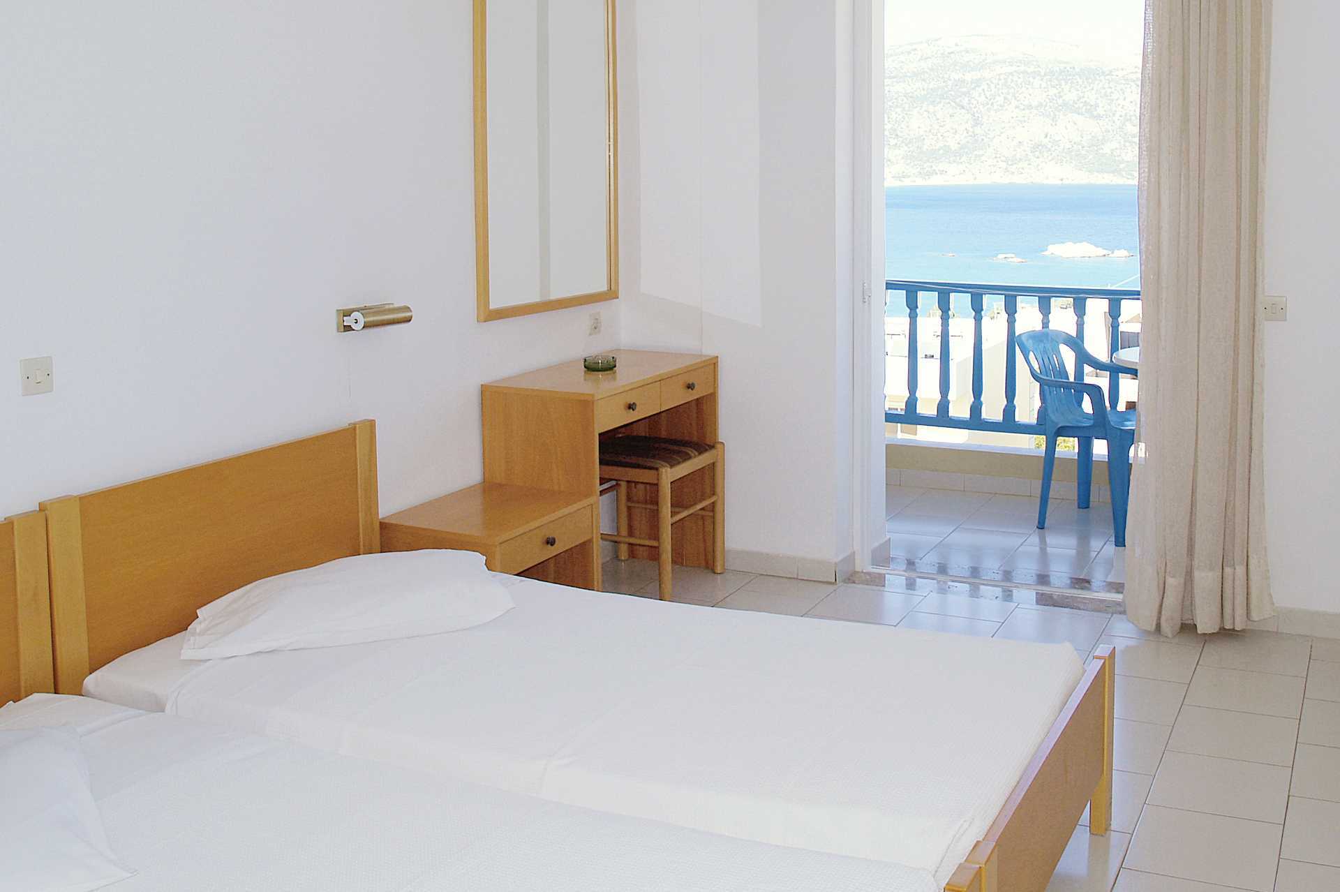 Dubbelrum med balkong. Två enkelsängar. Möjlighet till en extrabädd för barn. Wifi och luftkonditionering ingår. Kylskåp. Tv med internationella kanaler. Hårtork. Badrum med dusch och wc. Städning 6 ggr/vecka.