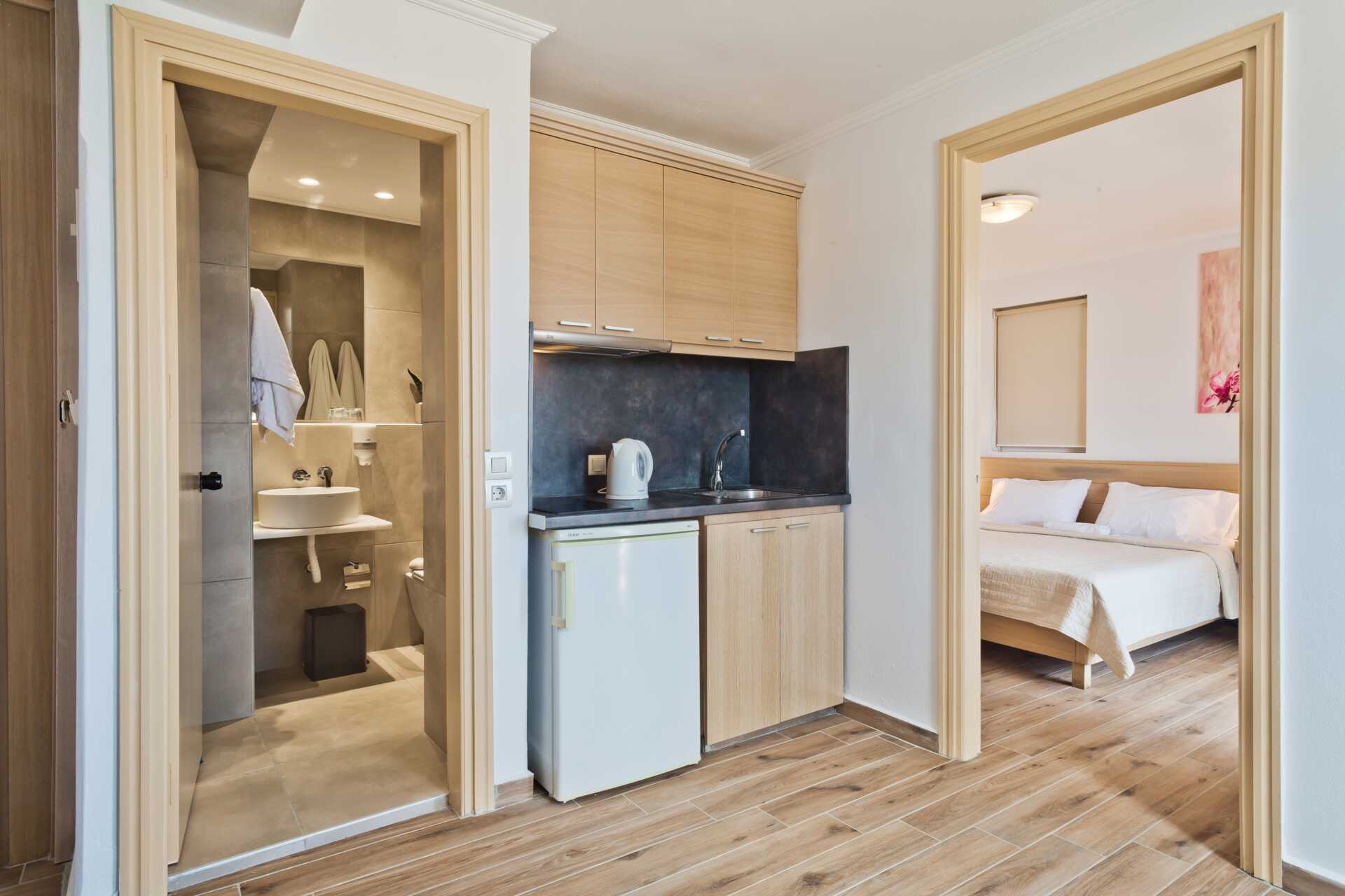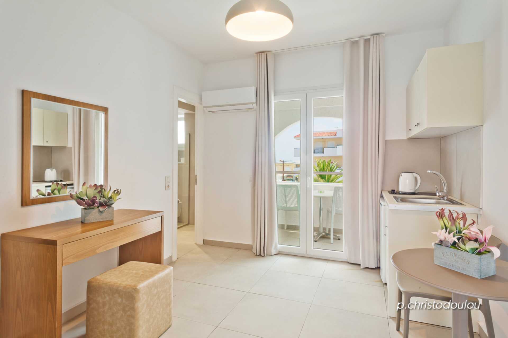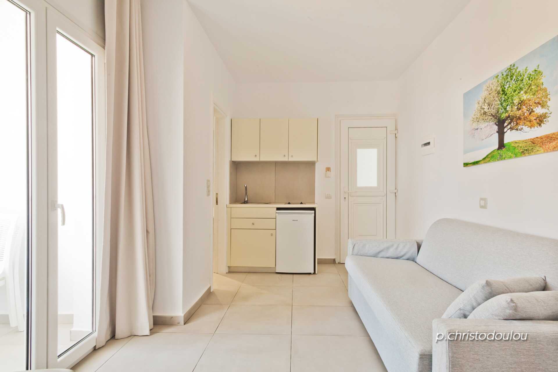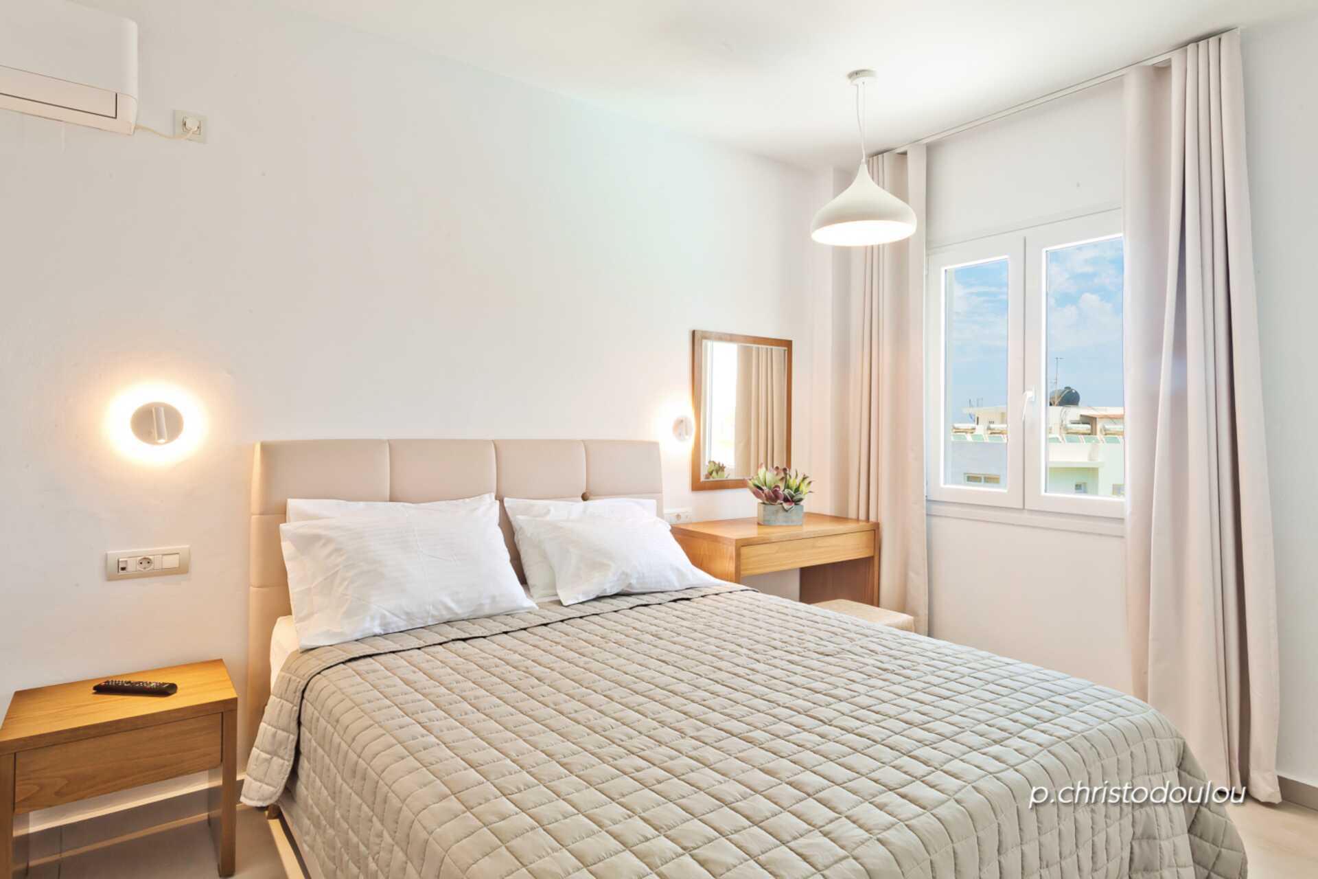 Tvårumslägenhet med balkong. Lägenheterna är belägna i byggnaden utan hiss. Sovrum och kombinerat vardagsrum med minikök. En dubbelsäng. Möjlighet till en eller två extrabäddar i bäddsoffa. När båda extrabäddarna används kan lägenheten uppfattas som trång. Minikök med kokplattor, kylskåp, vattenkokare och enkel köksutrustning. Wifi och deponering ingår. Luftkonditionering mot avgift. Tv med internationella kanaler. Badrum med dusch och wc. Städning 6 ggr/vecka.