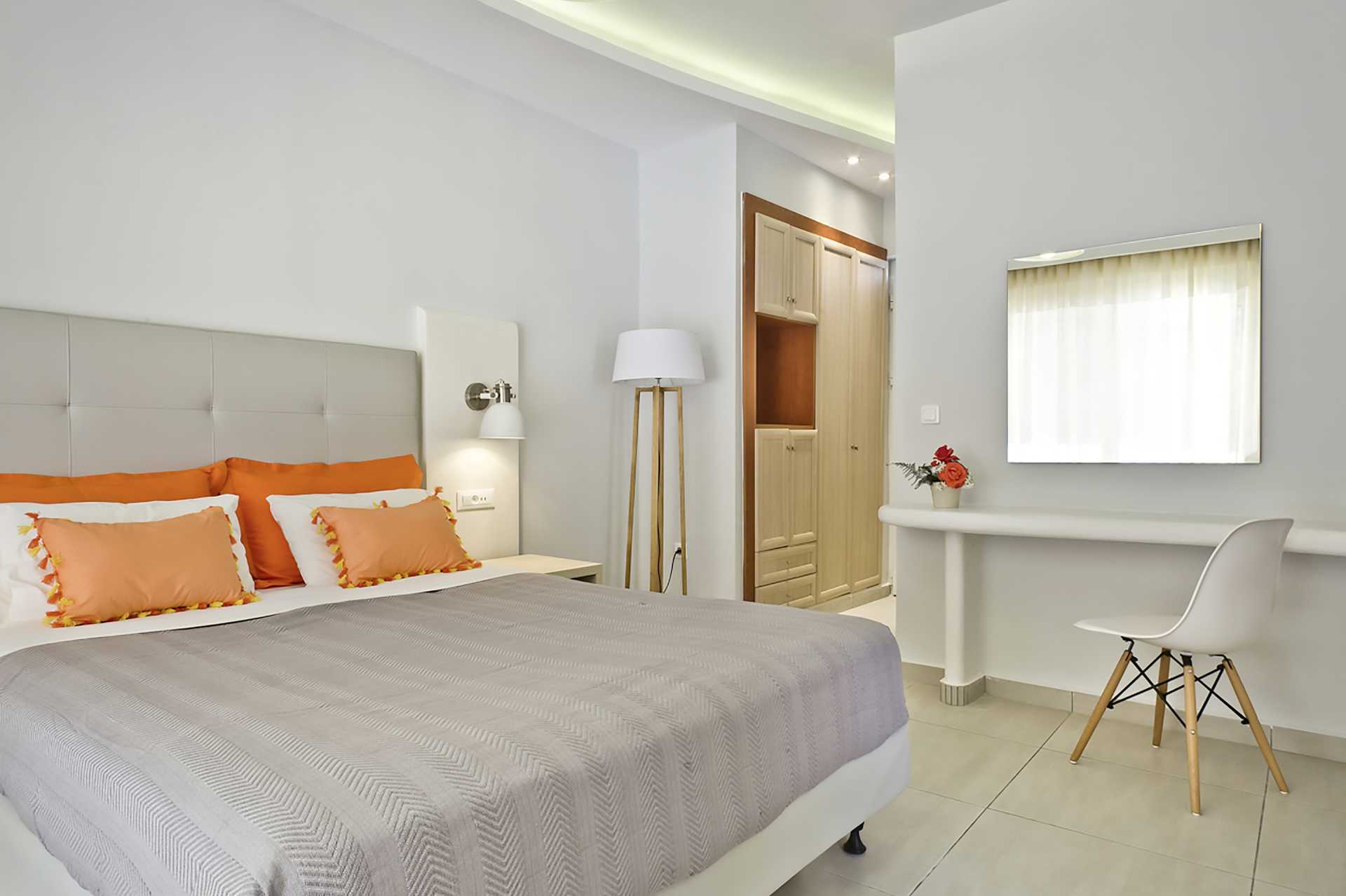 Dubbelrum med balkong. En dubbelsäng eller två enkelsängar. Wifi och deponering ingår. Luftkonditionering mot avgift. Kylskåp. Tv med internationella kanaler. Hårtork. Badrum med dusch och wc. Städning 6 ggr/vecka. Barn under två år räknas in i maxantalet personer i rummet.