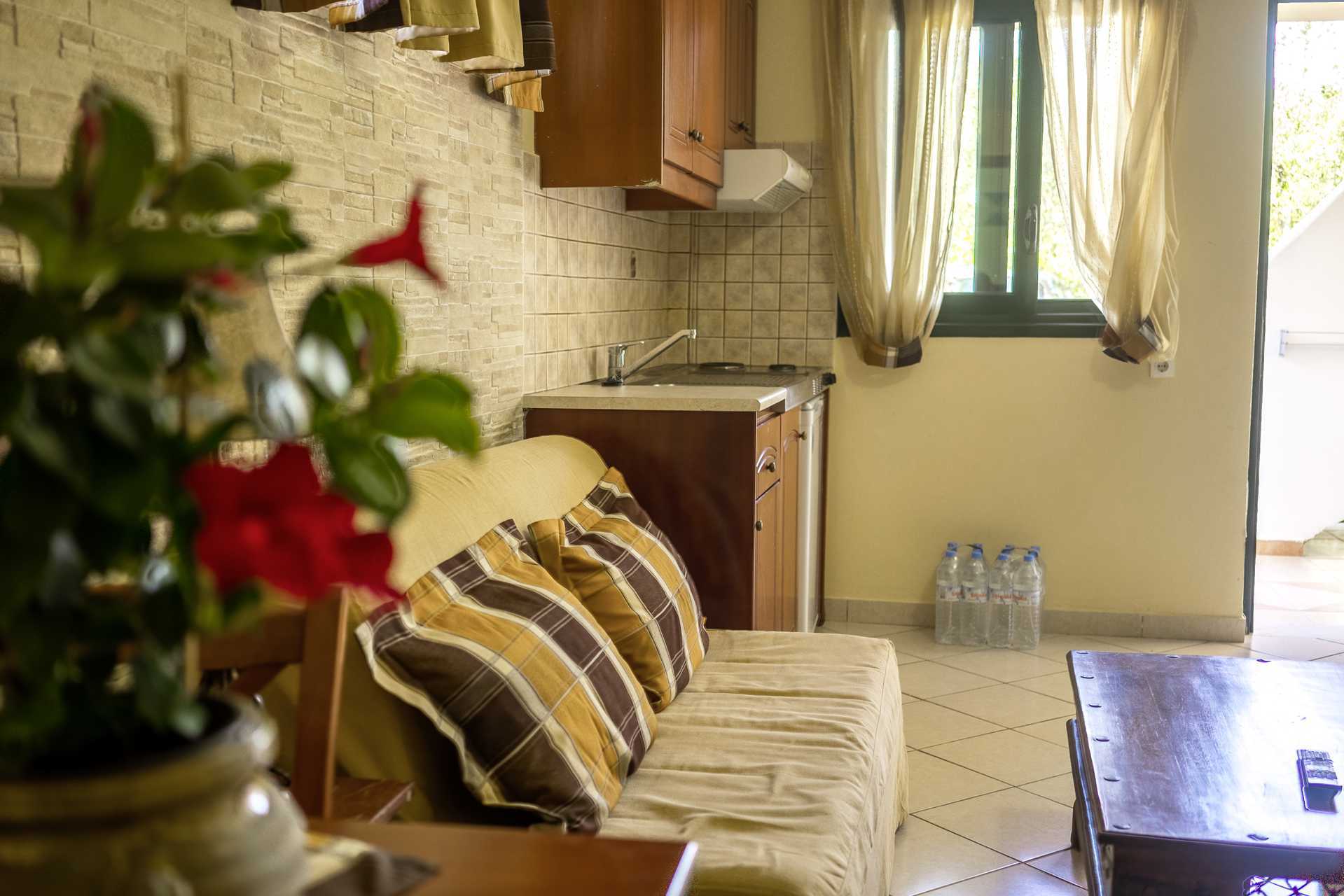 Enrumslägenheter, alla med balkong. Vissa balkonger har poolutsikt och vissa begränsad havsutsikt. Sovrum kombinerat med minikök. Två enkelsängar. Några lägenheter är inredda med traditionella karpatiska sängar. Minikök med kokplattor, kylskåp, vattenkokare och enkel köksutrustning. Wifi och deponering ingår. Luftkonditionering mot avgift. Tv med internationella kanaler. Hårtork. Badrum med dusch och wc. Städning 6 ggr/vecka.
