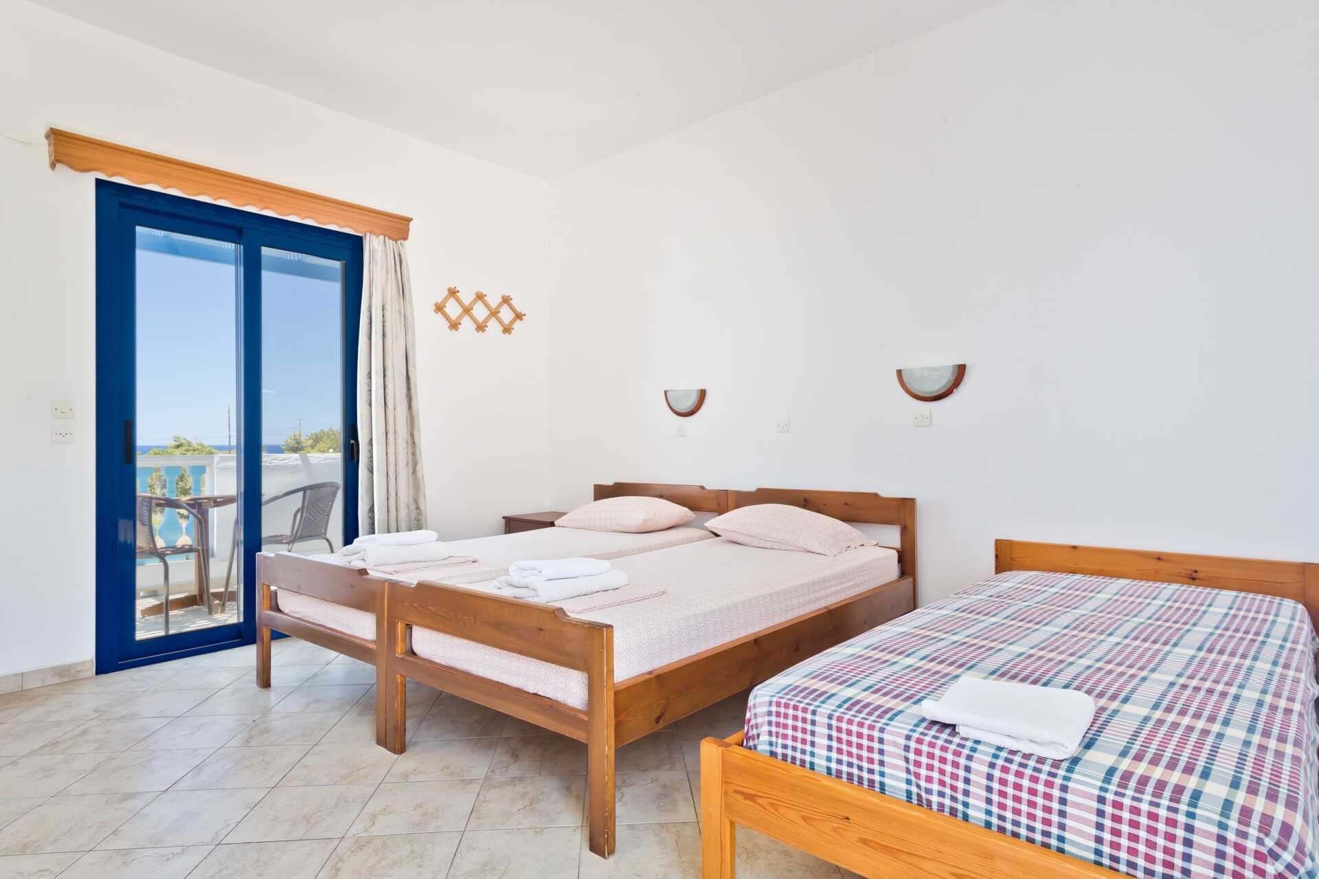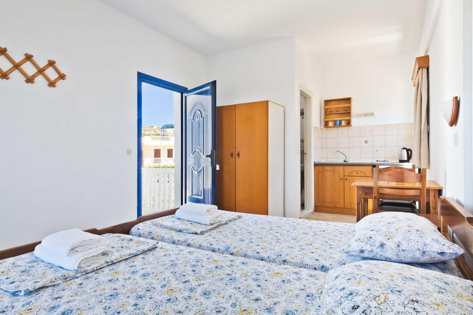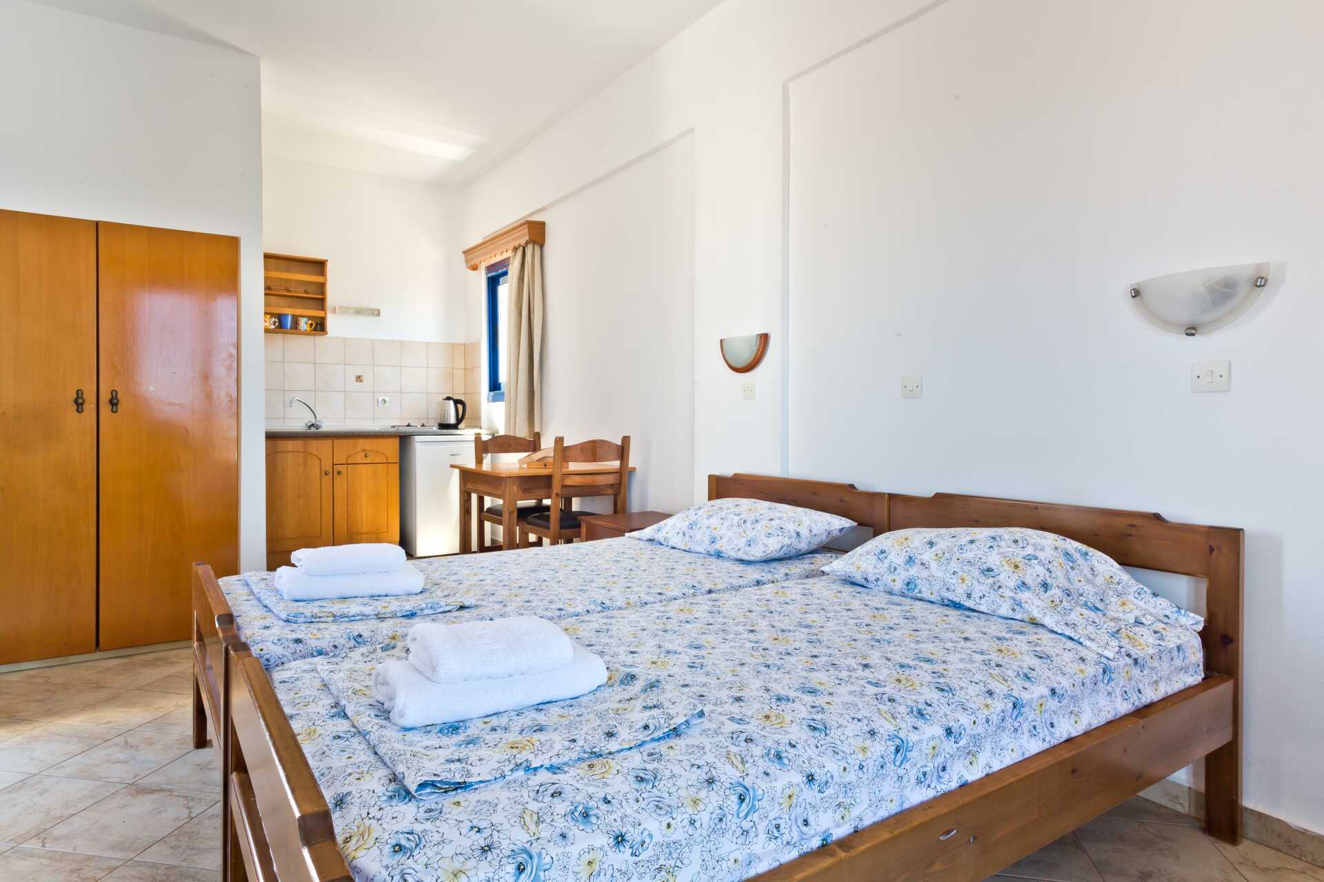 Enrumslägenheter med balkong och havsutsikt. Sovrum kombinerat med minikök. Två enkelsängar. Möjlighet till extrabädd i enkelsäng i vissa rum. Minikök med kylskåp, kokplattor, kaffebryggare, vattenkokare och enkel köksutrustning. Wifi ingår. Luftkonditionering och deponering mot avgift. Badrum med dusch och wc. Städning 6 ggr/vecka.
